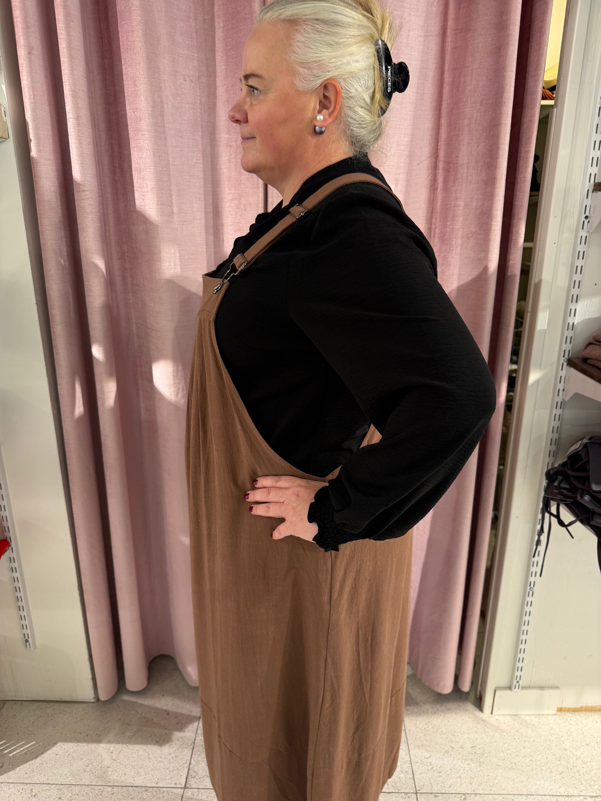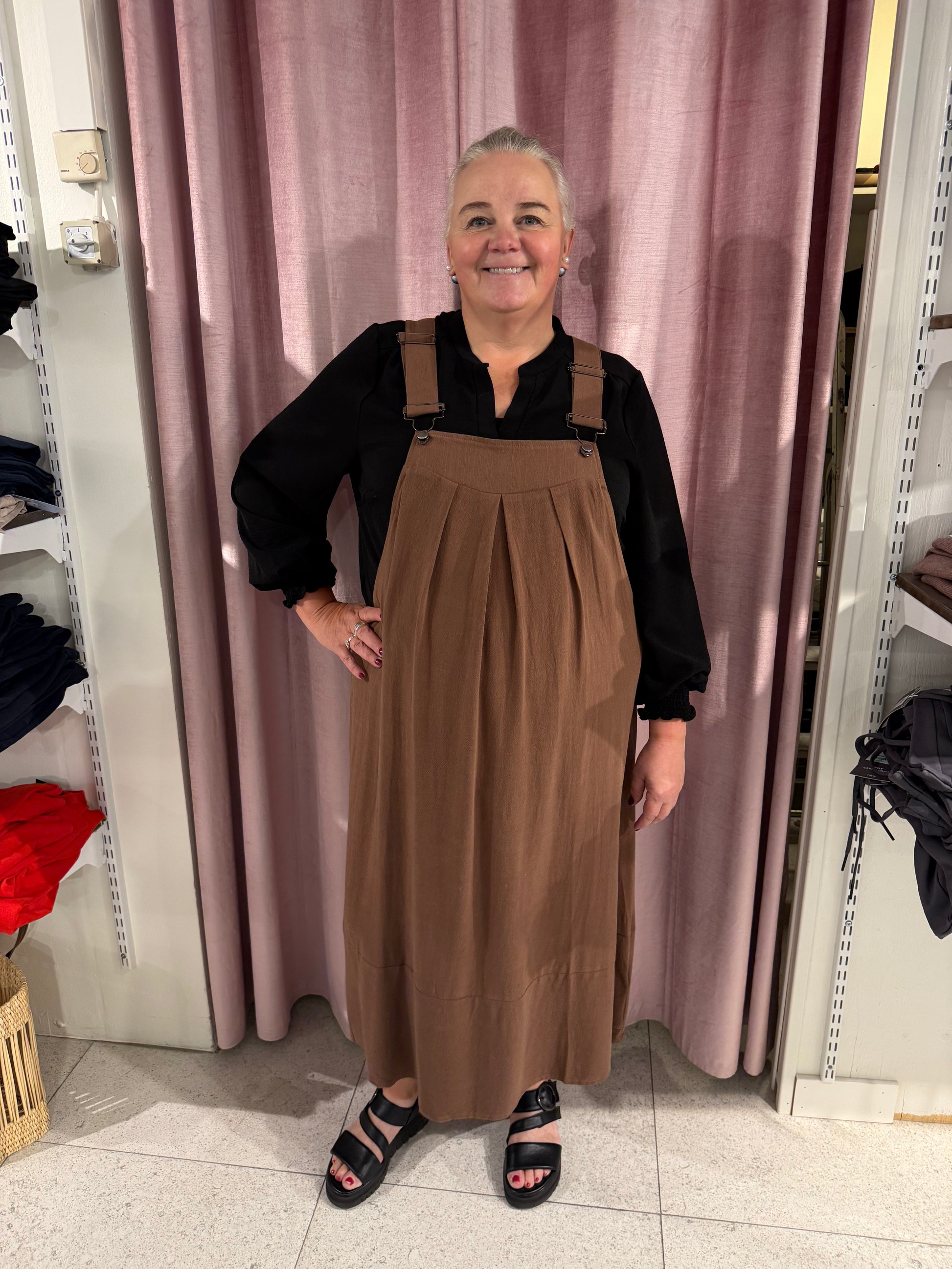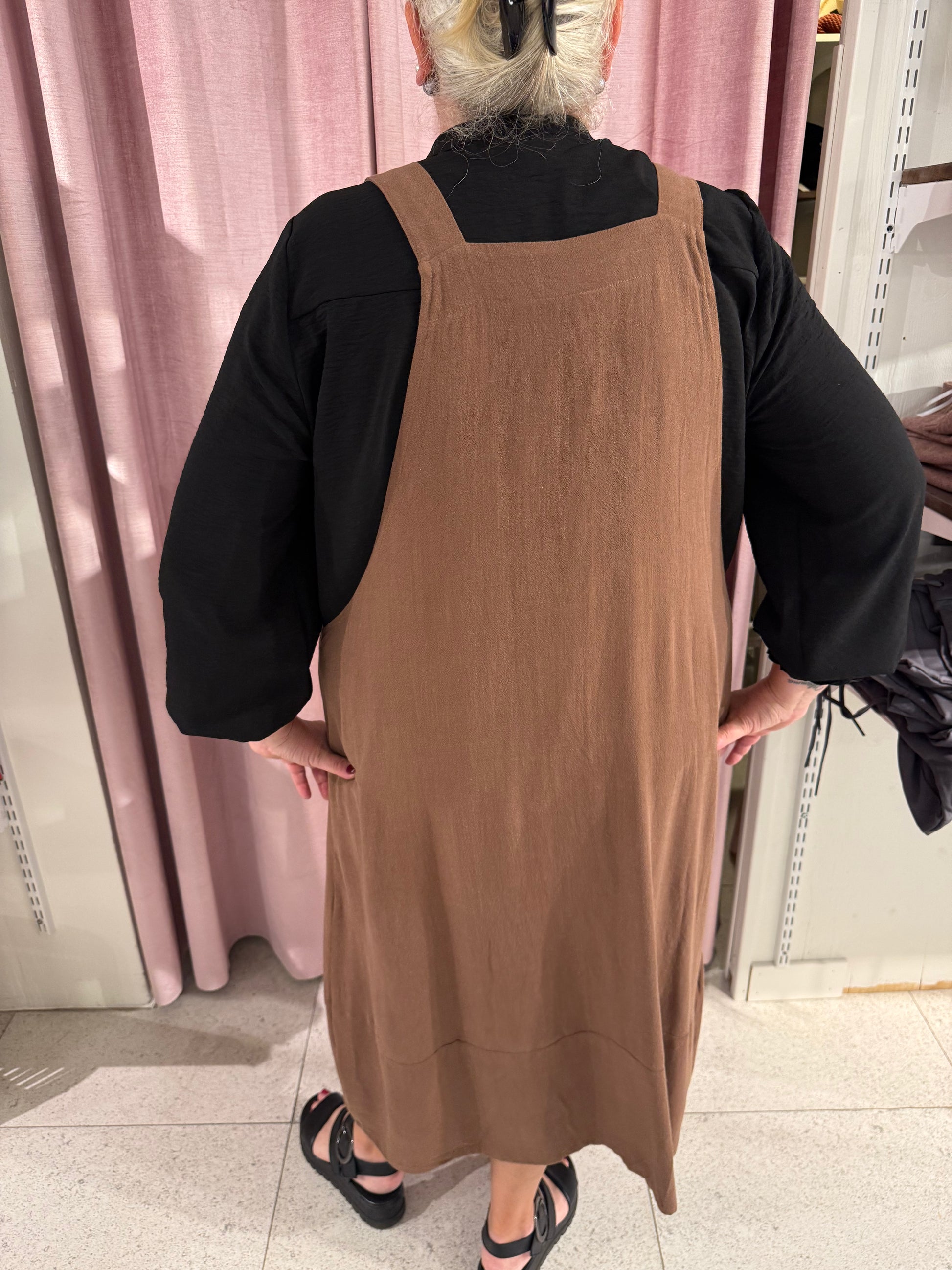 Snygg enfärgad hängselklänning i viskos-linneblandning. Modellen har breda justerbara axelband som knäpps framtill.