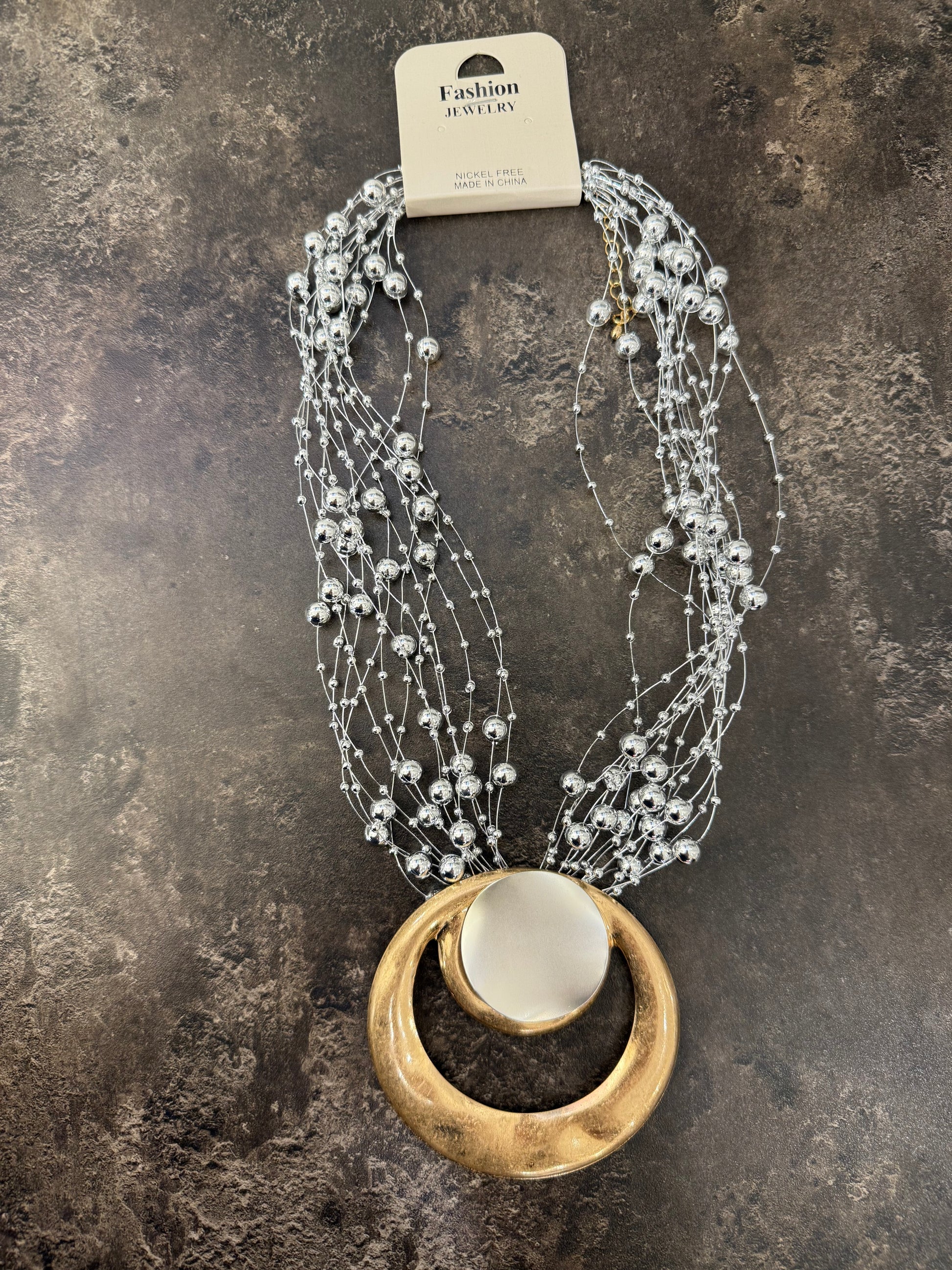 Ett elegant halsband med silver trådar och så är det ett stort guld spänne framtill som ger en snygg detalj. Det är knäppning baktill så du kan justera längden.