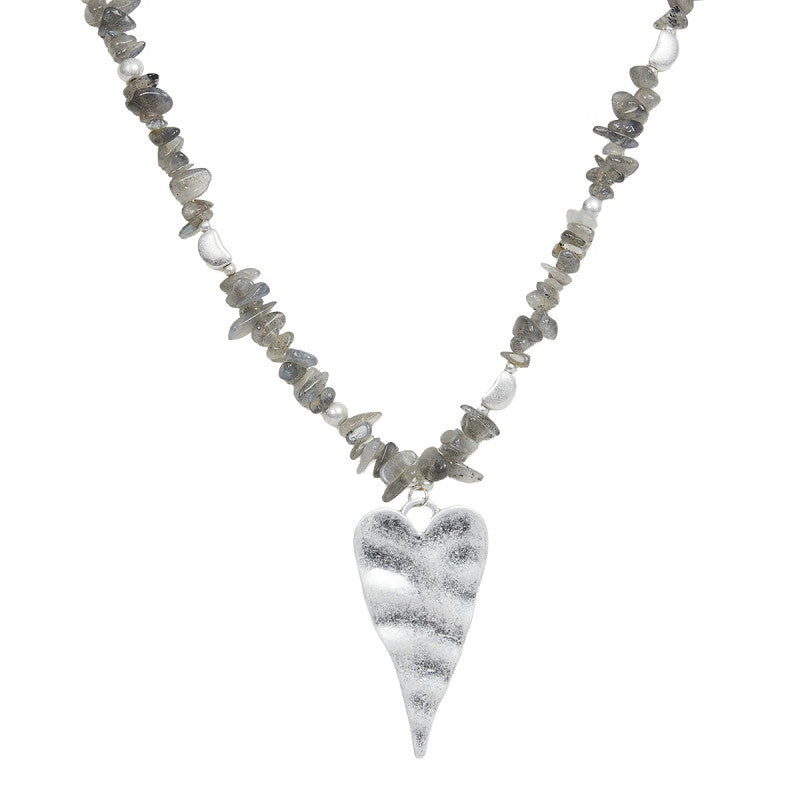 Långt halsband med silvriga pärlor, i slutet av halsbandet är det ett ''bankat'' hjärta
