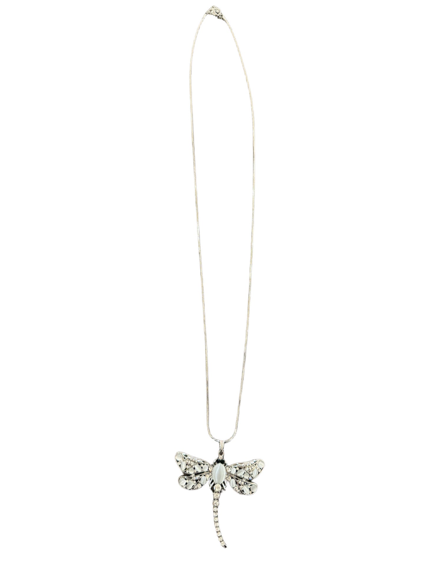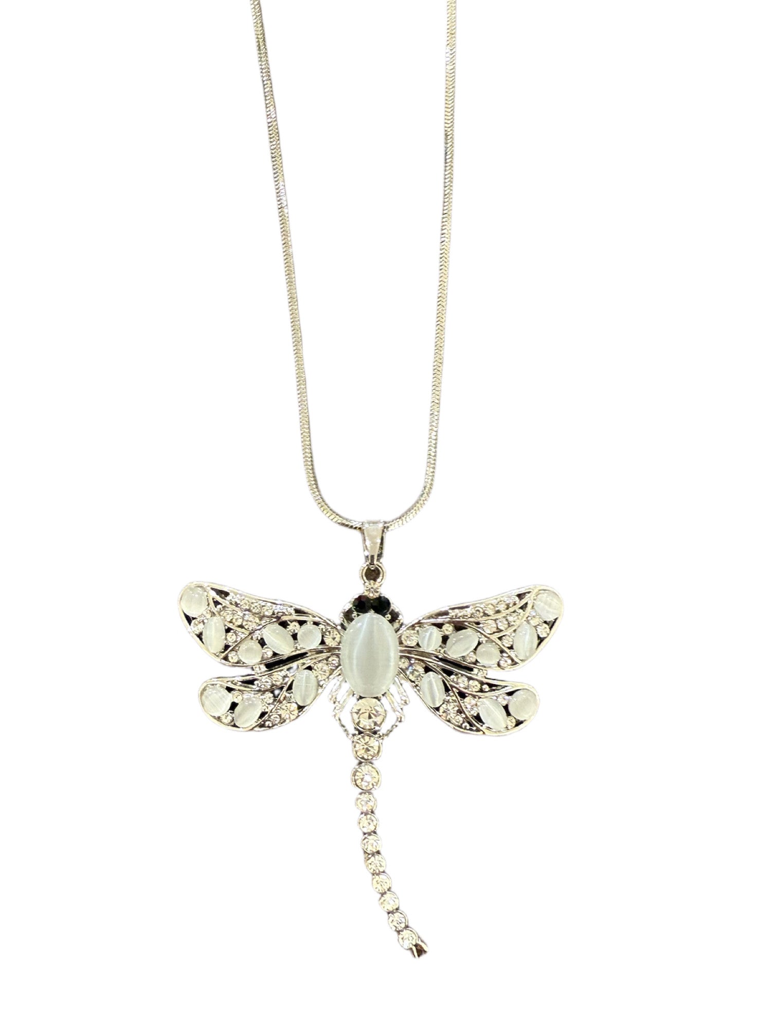 Ett iögonfallande halsband med en vackert detaljerad trollslända i silverton, dekorerad med gnistrande stenar. En feminin statement-accessoar som lyfter vilken outfit som helst och ger en känsla av både elegans och personlighet.