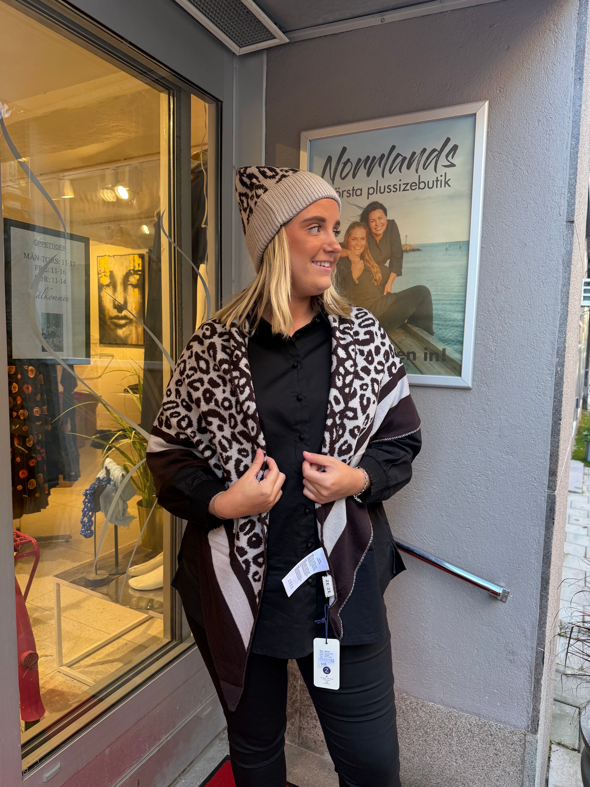 En skön halsduk som du både kan bära på axlarna eller som en halsduk, det är mörkbrun botten med leopard print.