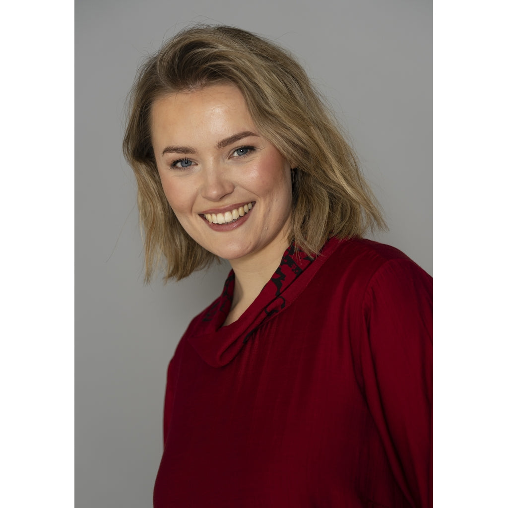 En elegant klänning med en hög halsringning som ger tyget extra fall och rörelsefrihet. Den lösa passformen gör klänningen bekväm och smickrande, medan de djupa färgvariationerna ger ett distinkt och sofistikerat uttryck, perfekt för både vardag och speciella tillfällen.