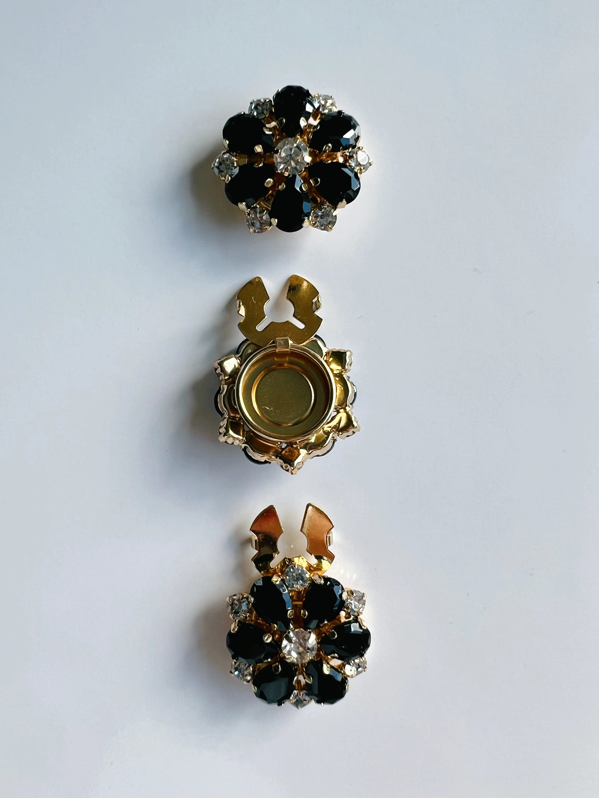6 st blomformade knappsmycken med guldfärgat underrede, glittrande stenar som bildar en blomma. Klicka fast den på en vanlig knapp på max 13 mm.