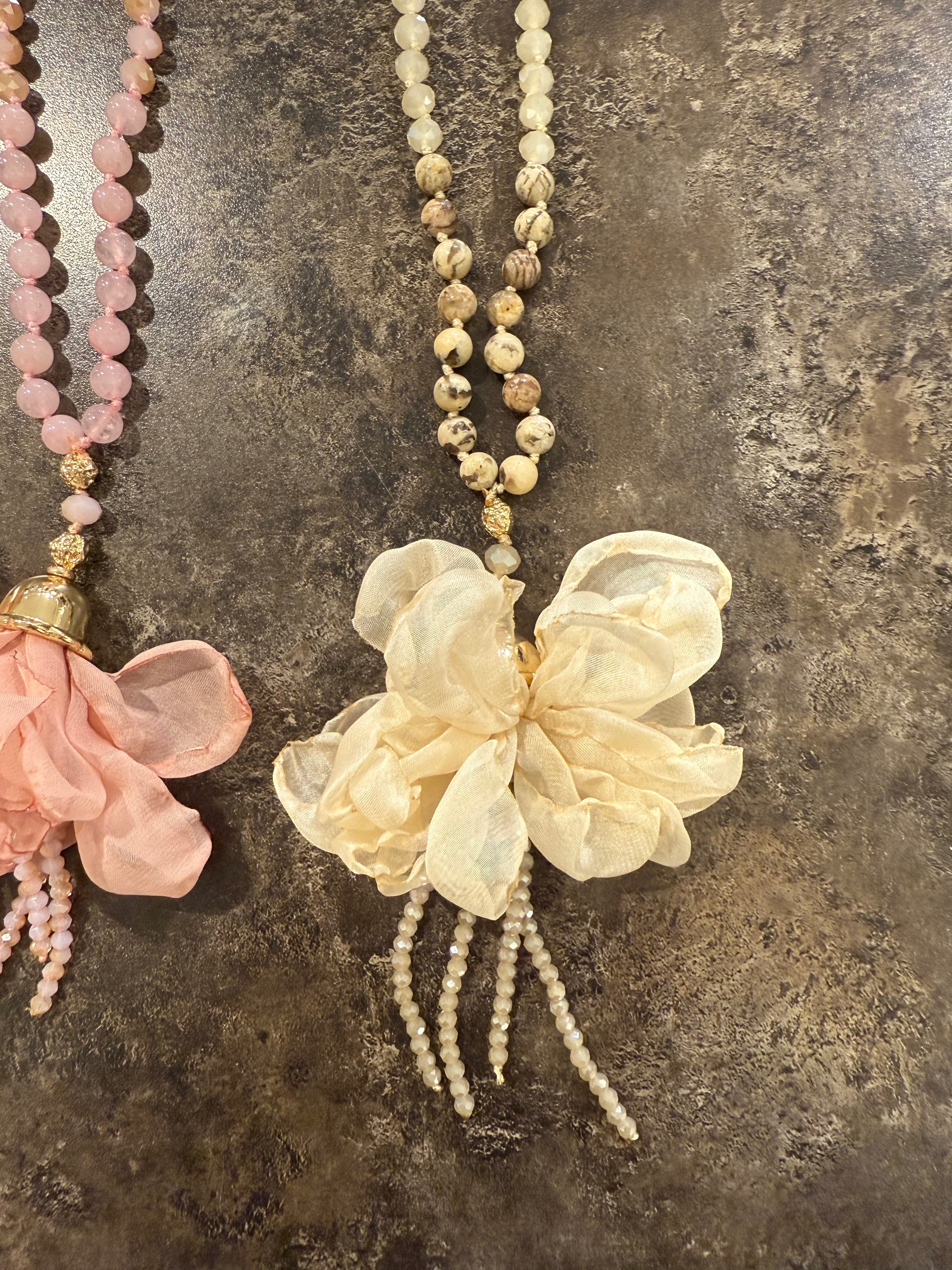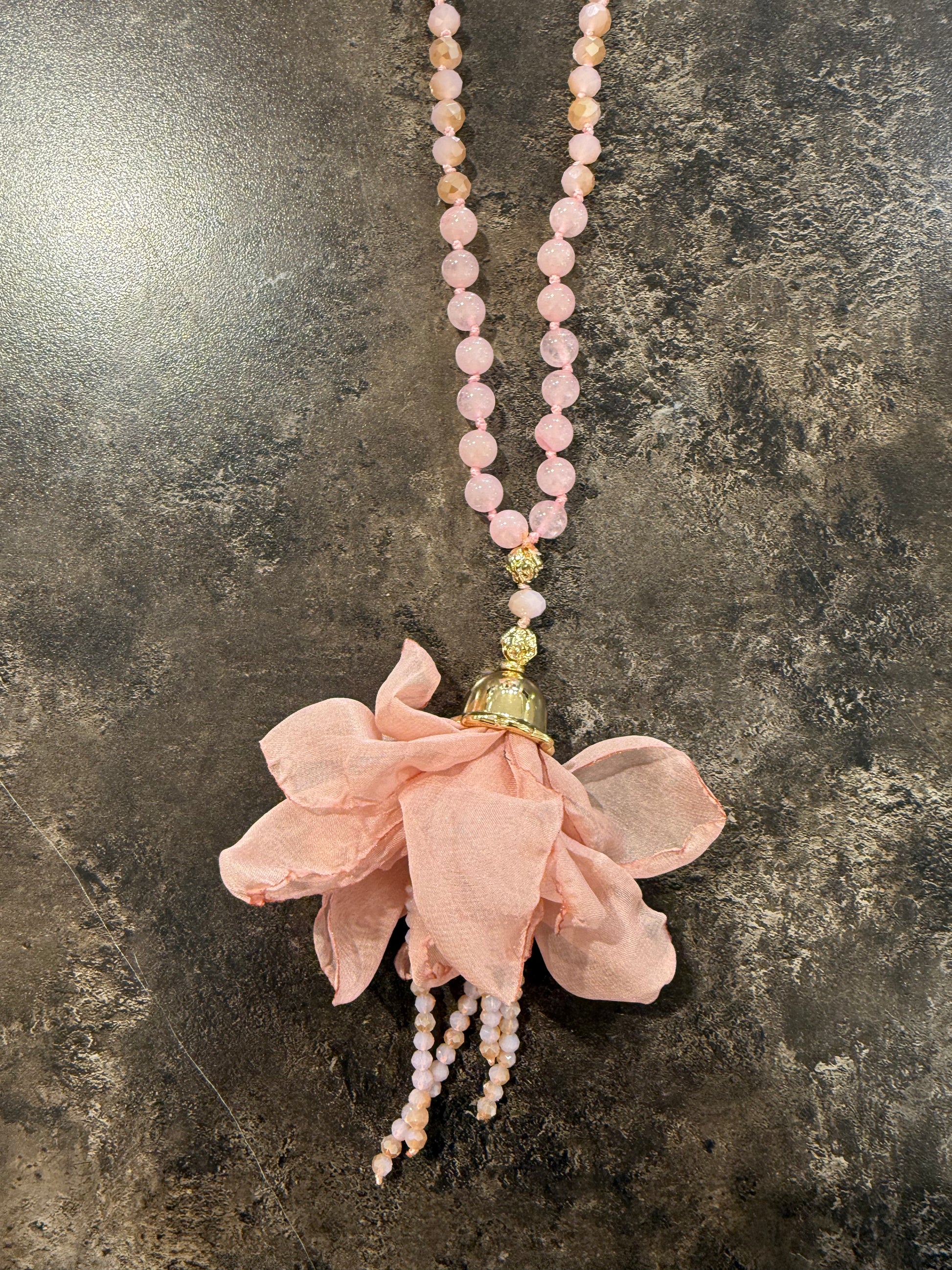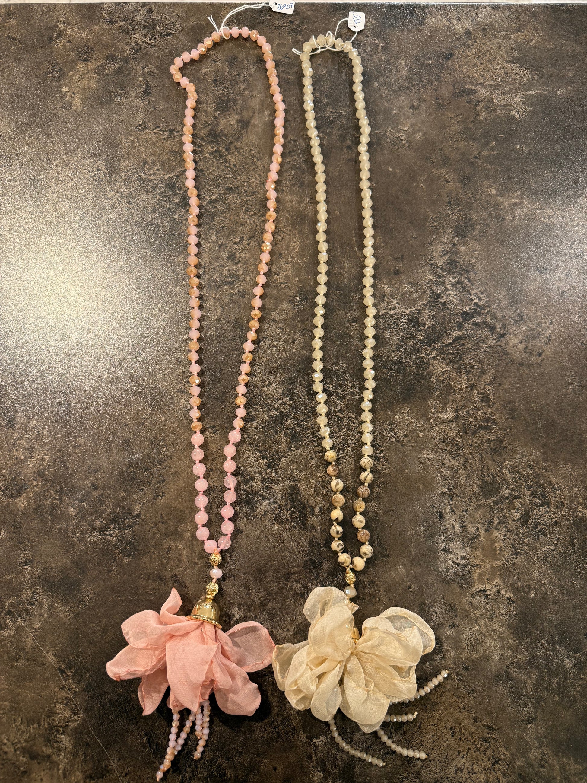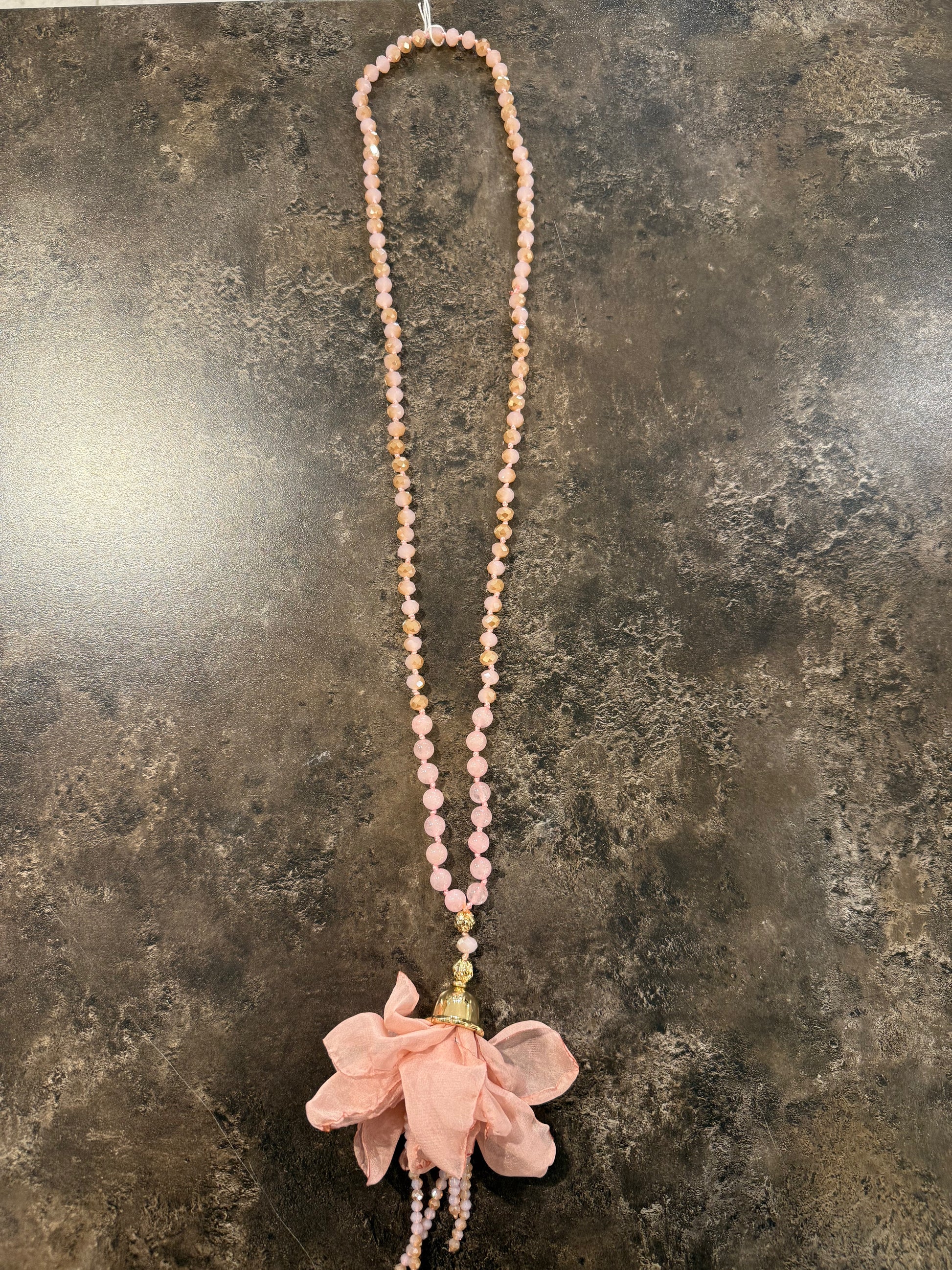 Långt halsband med pärlor, i slutet av halsbandet är det en ''blomma'' i tyg.