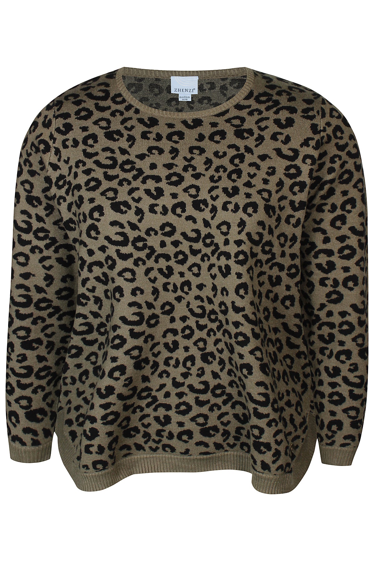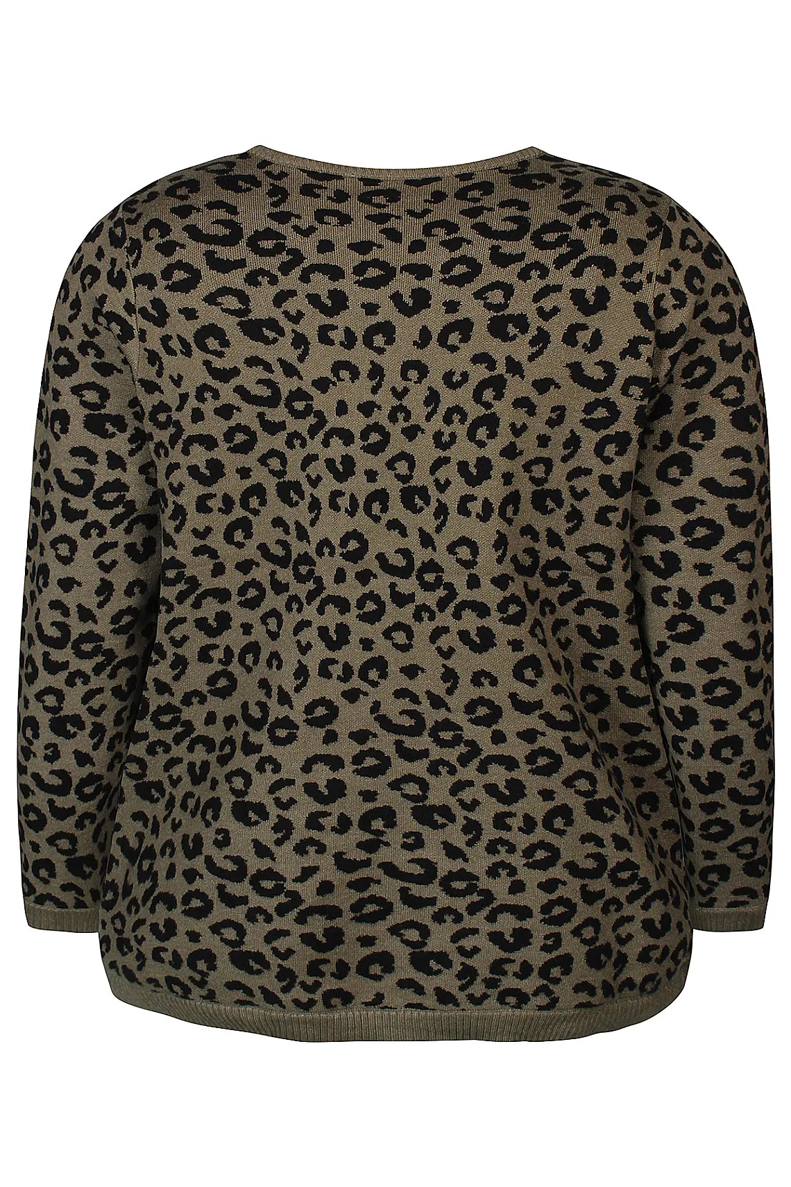 En skön tunn stickad tröja med rundad hals och långa ärmar, det är grön botten med leopard print.