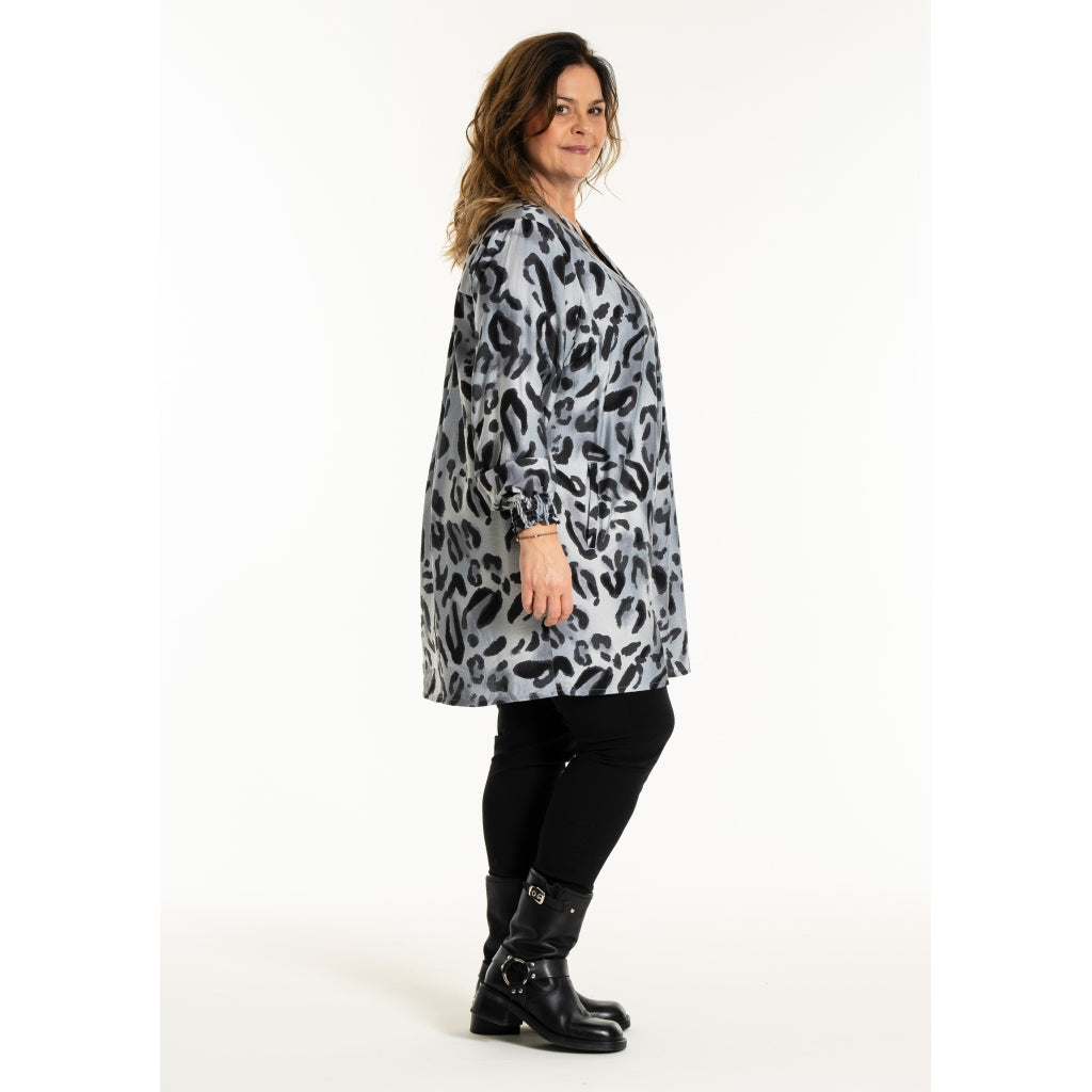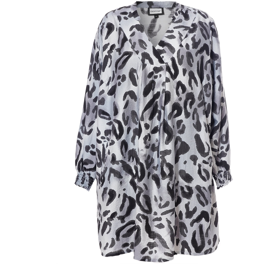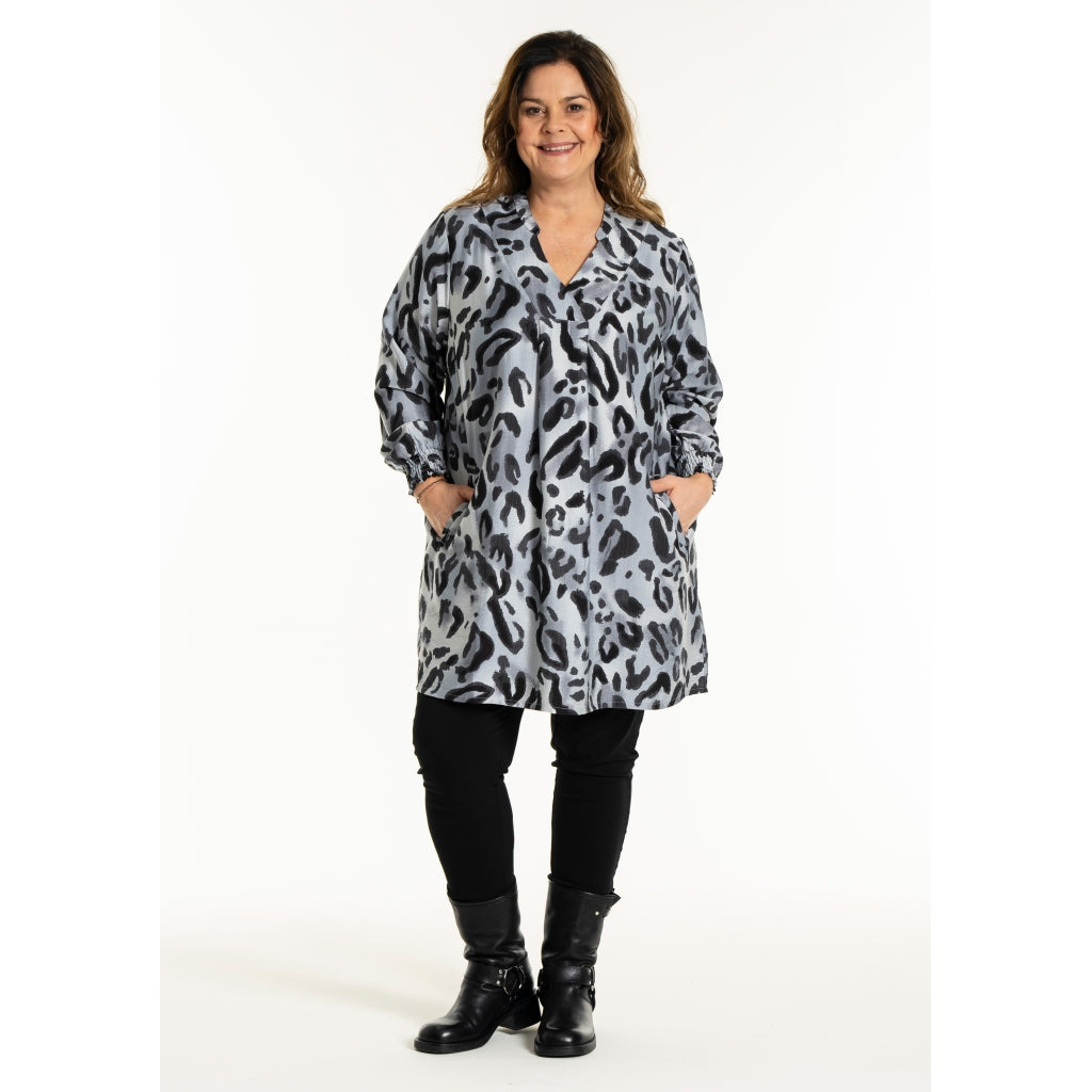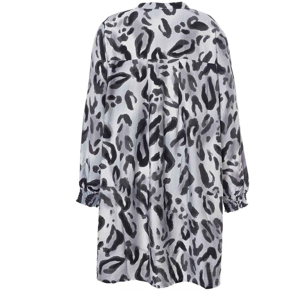 Snygg klänning med grått leopardmönster tillverkad av viskos och nylon.