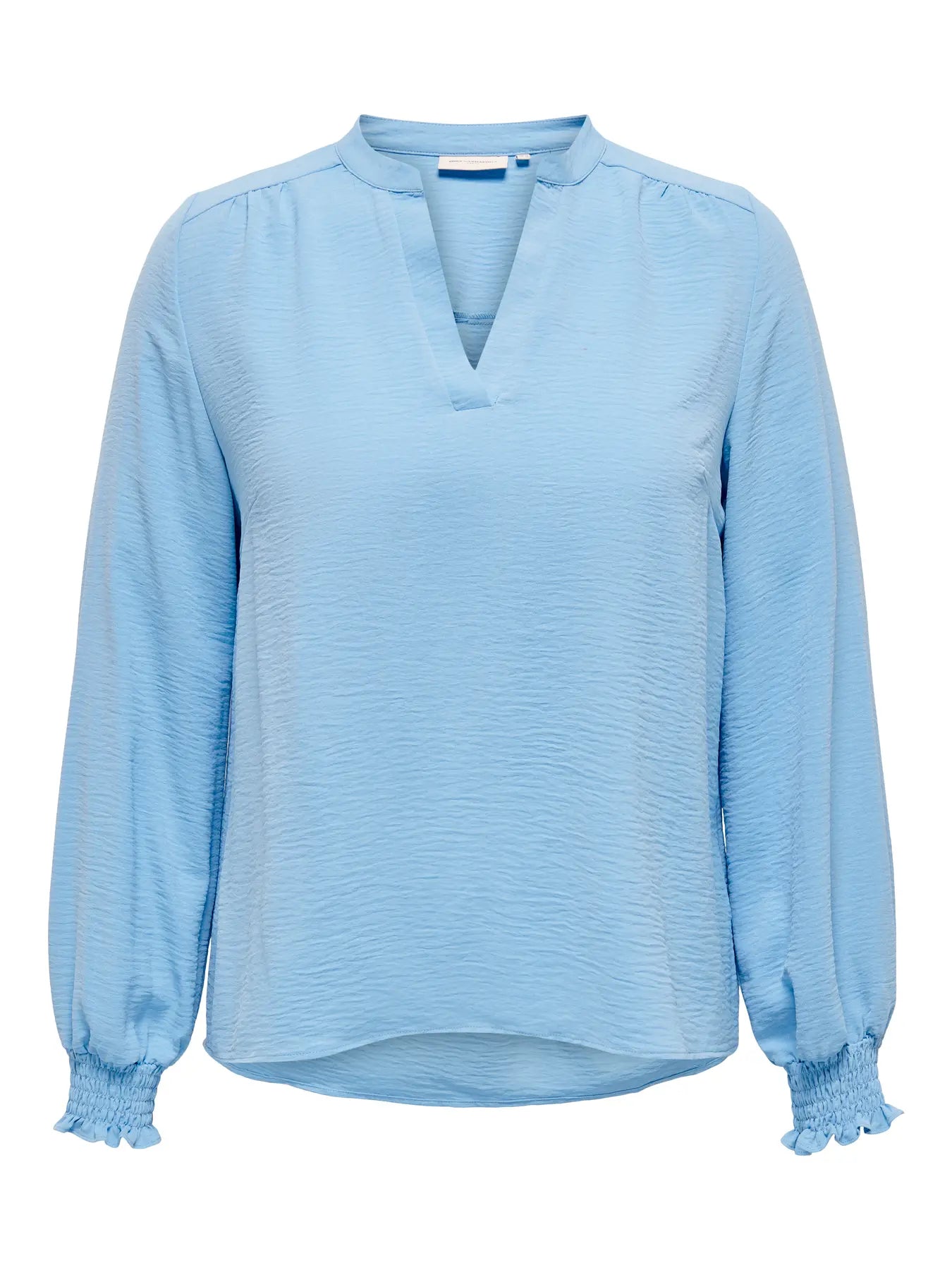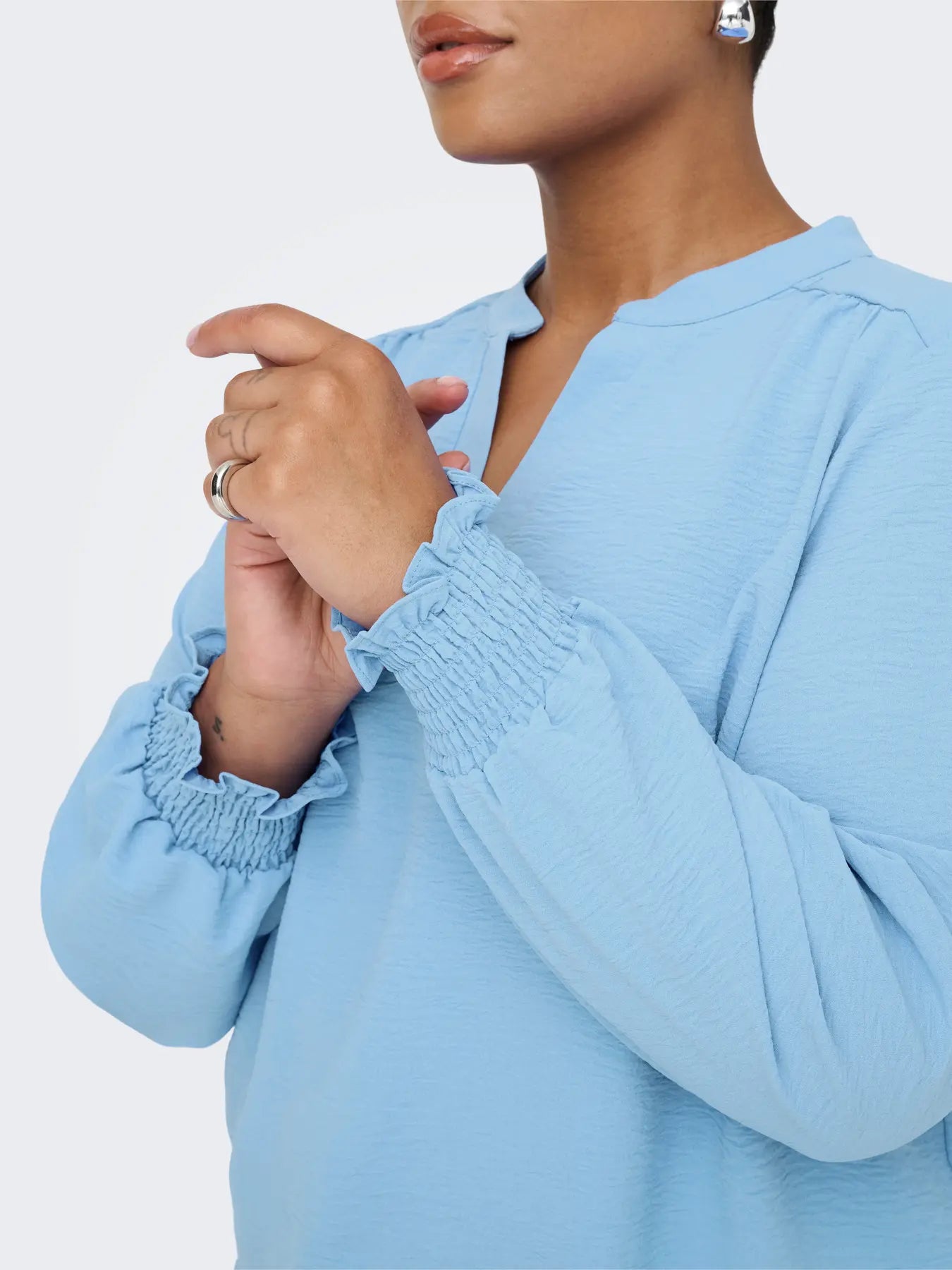 Det är v-ringad hals, långa ärmar med en bred smock i ärmslutet.