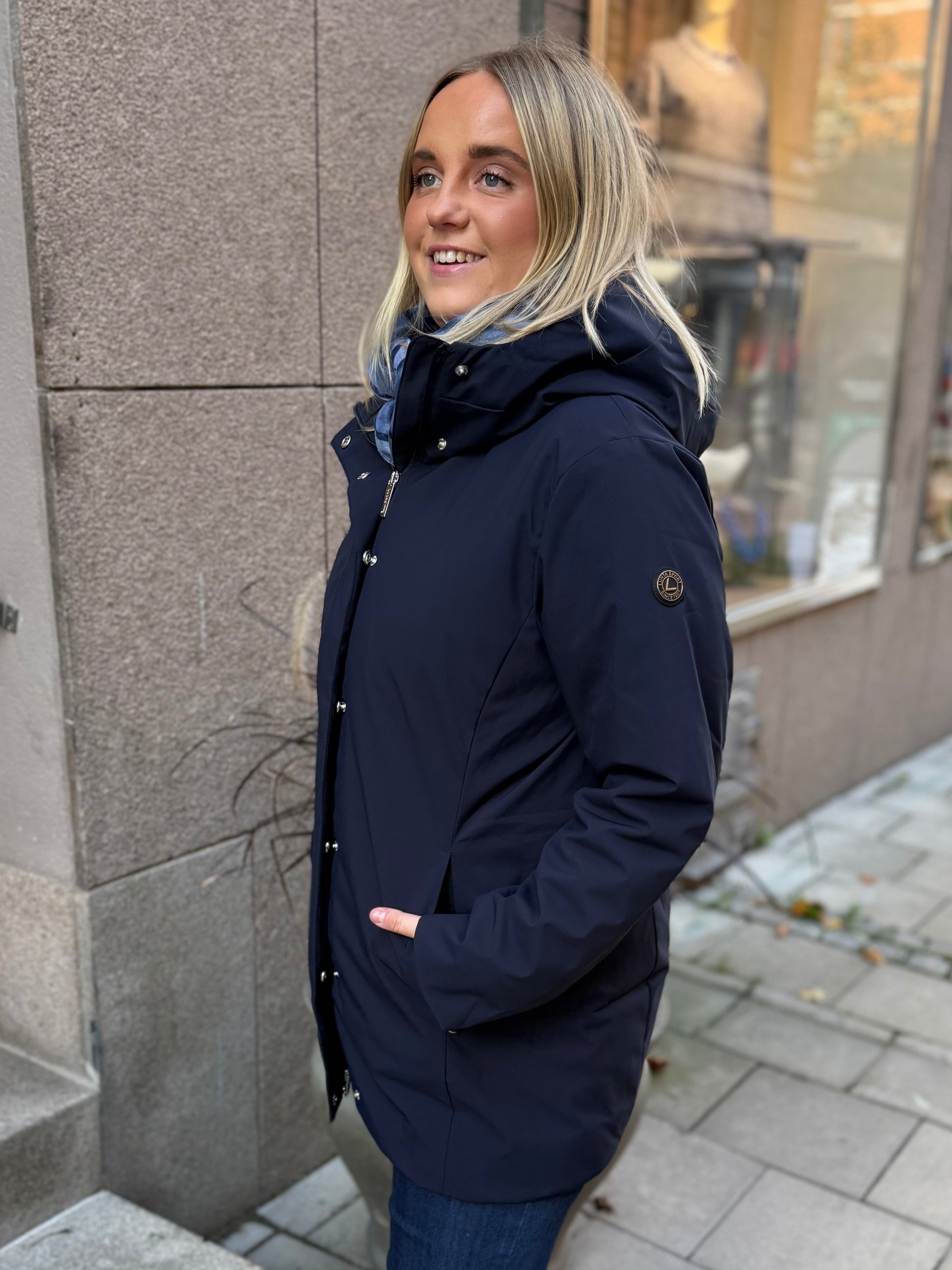 En snygg marinblå täckjacka i en kortare modell, den har en luva som är ej avtagbar och dubbel dragkedja. Denna passar både som en höst & vinter jacka.