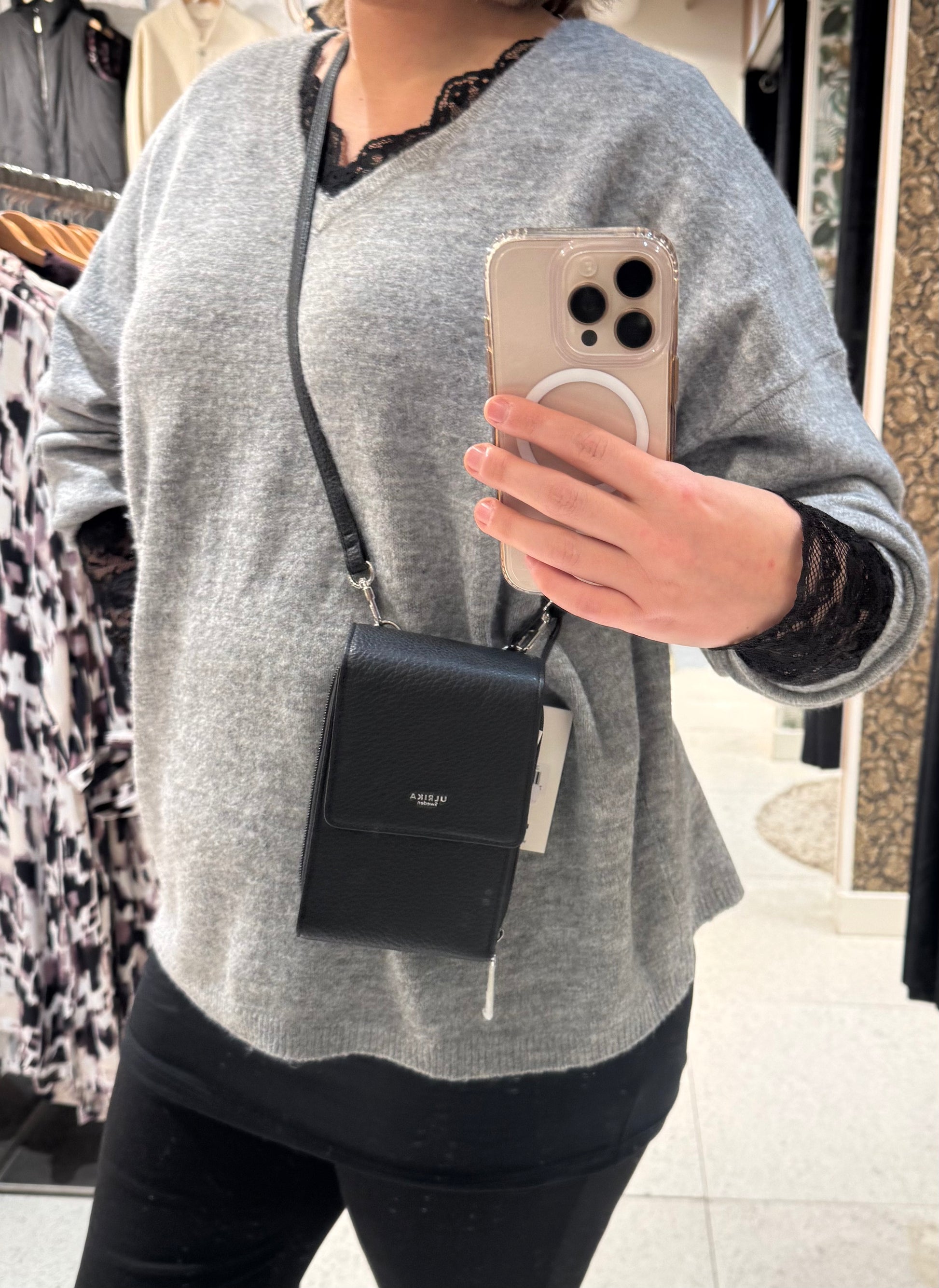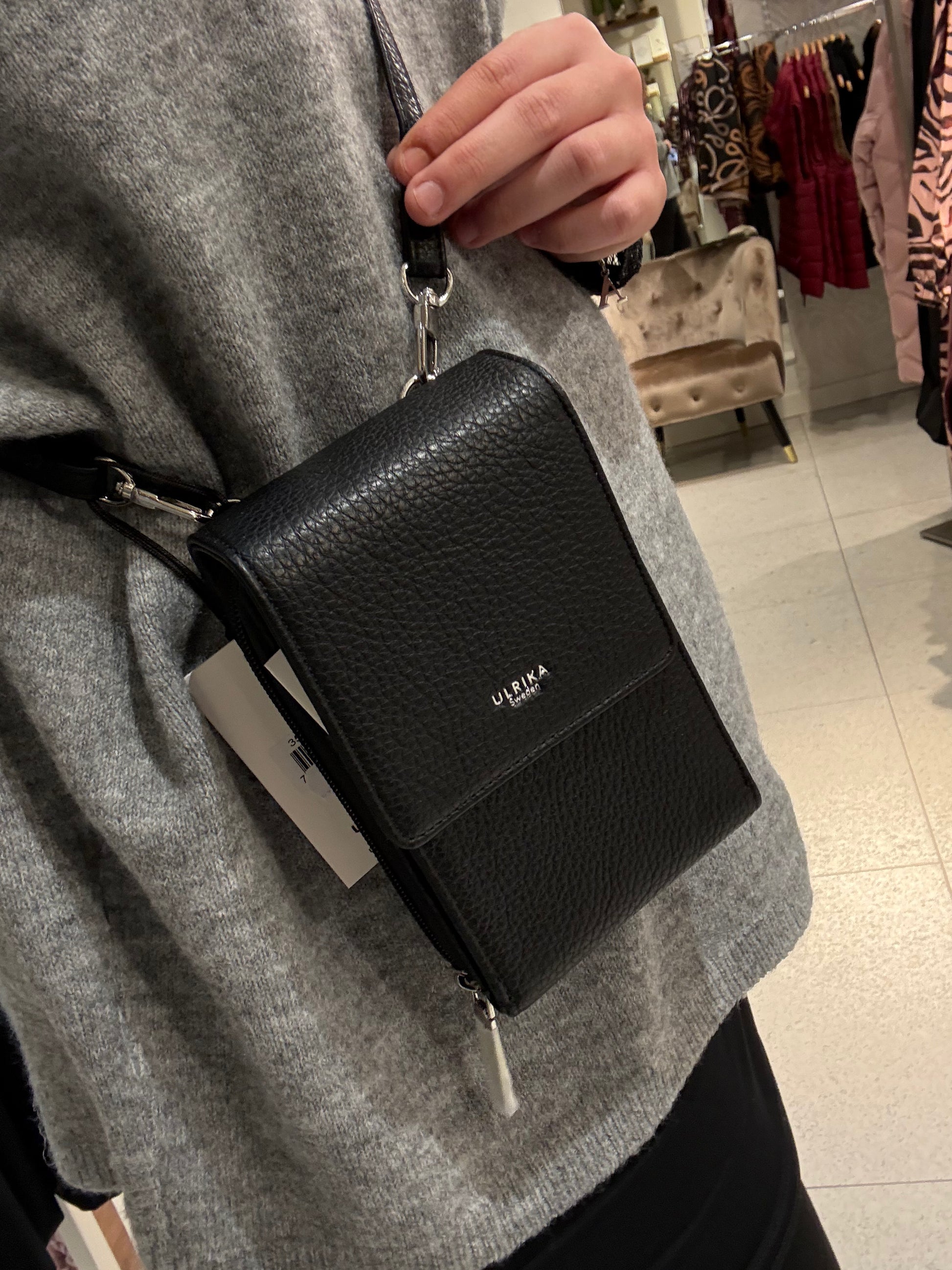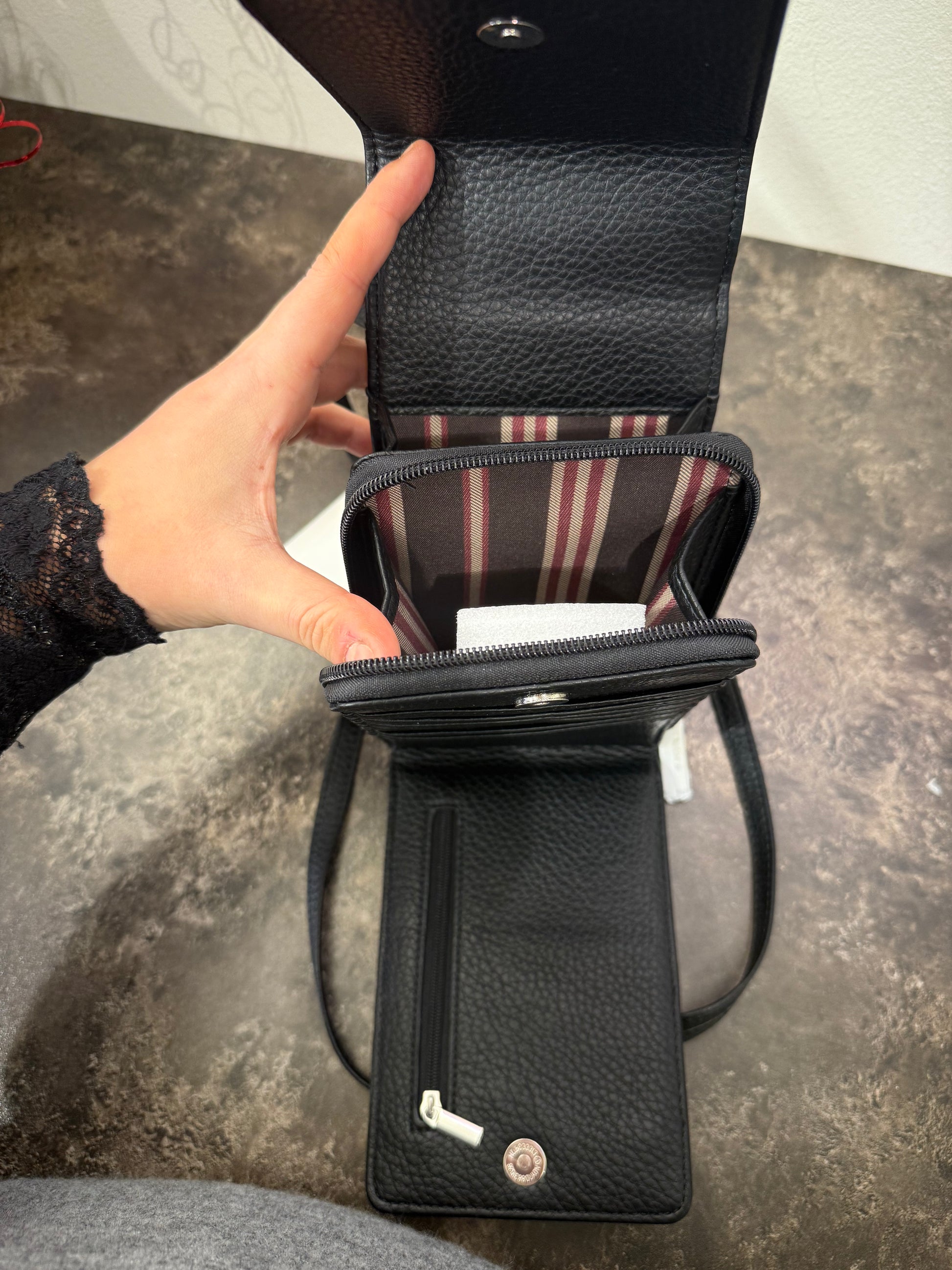 Snygg mobilväska i fusk skinn med olika fack som du får plats med saker i, det är ett justerbart axelband.