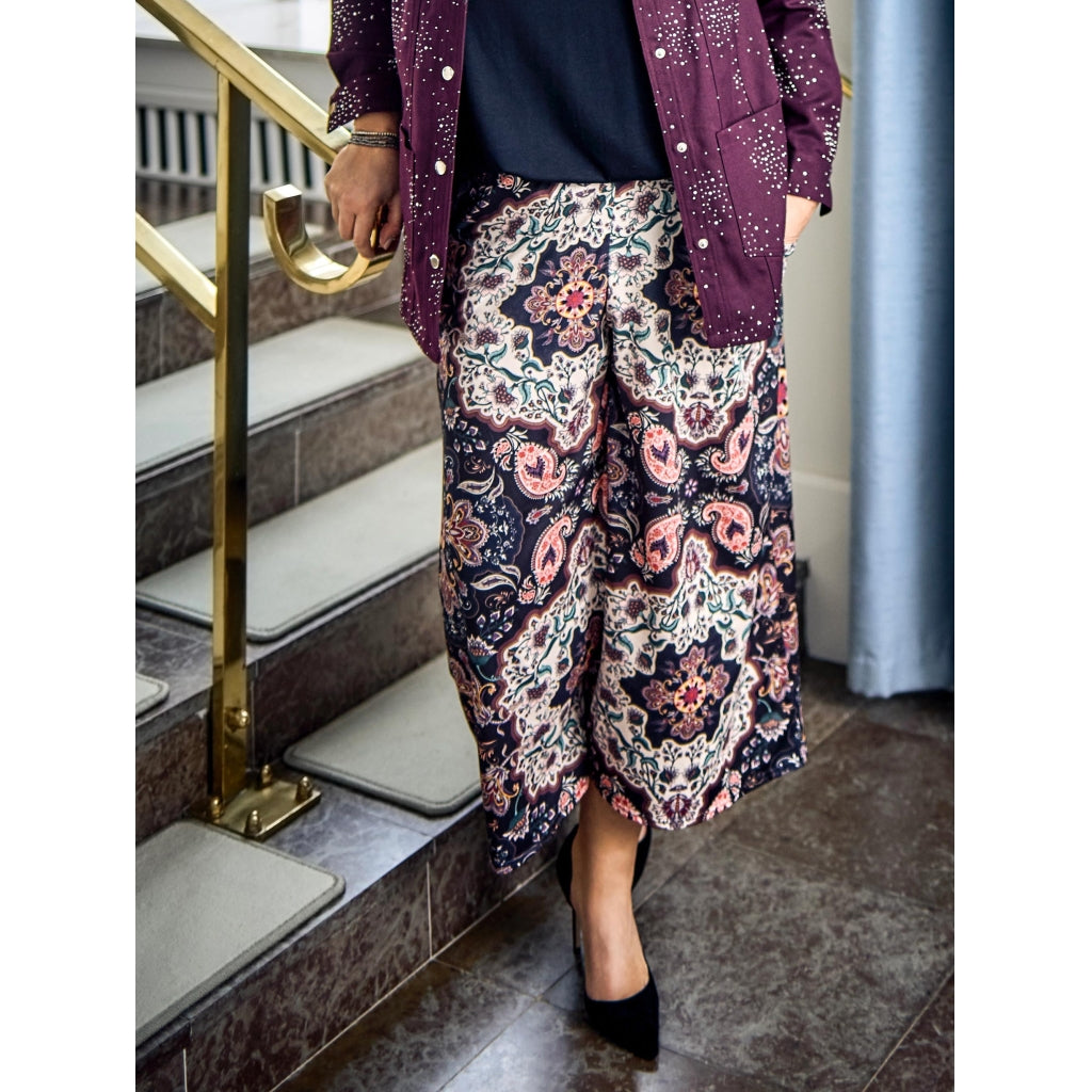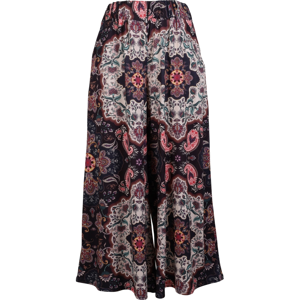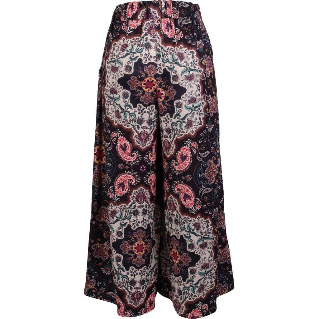 Designade med vida, böljande ben, faller de vackert för en smickrande silhuett, medan det mjuka, töjbara jerseymaterialet säkerställer komfort hela dagen, med ett djärvt, dekorativt tryck mot en mörk bakgrund, ger dessa byxor ett självsäkert uttalande, perfekt för både vardagliga och eleganta tillfällen.