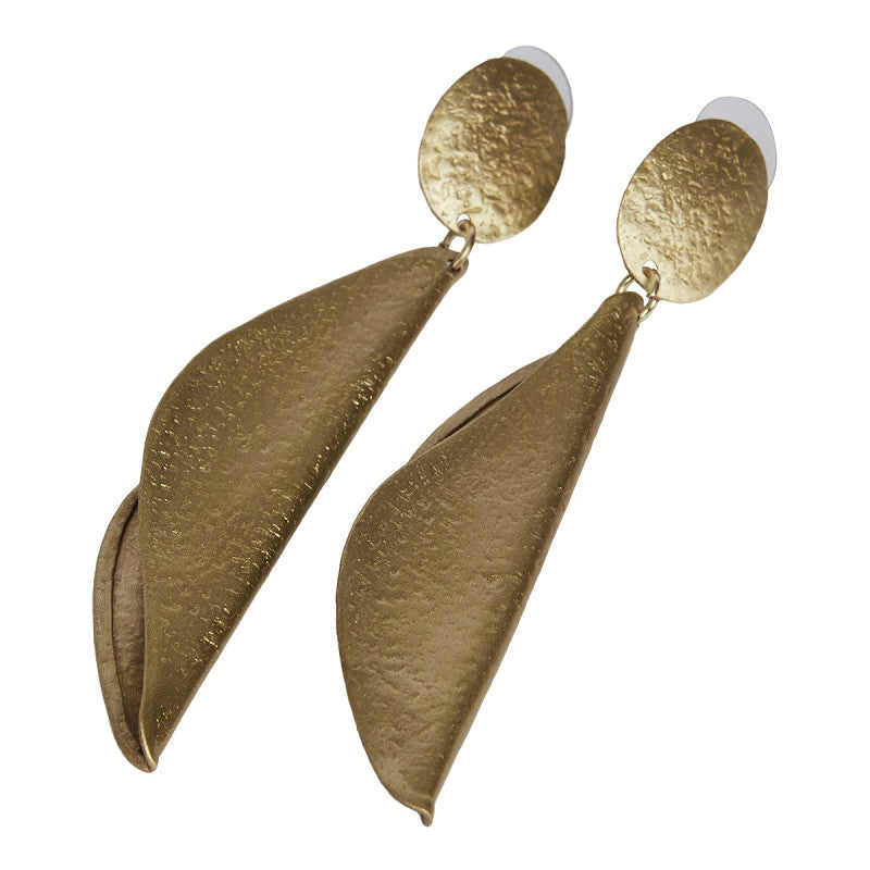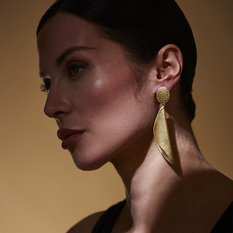 Snygga örhängen som går i guld, det är en bred platta på örat med ett löv som hänger ner.