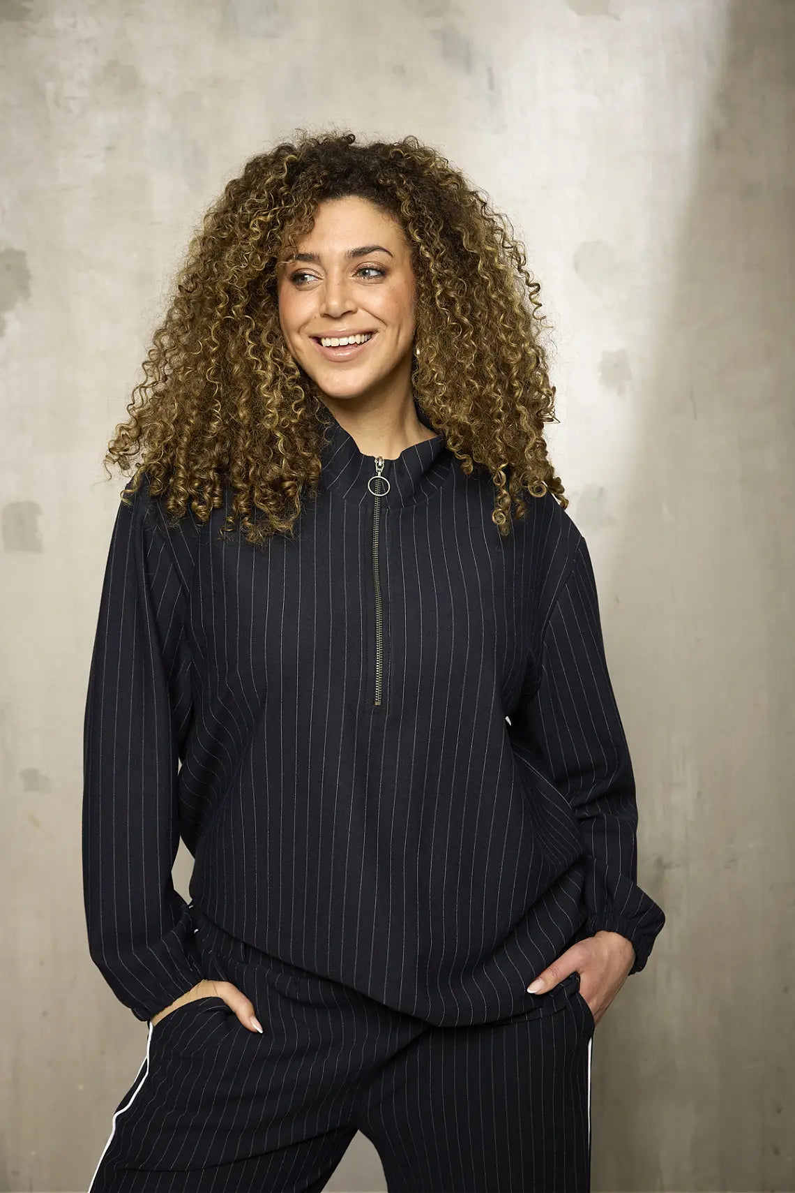 En snygg sweatshirt med marinblå botten och vita ränder, det är en dragkedja som du kan öppna upp. Snygg att bära till jeans eller marinblåa byxor.