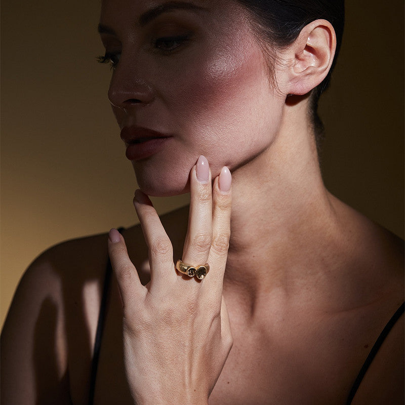 Guld färgad ring med två små gråa diamanter, det är resår runt om ringen så den passar alla fingrar.