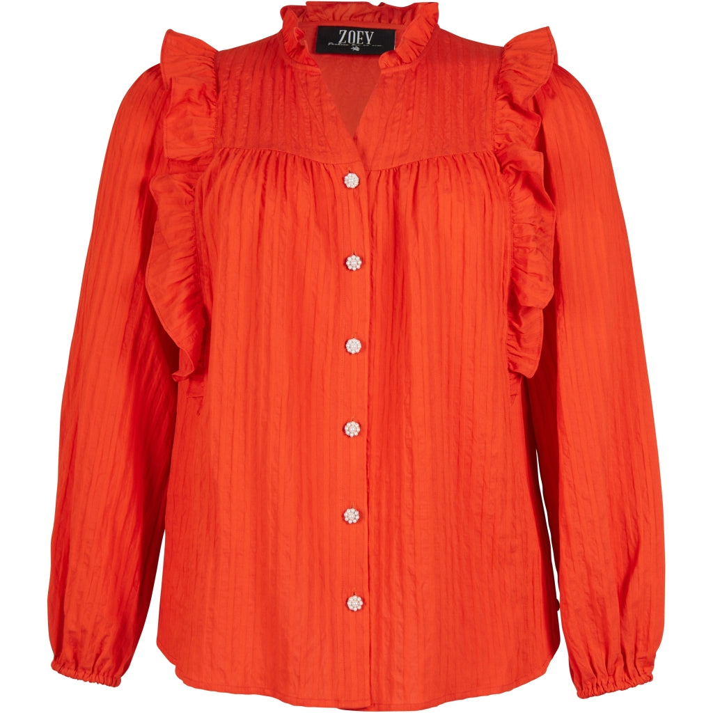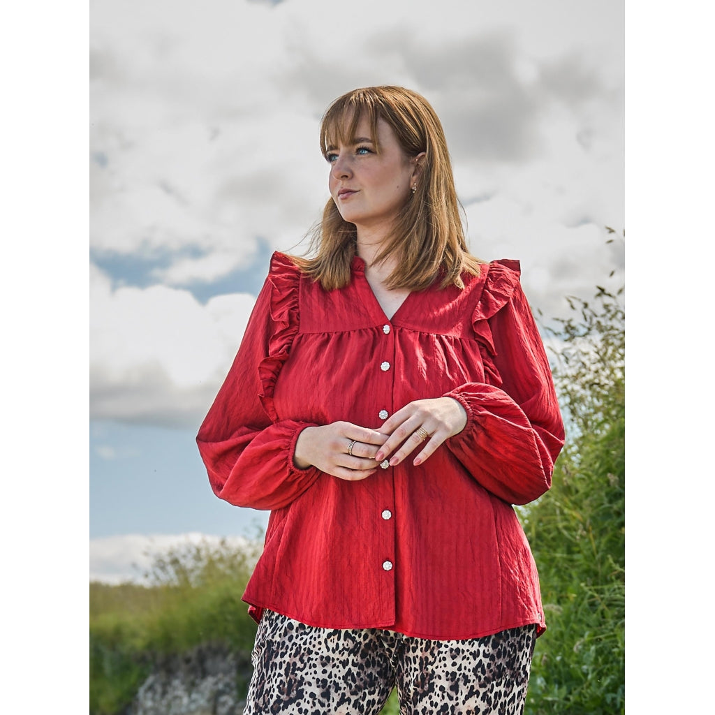 En härlig röd blus med v-ringad hals och 3/4 dels långa ärmar, framtill är eleganta pärlknappar så du både kan bära den öppen och stängd.