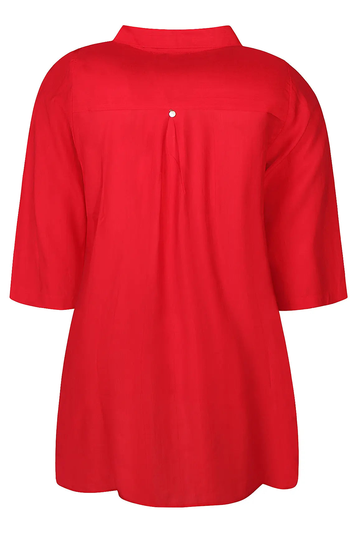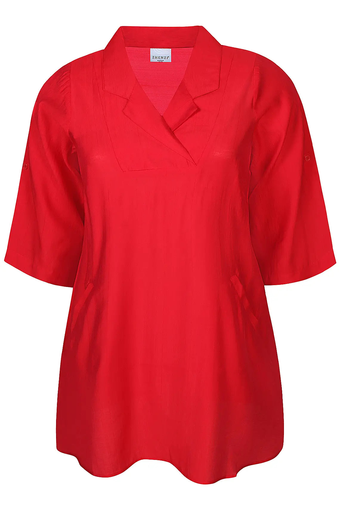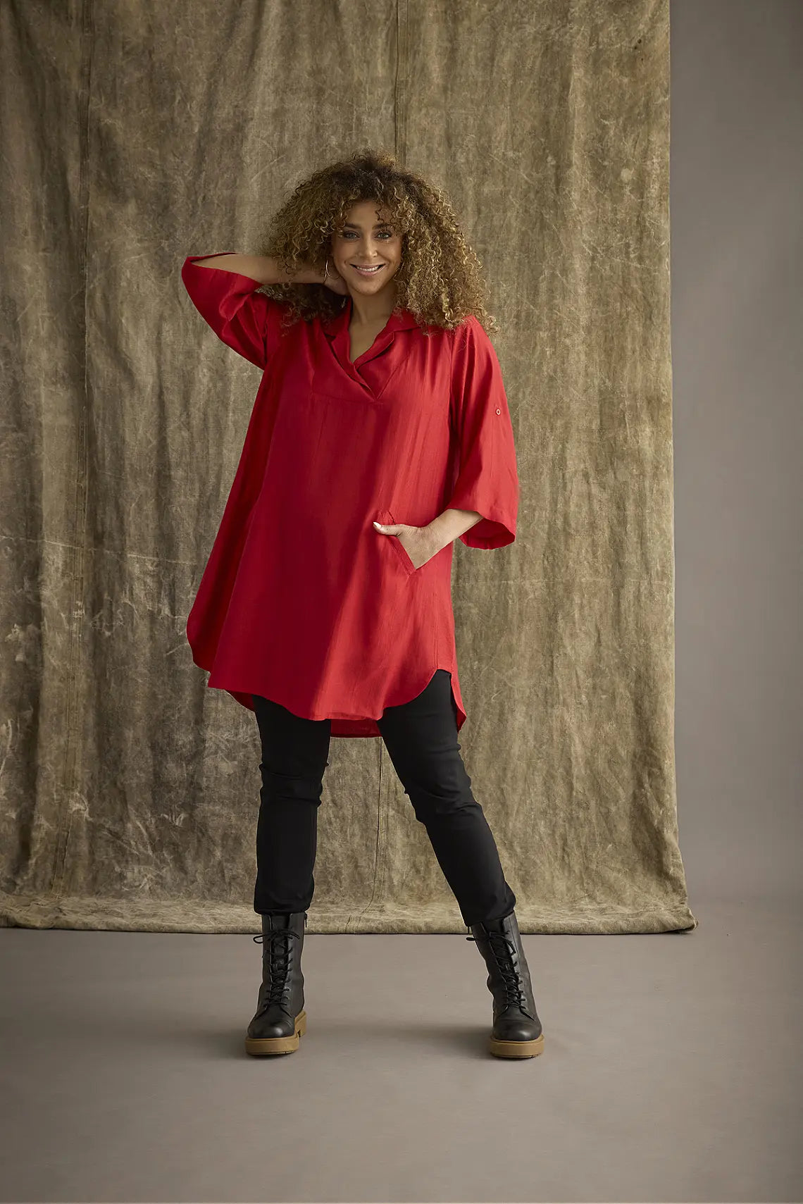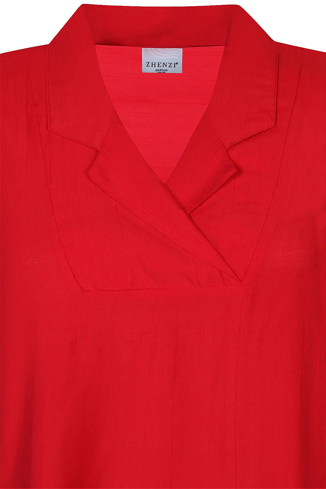 En klatschig röd tunika med v-ringad hals och skjortkrage, det är korta ärmar.