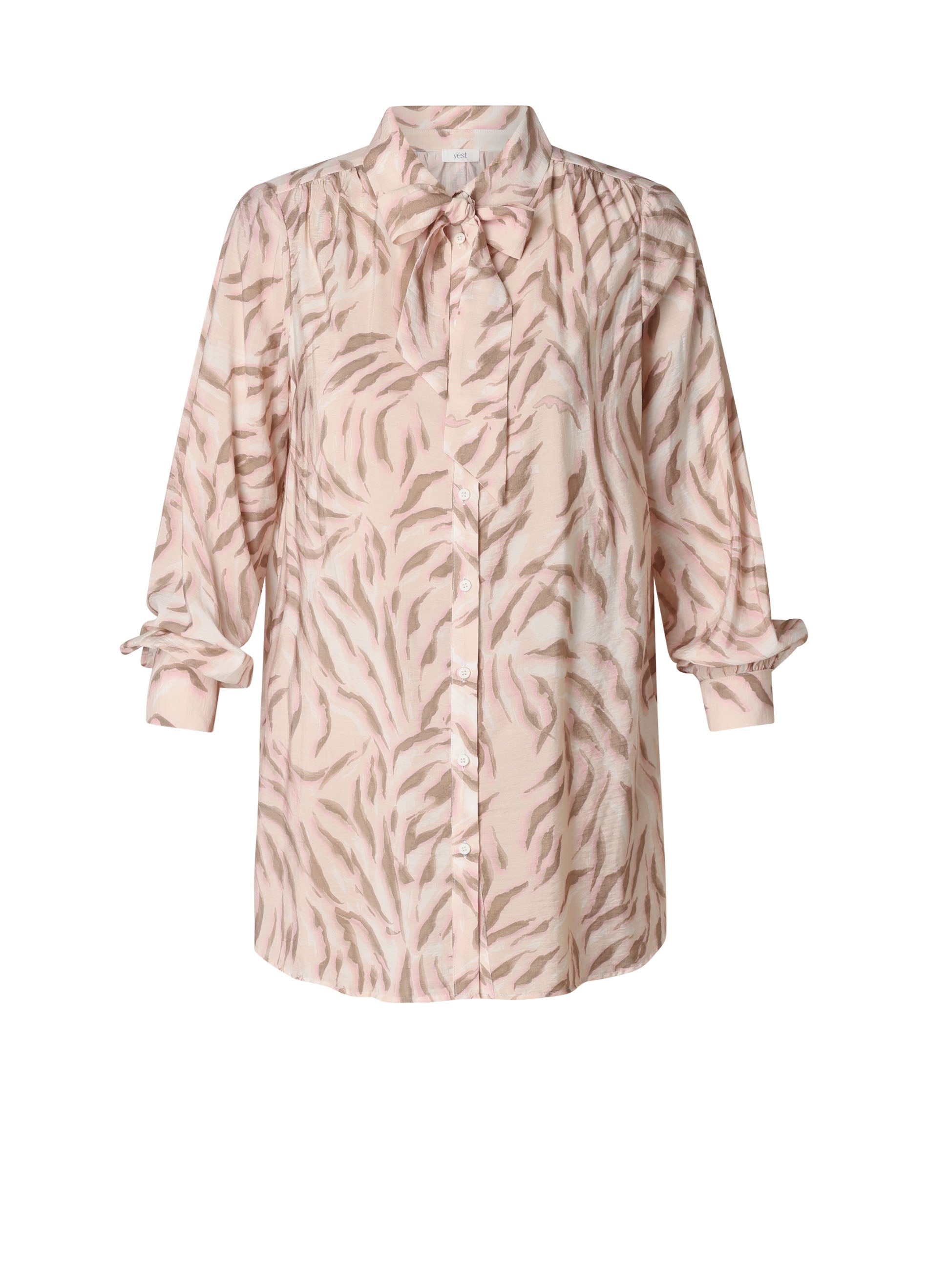 Härlig rosa mönstrad blus med knappar hela vägen så du både kan bära den öppen och stängd, det ingår ett band som du kan knyta en rosett runt halsen.