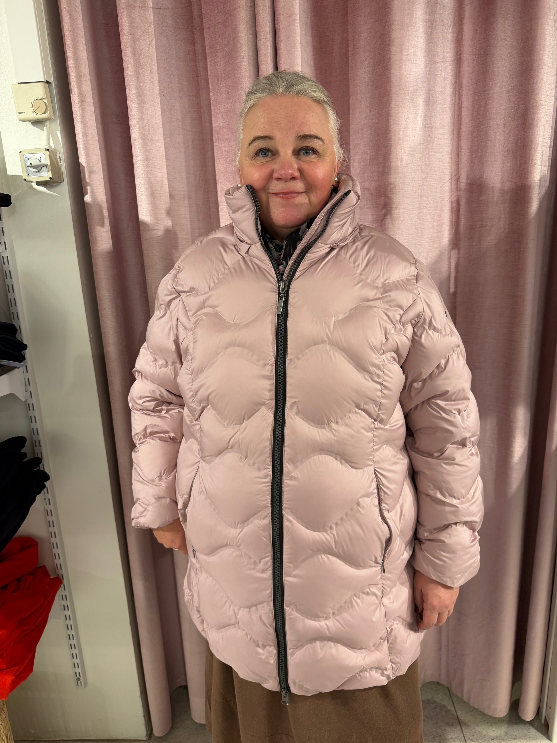 Vinterjacka som håller dig varm hela vintern, det är pudelrosa färg och känns som en dunjacka fast det är syntet.