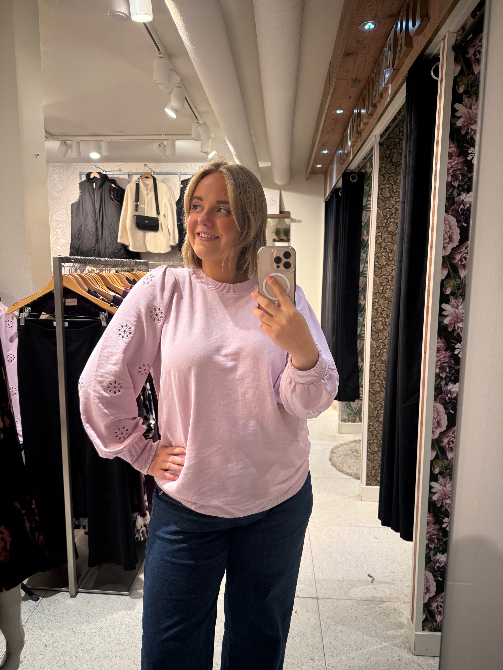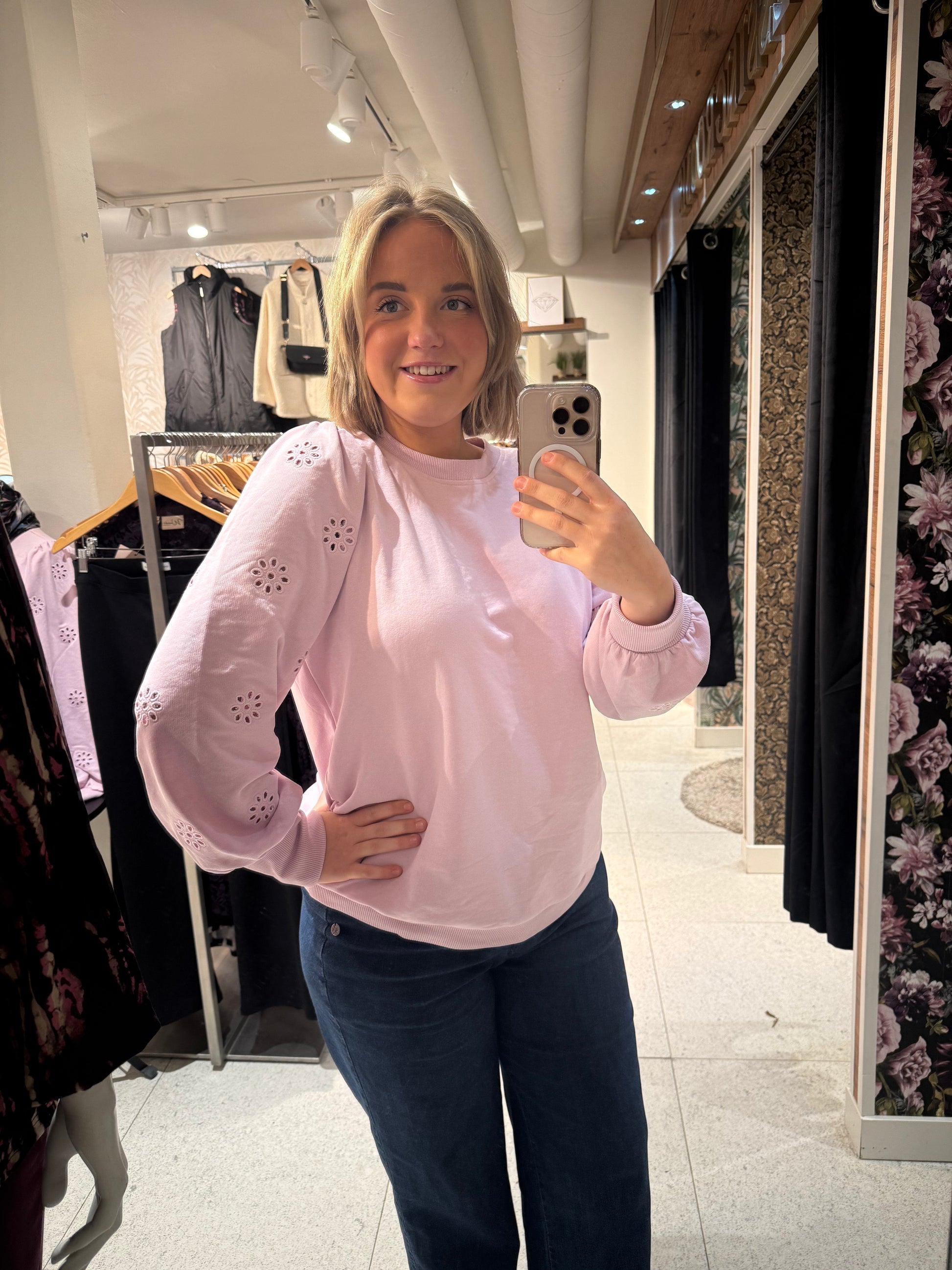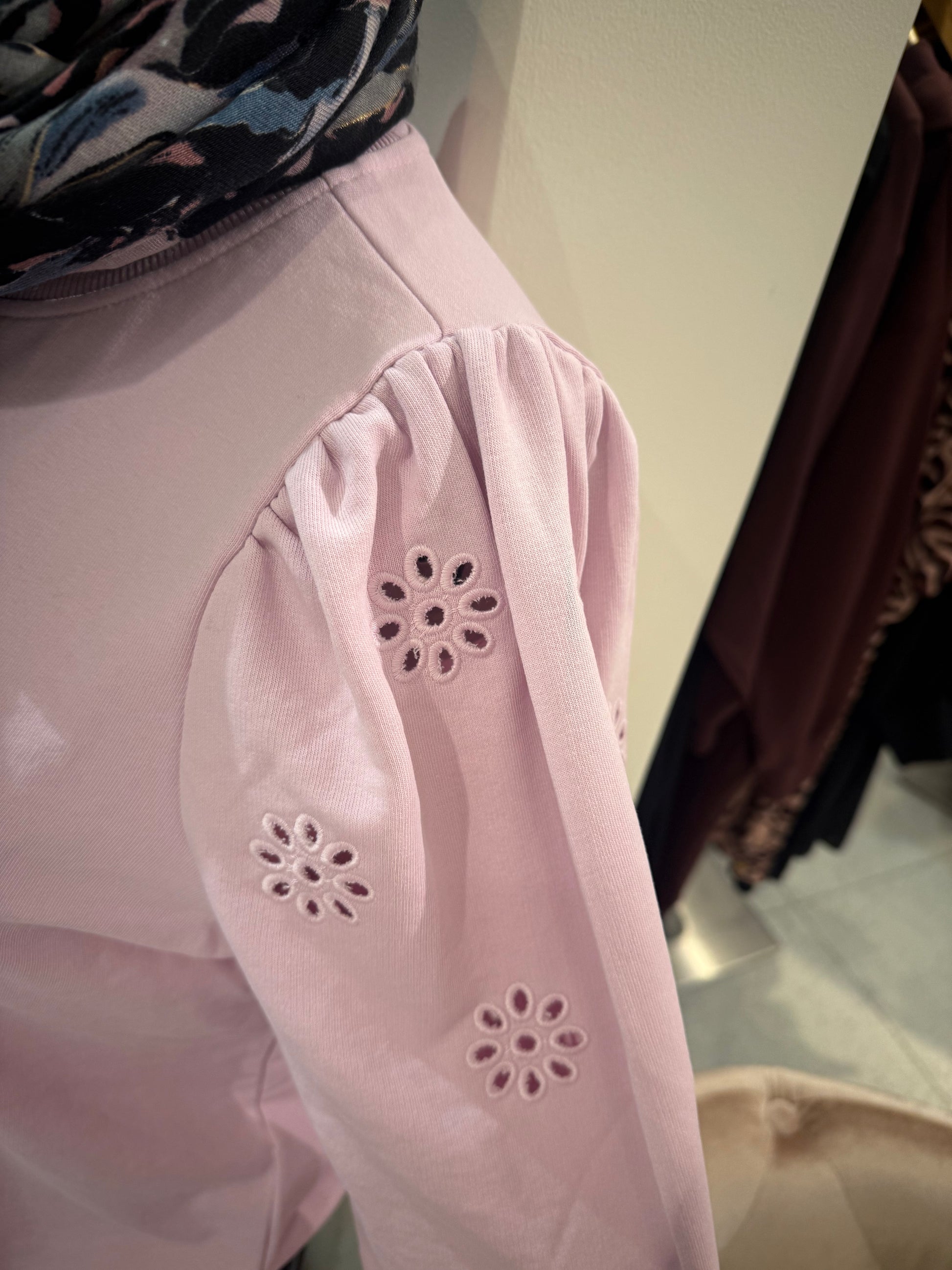 Mysig rosa tröja med rundad hals och puffärmar med broderade blommor.