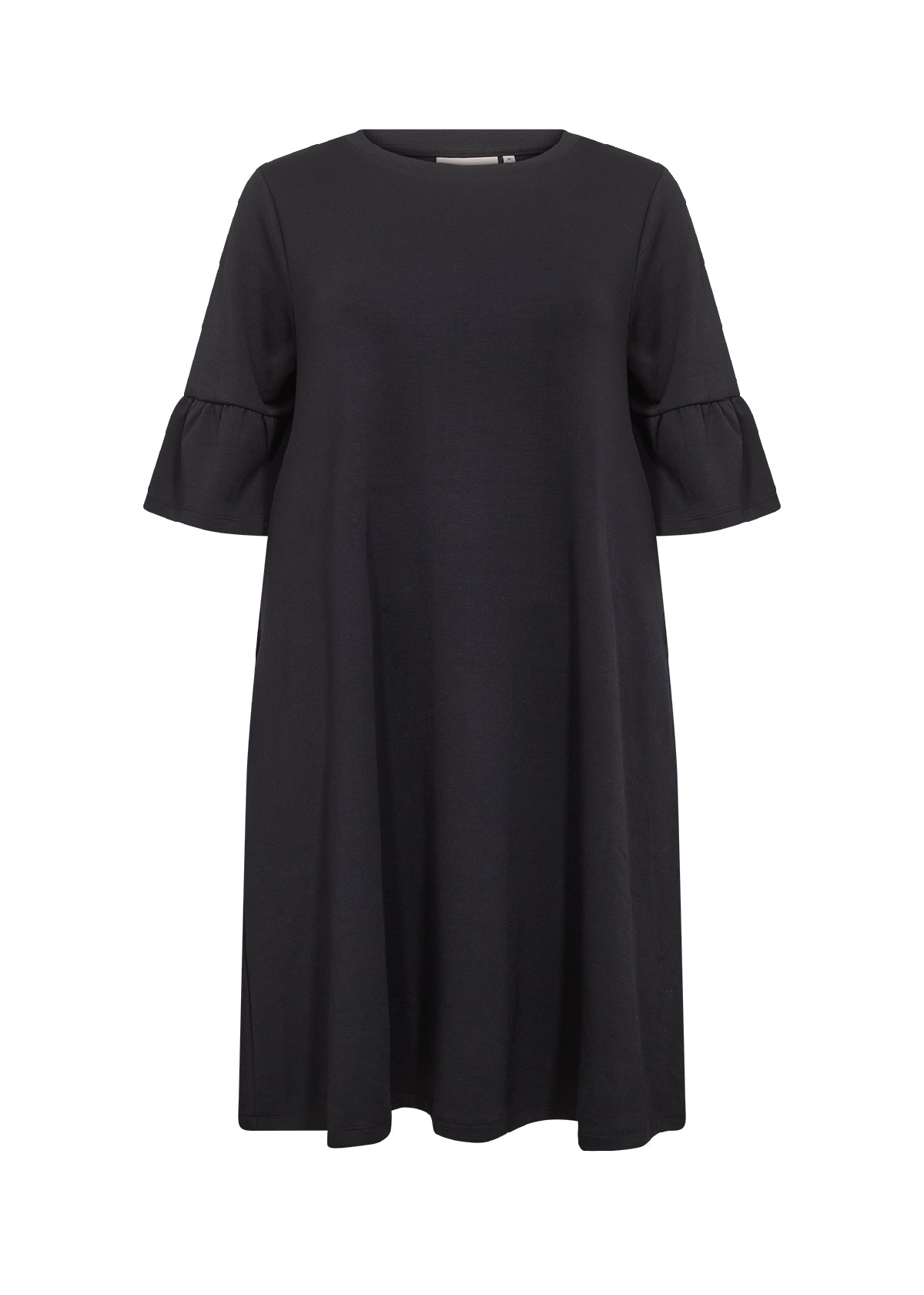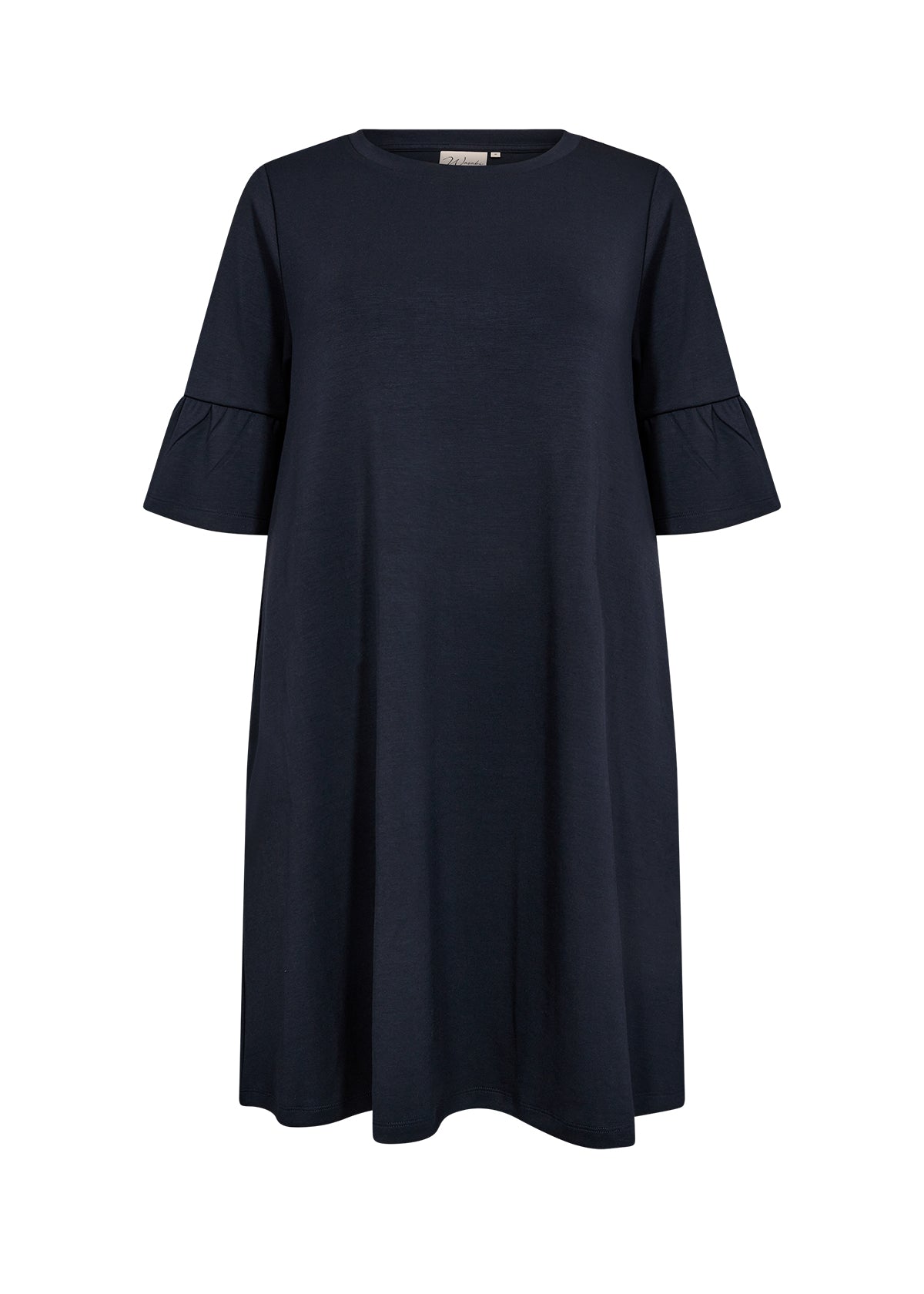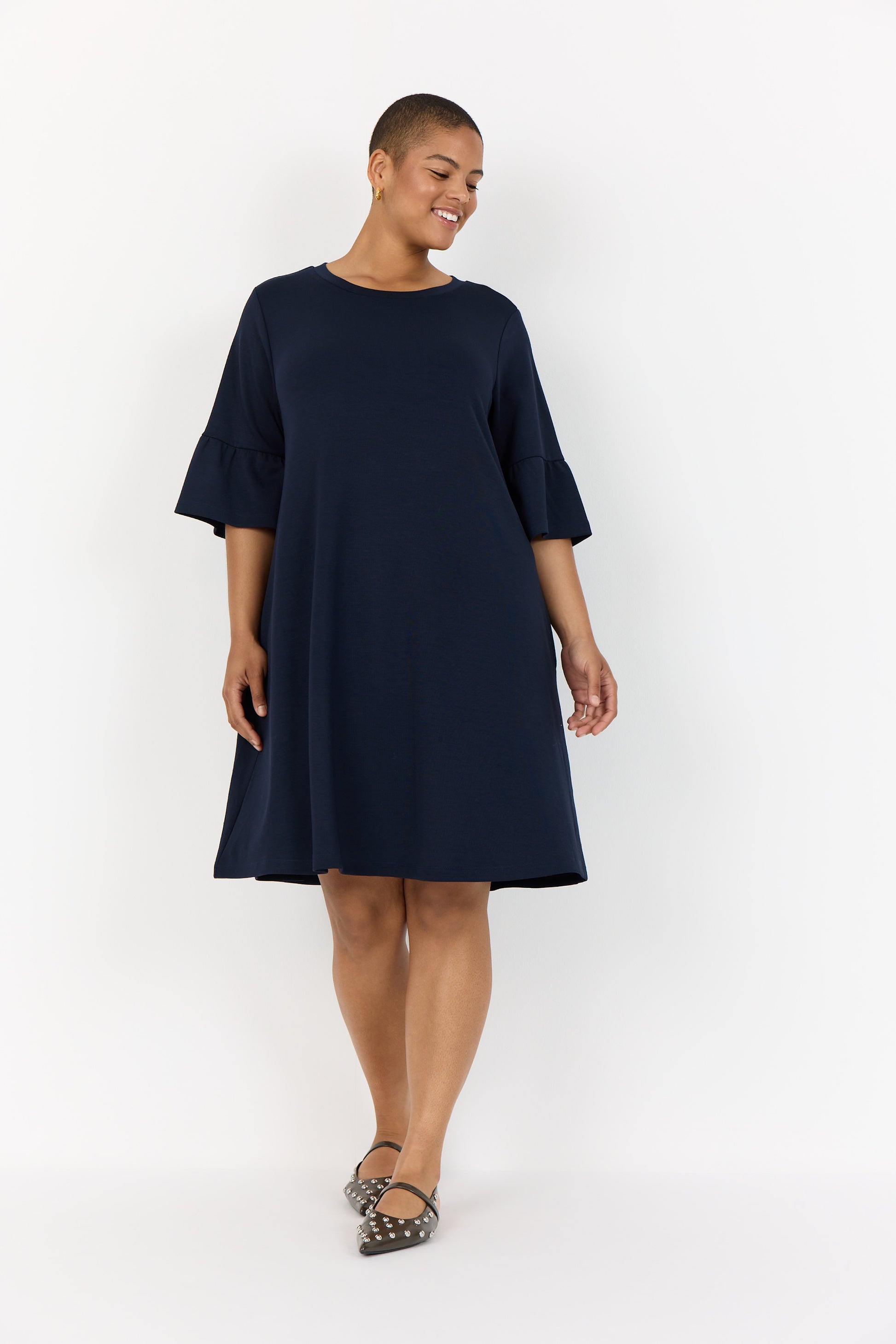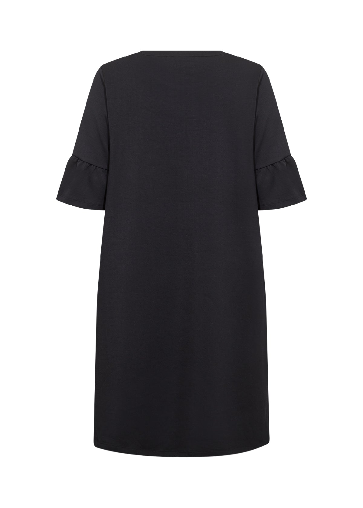 Skön A-formad klänning med rundad hals och 3/4 dels ärmar, det är fin volang kant på slutet av ärmen som ger en snygg touch.