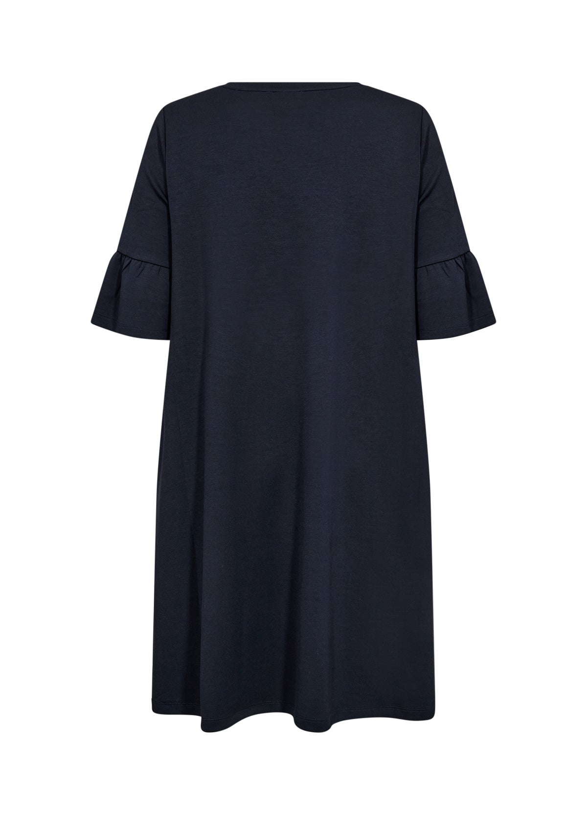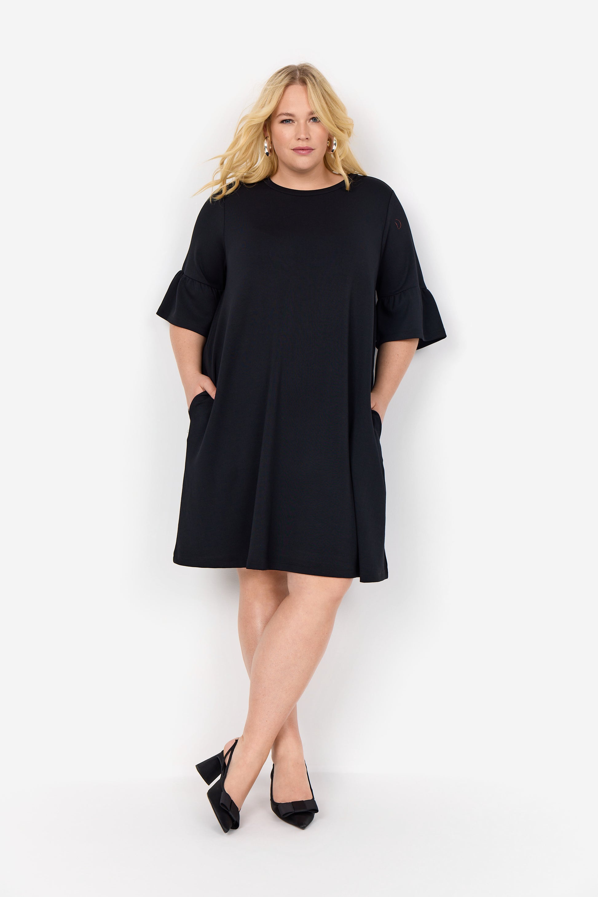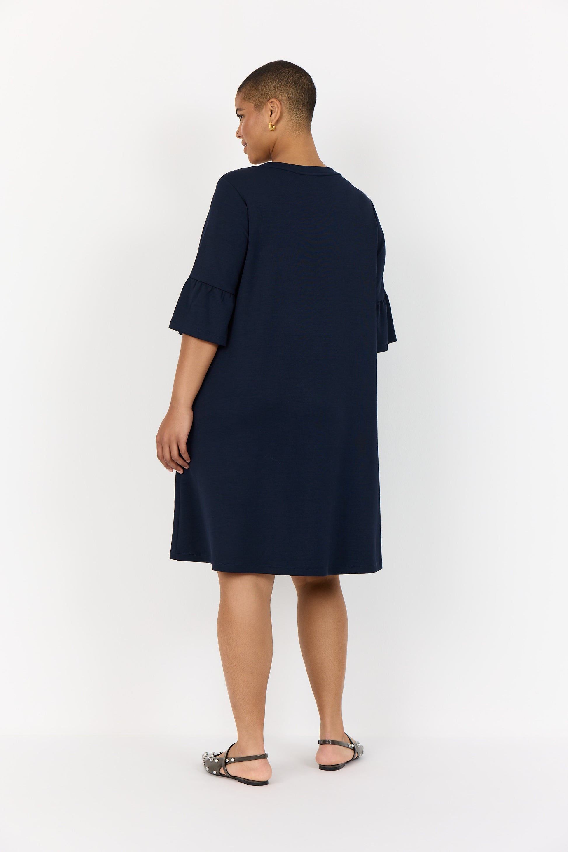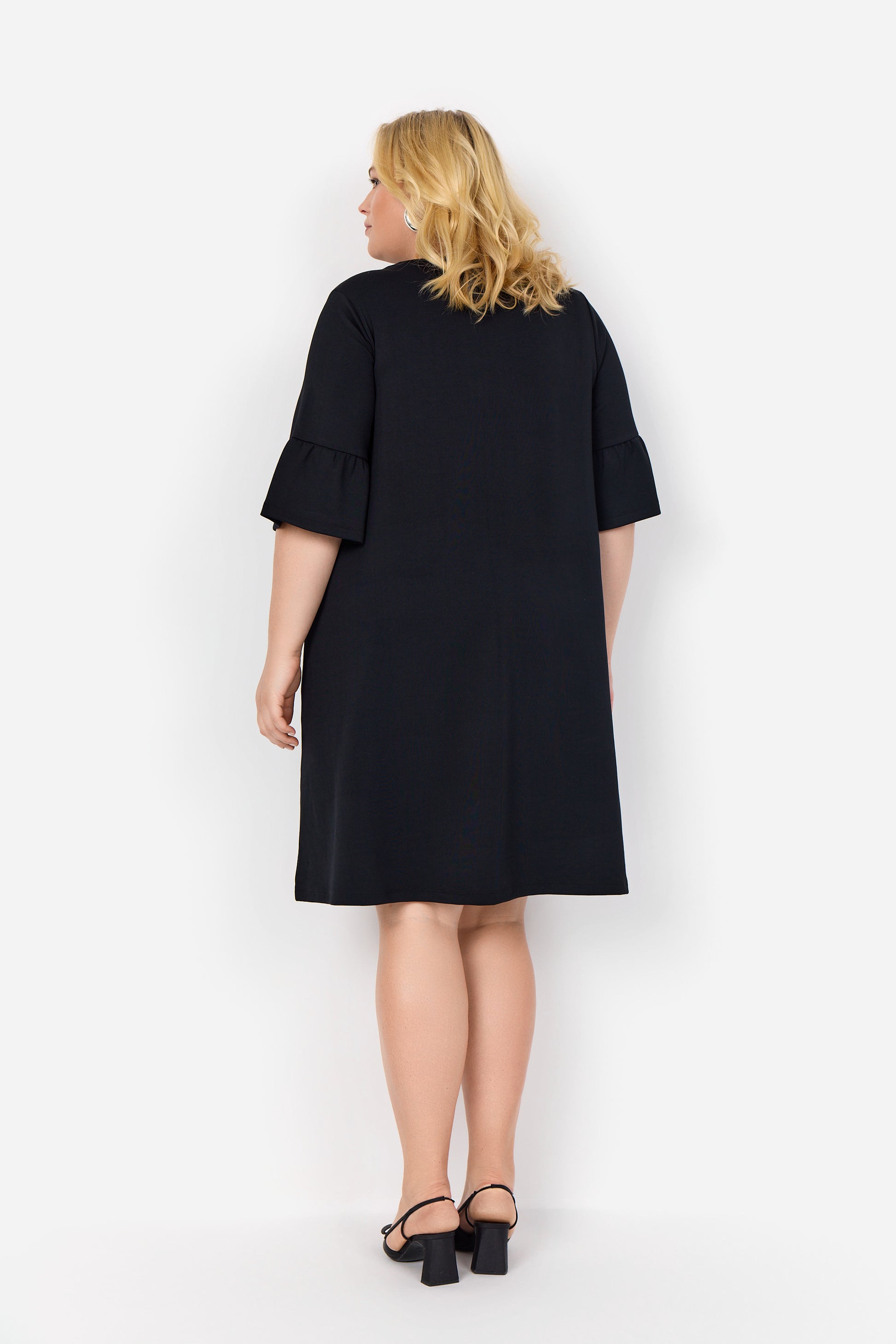 Skön A-formad klänning med rundad hals och 3/4 dels ärmar, det är fin volang kant på slutet av ärmen som ger en snygg touch.