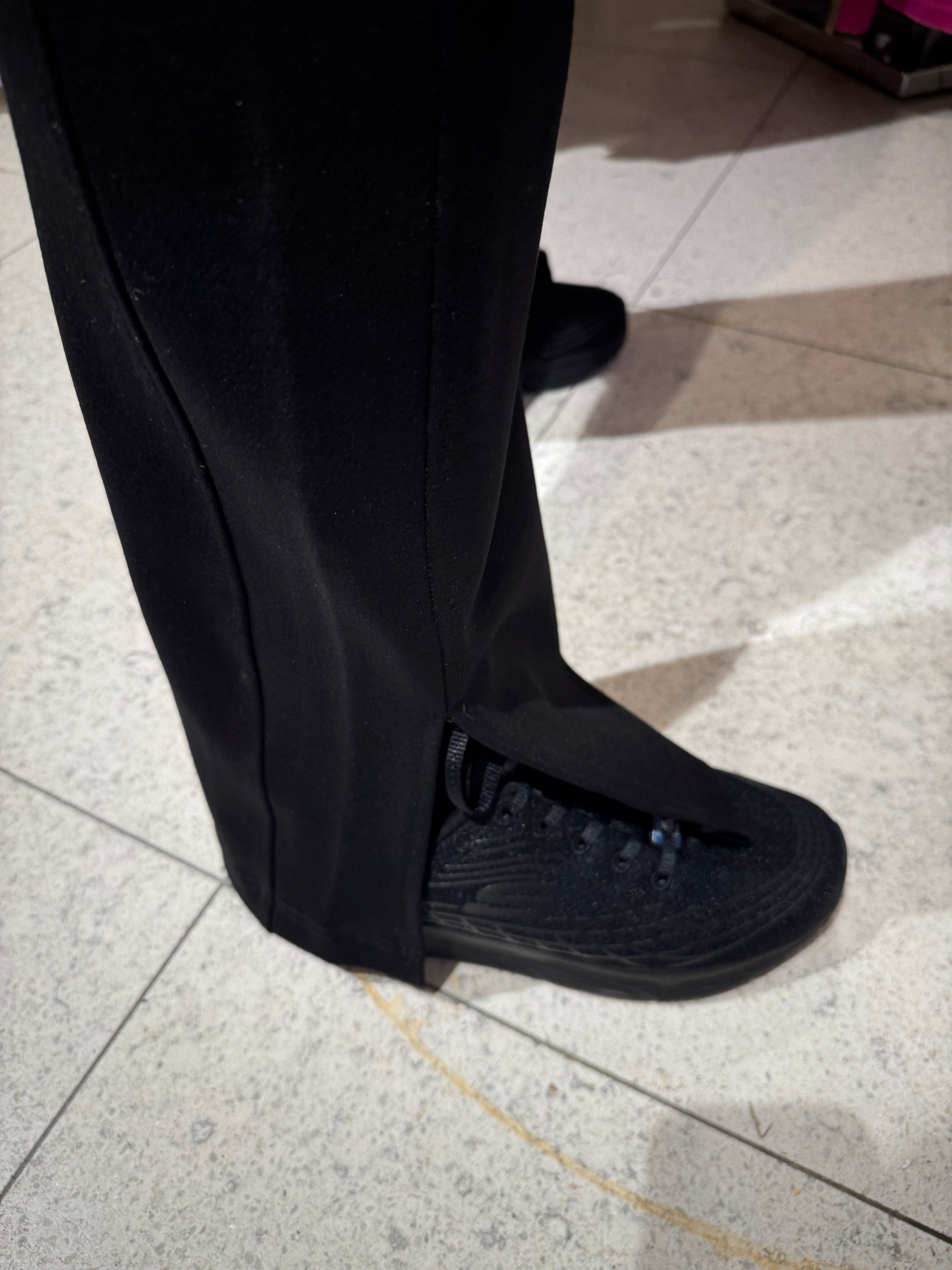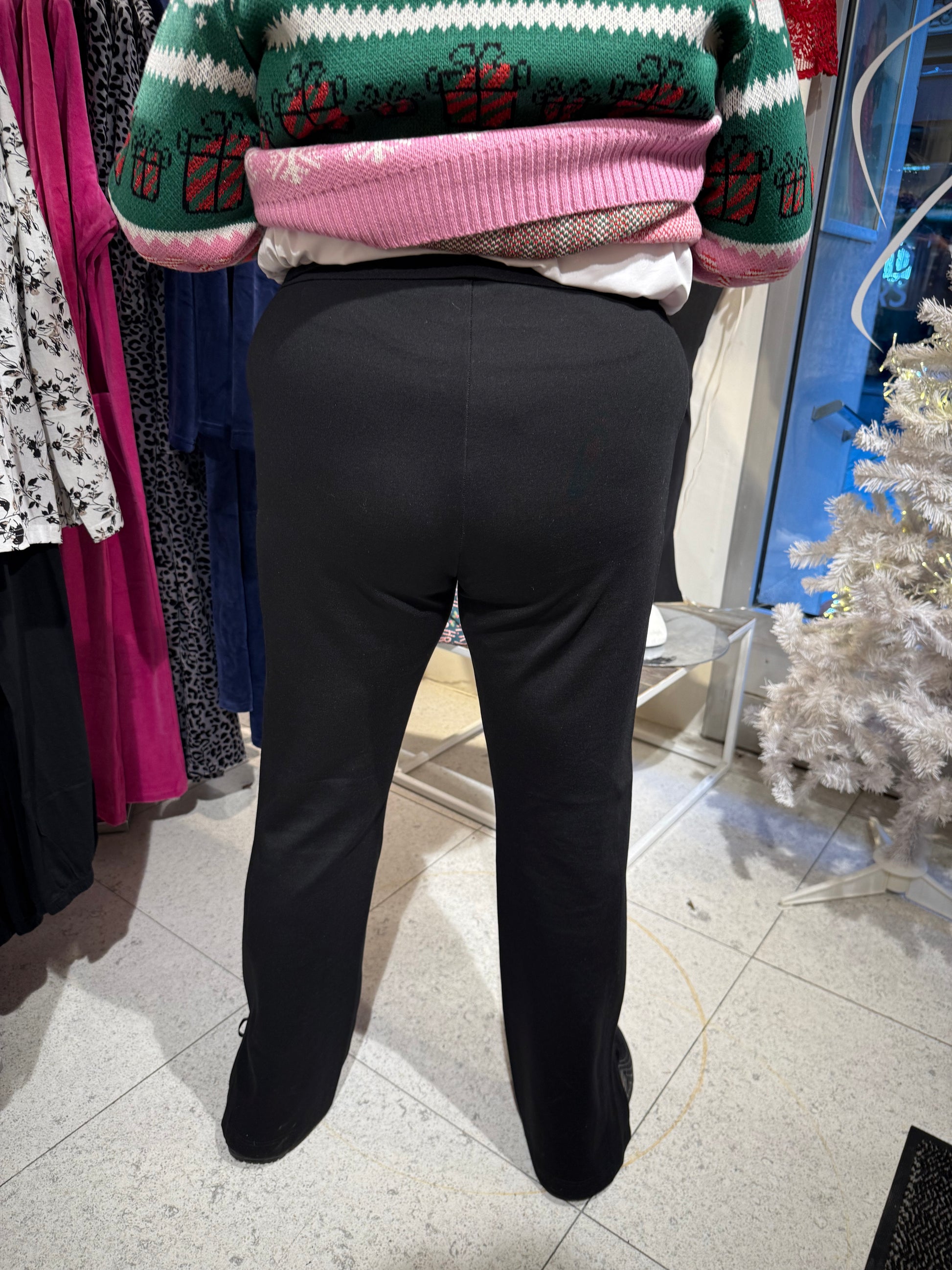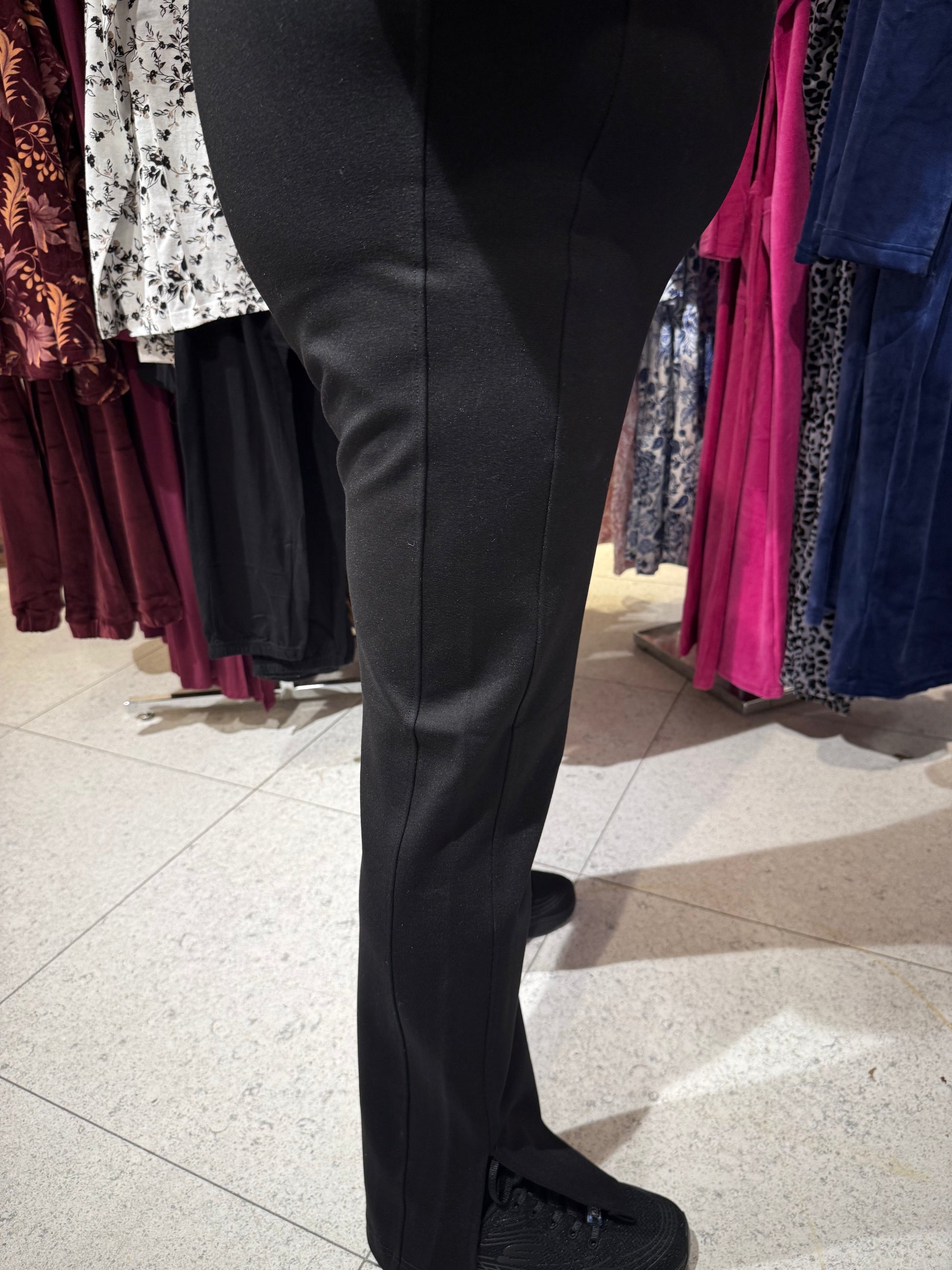 En snygg byxa med hög midja och resår, det är smala ben med utsvängda ben & en slits på vardera sida. Denna byxa kan du både bära till vardags och fest.