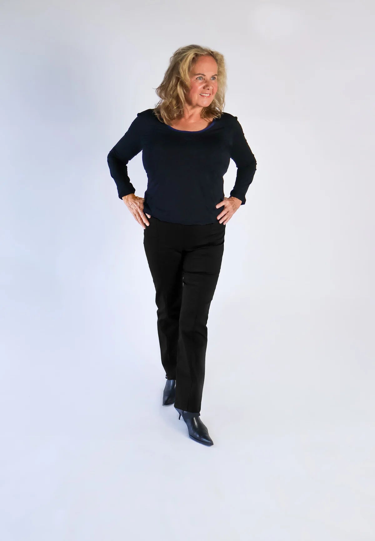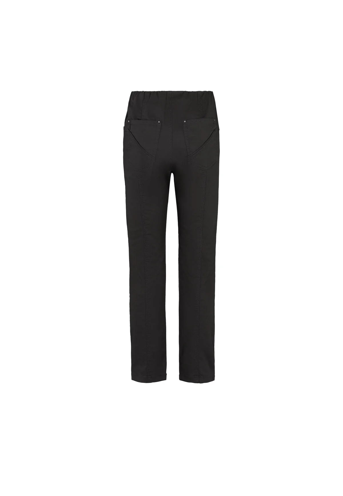 Denna byxa riktar sig till kvinnor som drar mer över magen och har smalare ben, det är en hög midja med resår och hällor så du kan ha bälte.