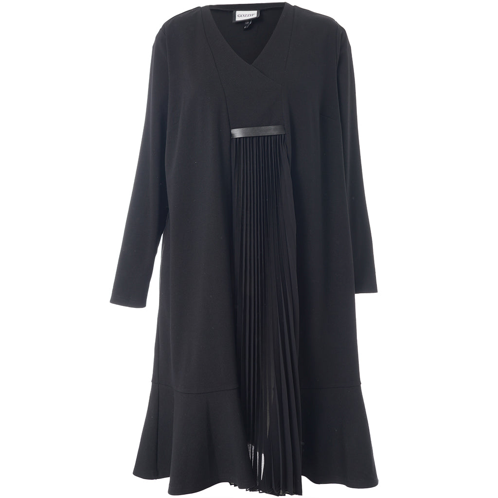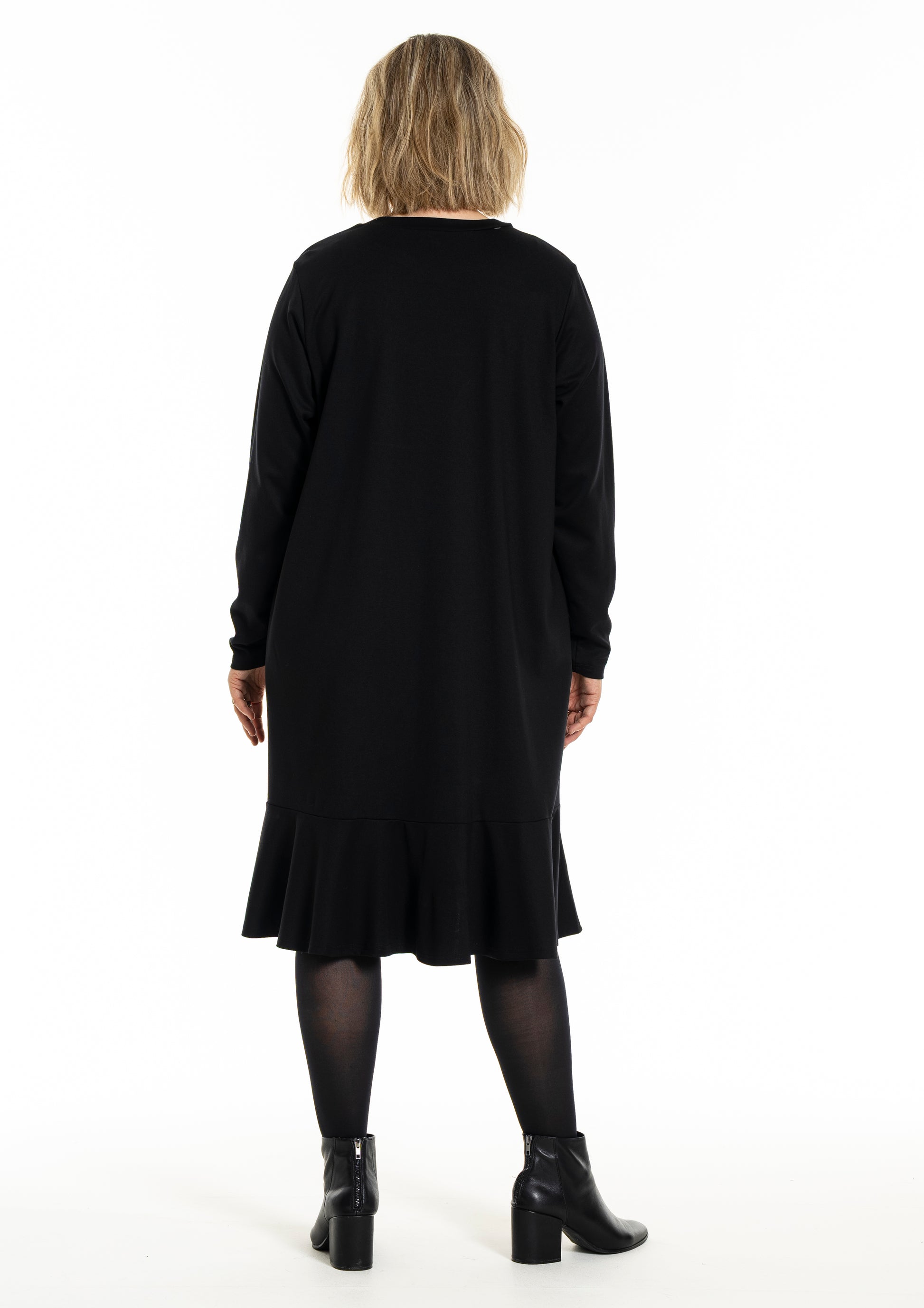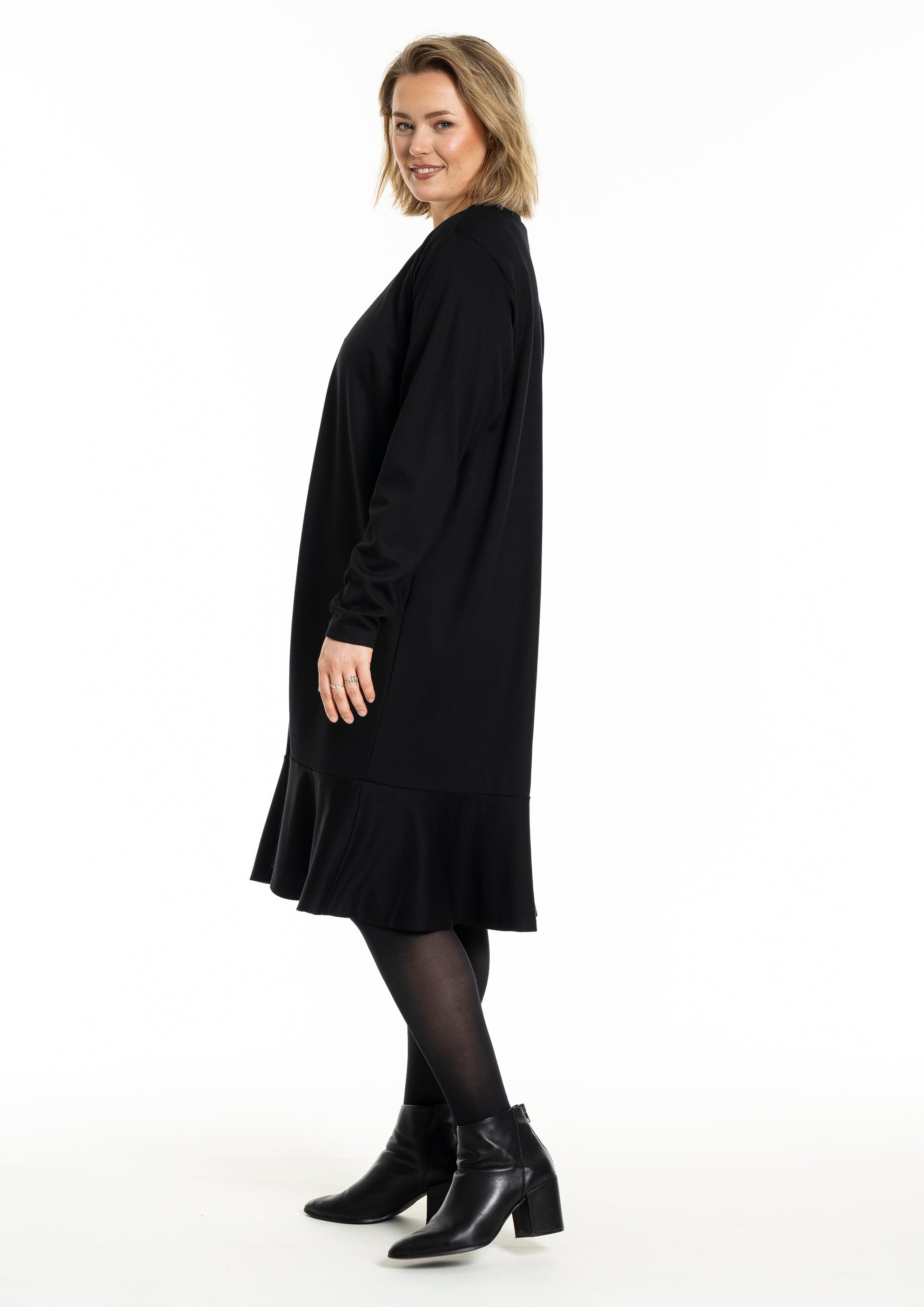 Elegant svart klänning med v-ringad hals och långa ärmar, det är ett litet spänne framtill och en lätt plissering som ger ett snyggt fall på klänningen, på slutet av klänningen är det en volang kant.
