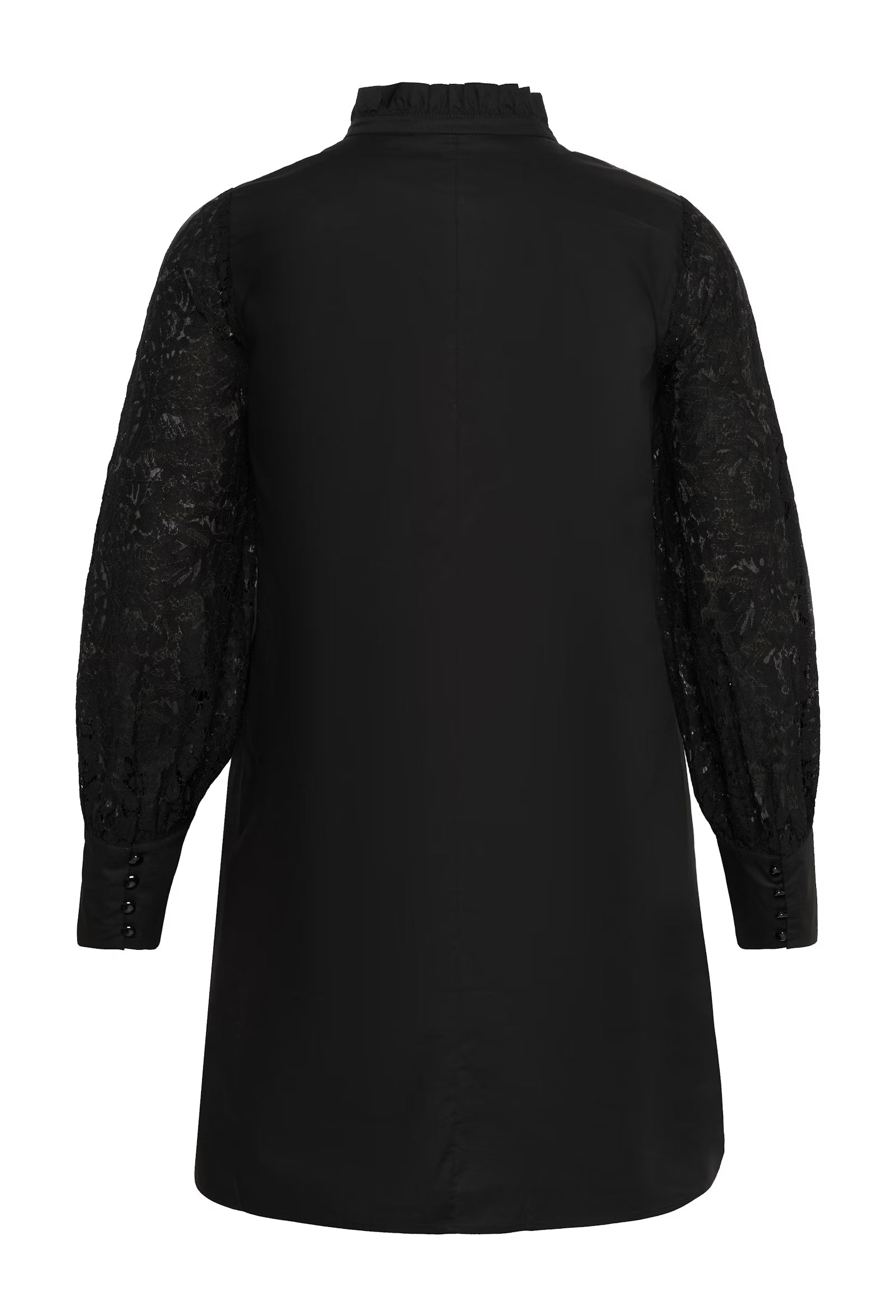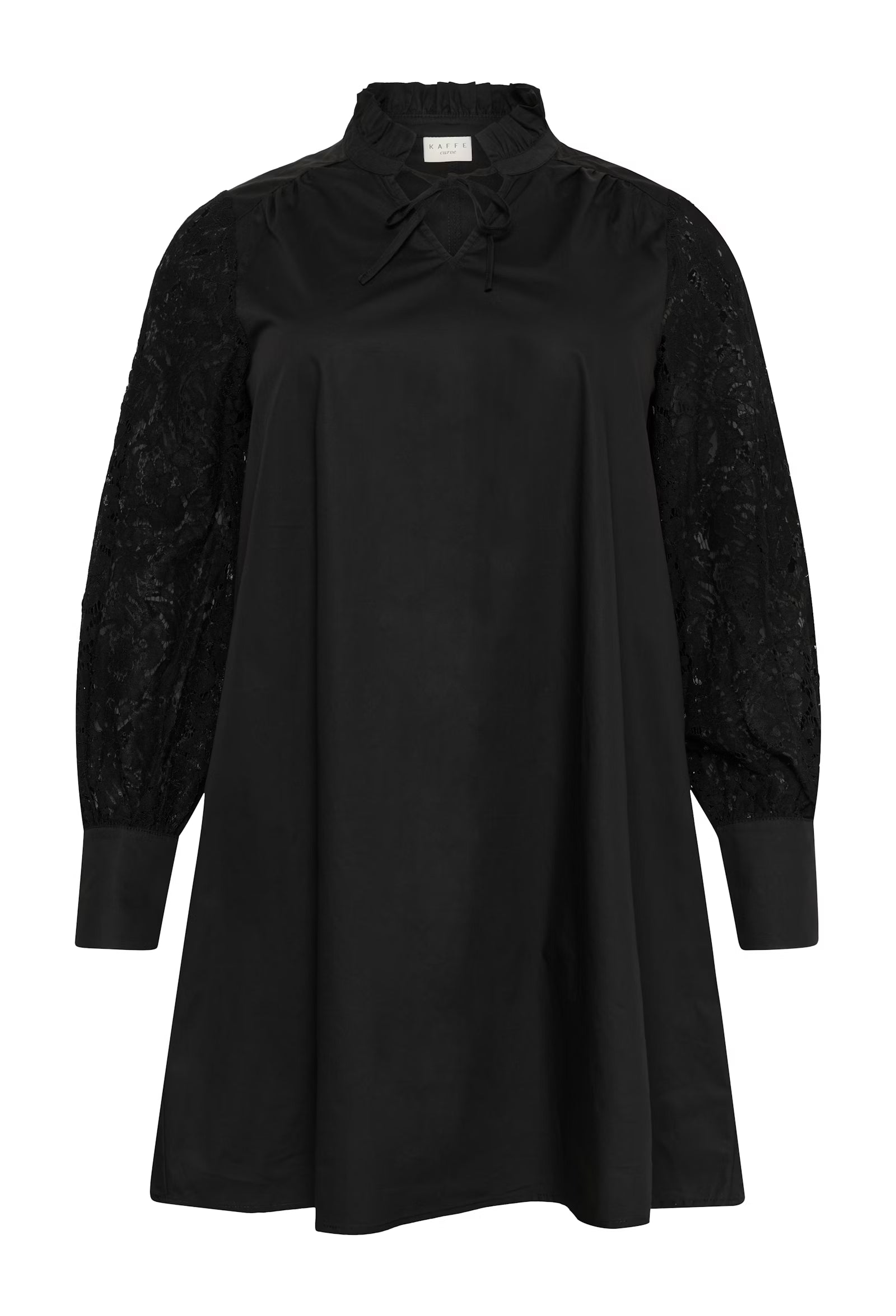 En elegant svart klänning med långa ärmar i spets, det är en krage med ett band som du kan knyta åt, modellen är lätt A-formad.