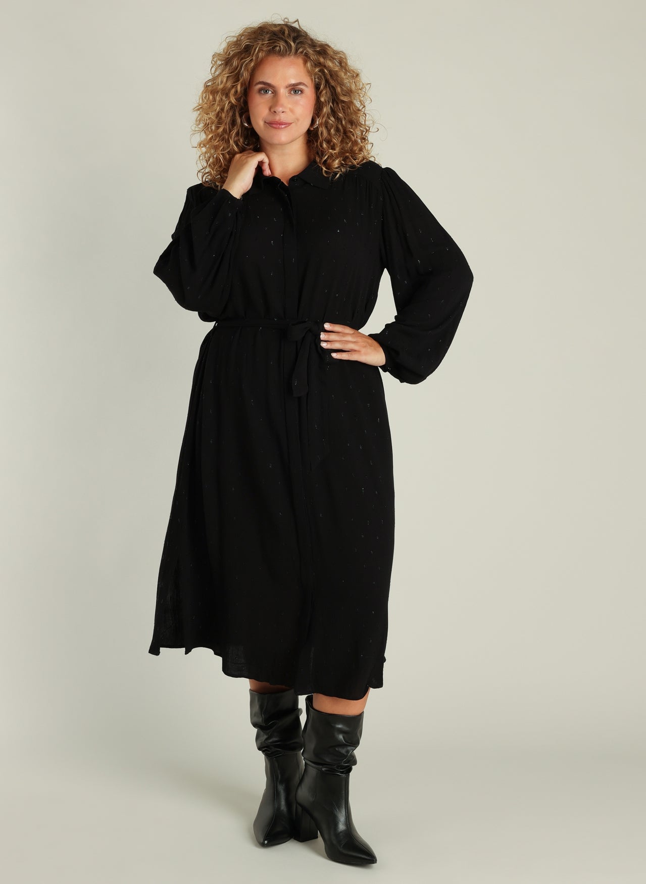 Snygg svart lång klänning/ skjorta med långa ärmar och klassisk skjortkrage, du kan både bära denna öppen och stängd. Det är små mönstrat i tyget så det blir en snygg touch.
