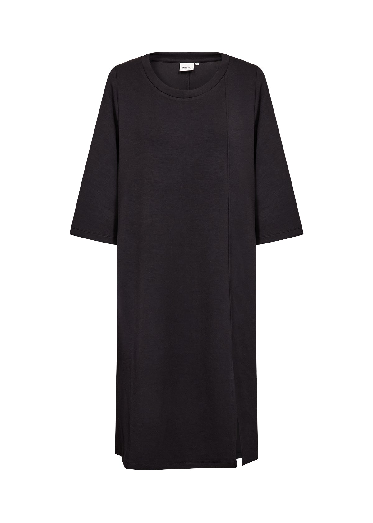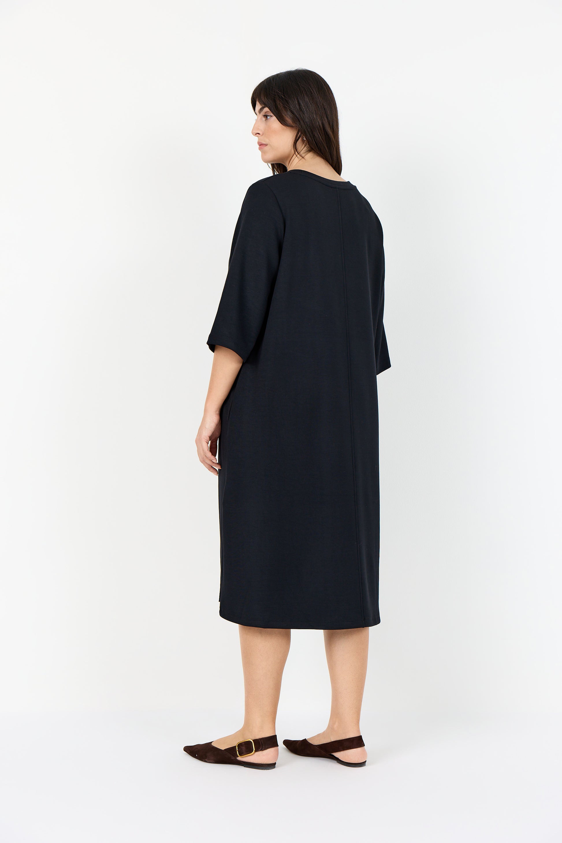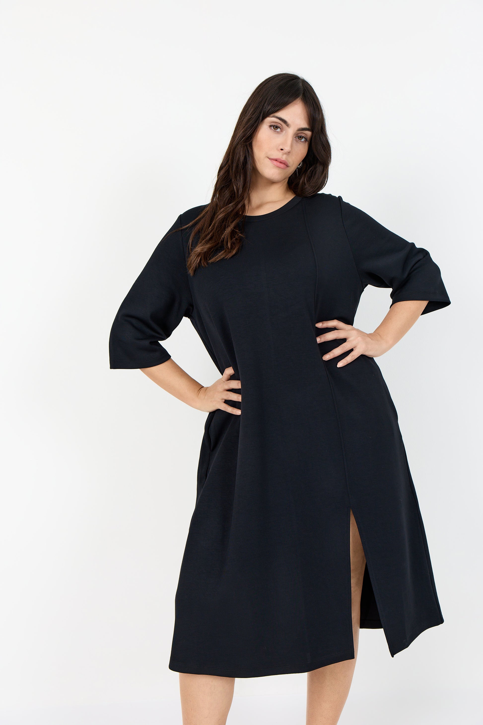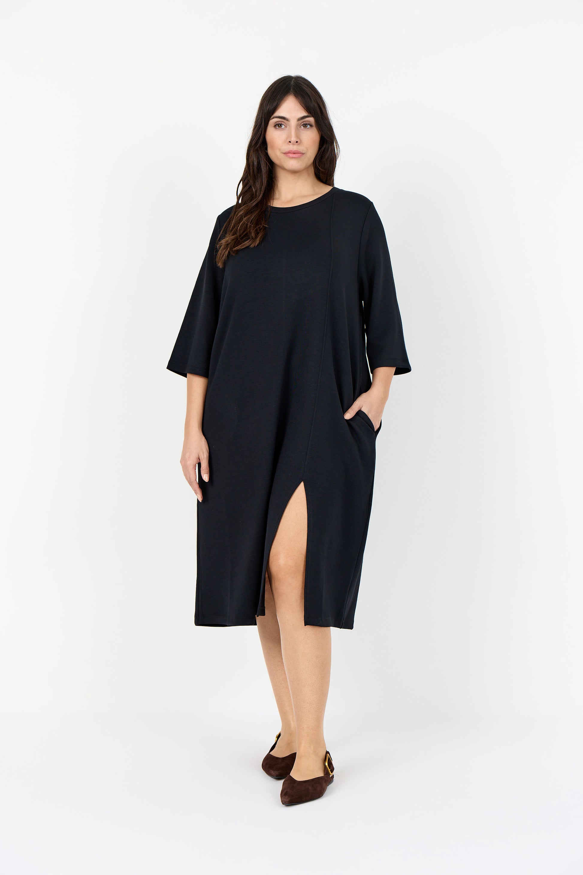 En härlig klänning med en sammansättning av 48% modal, 48% polyester och 4% elastan. Klänningen har en avslappnad silhuett med trekvartsärmar och en subtil vertikal sömdetalj.