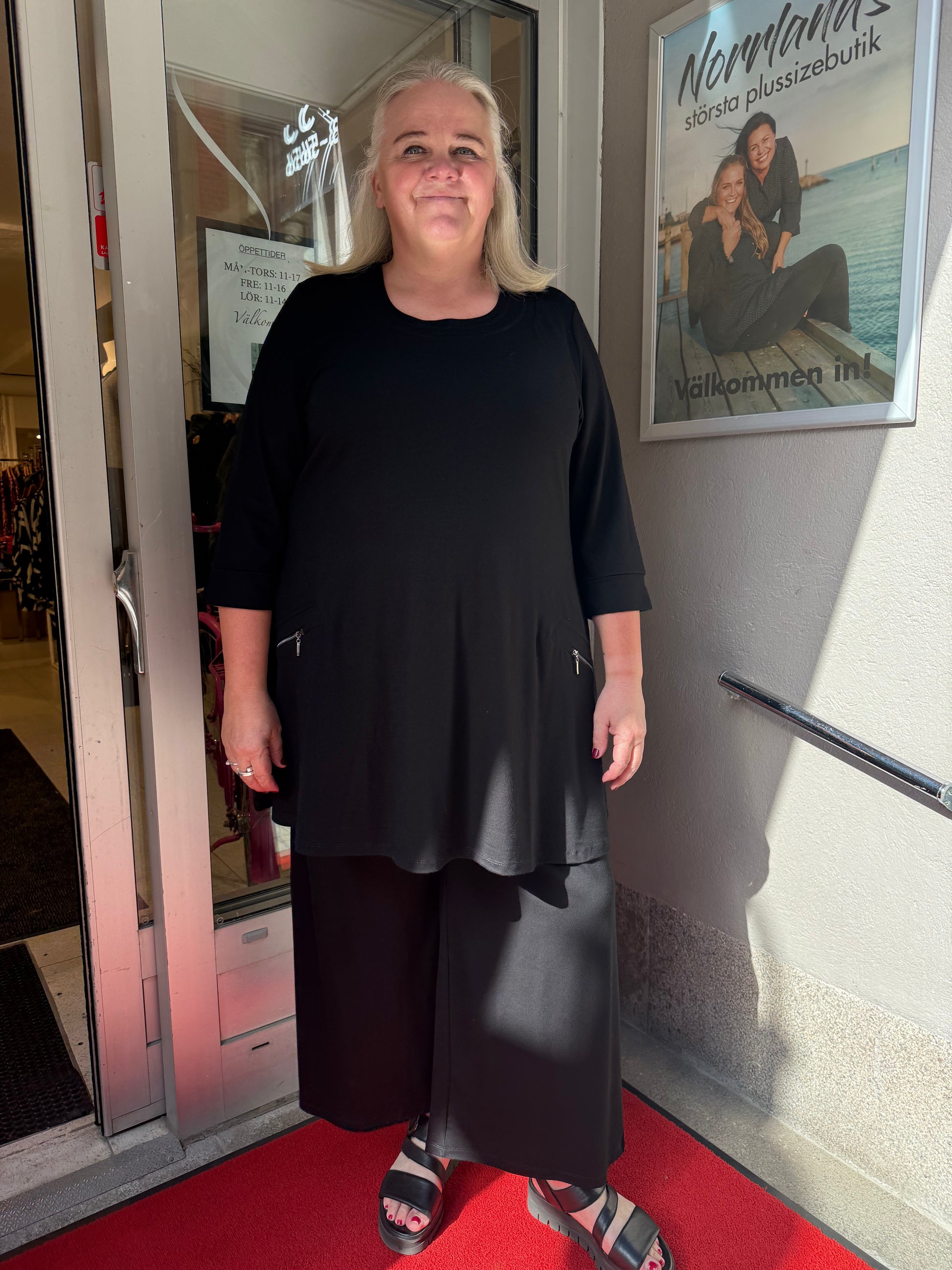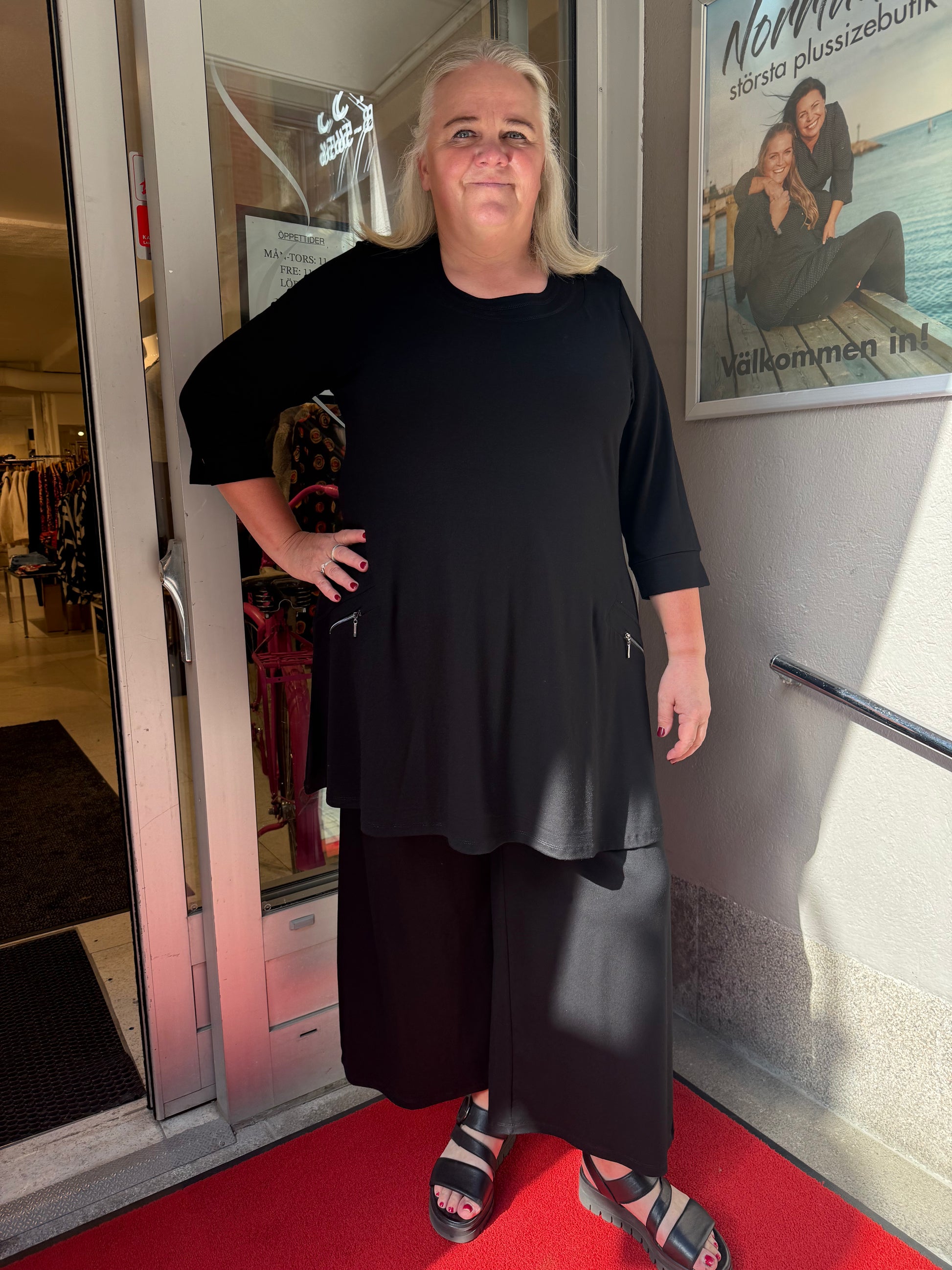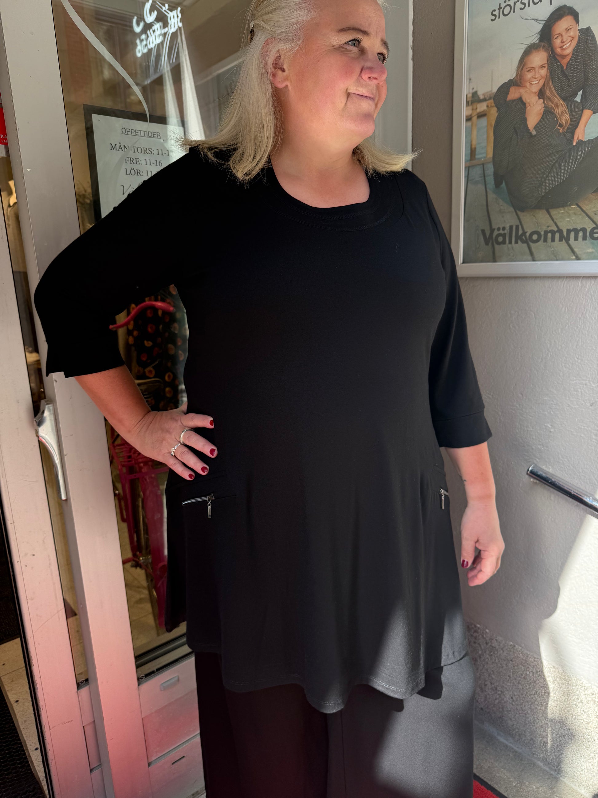 En klassisk svart A-formad tunika med rundad hals och 3/4 dels långa ärmar, det är två fusk drag kedjor på sidorna som ger en snygg detalj.