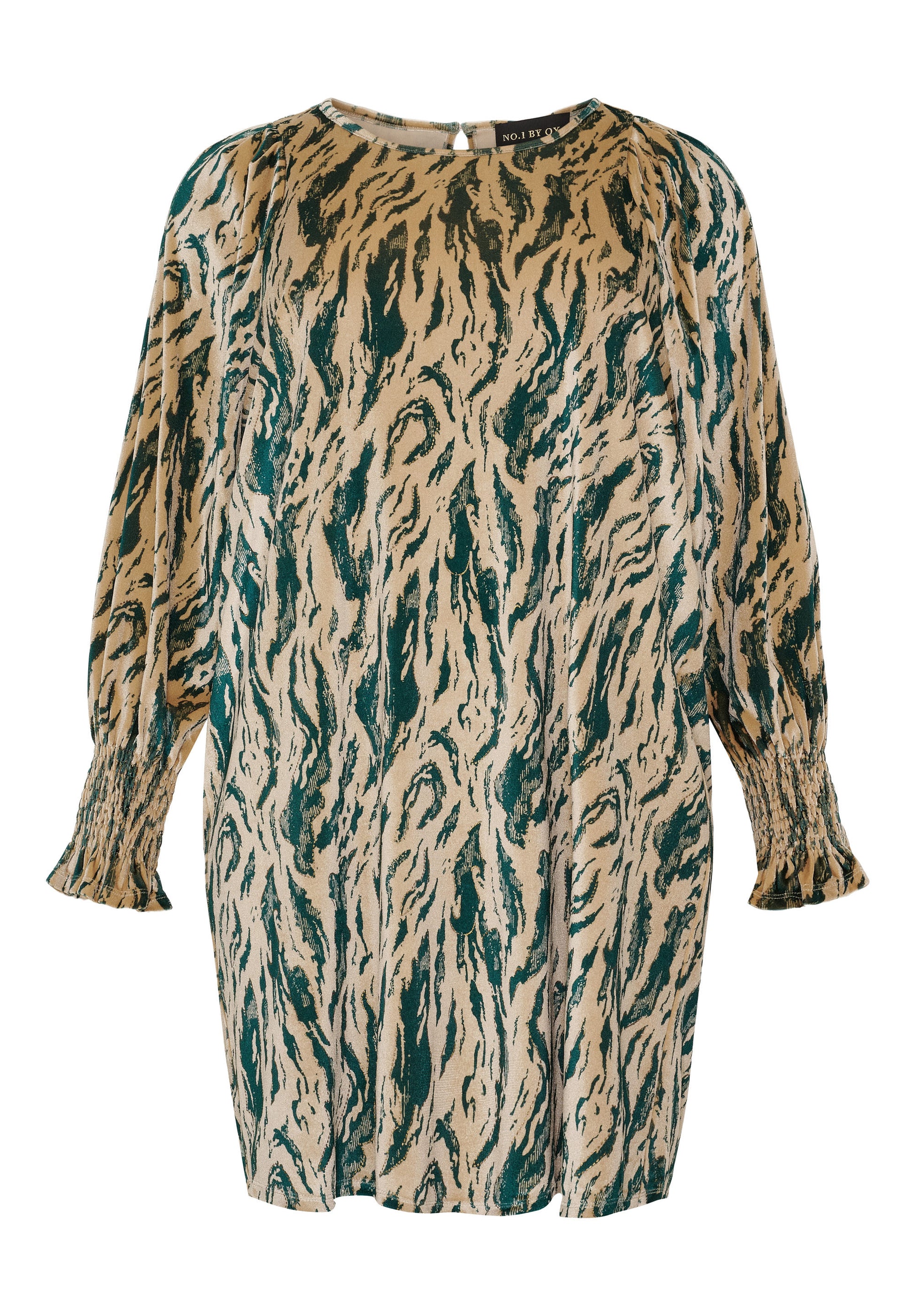 Klänning i mjuk sammet med långa ärmar och rundad hals, det är beige botten med grönt & guldiga inslag. Bär denna till ett par leggings eller strumpbyxor.