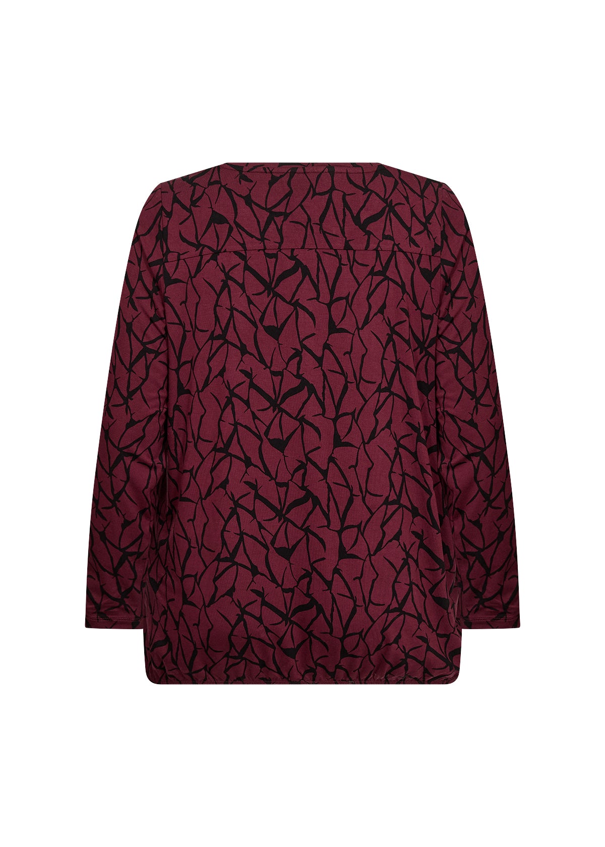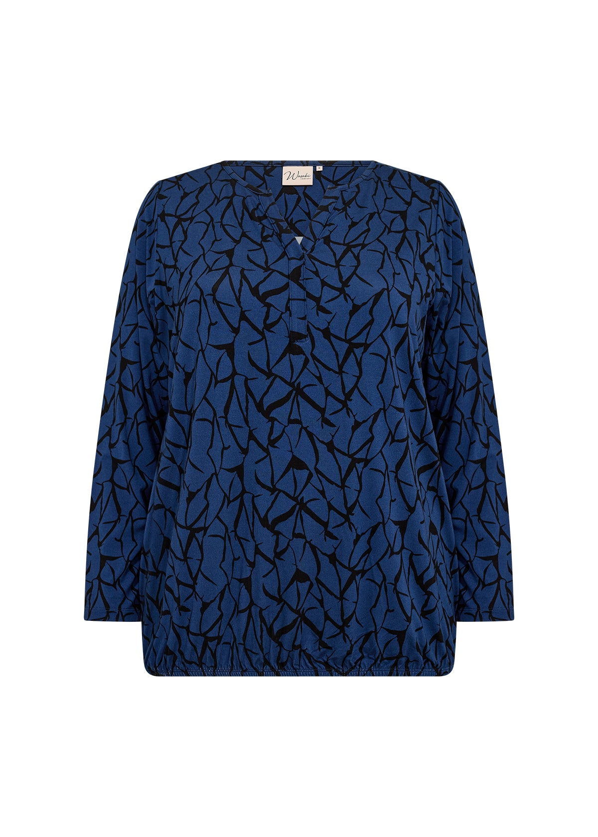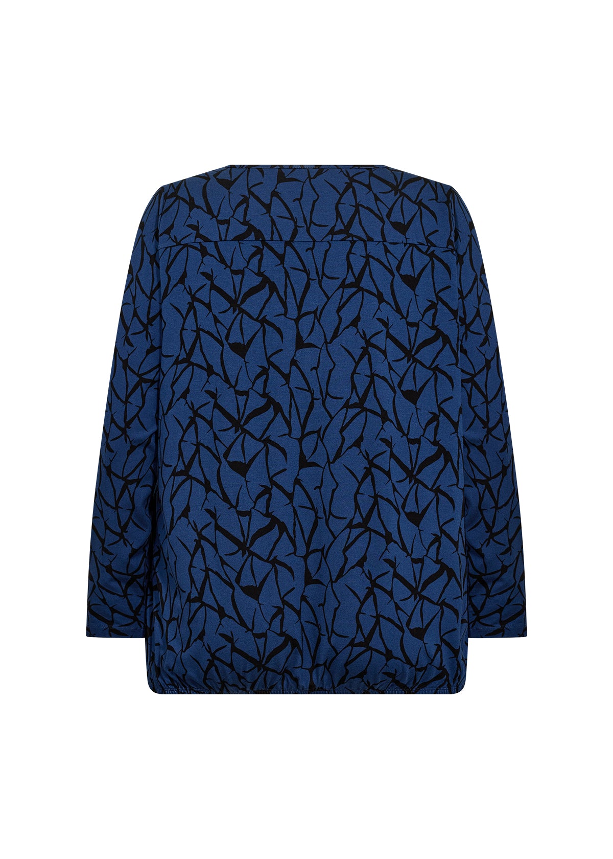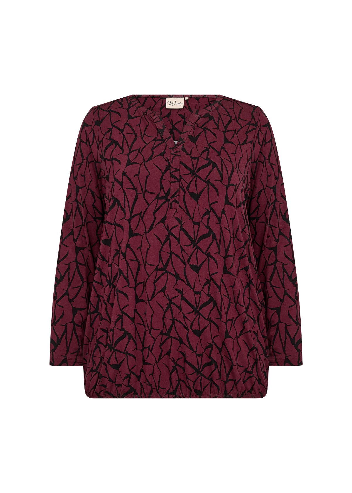 Den har V-ringad hals, långa ärmar och ett abstrakt tryck och resår avslut.