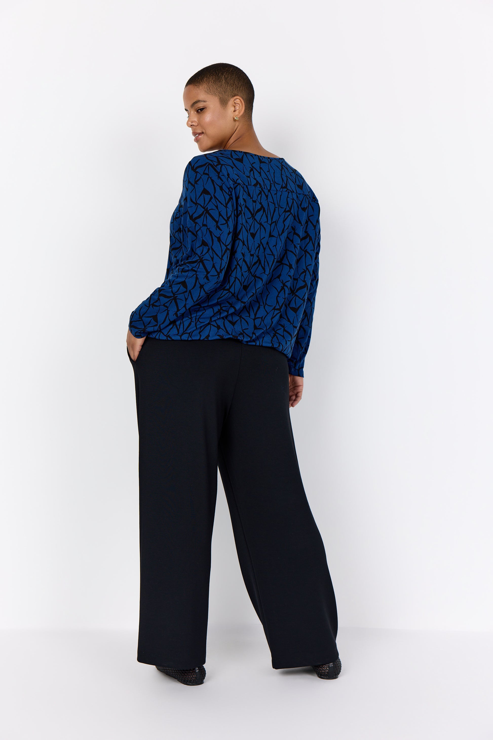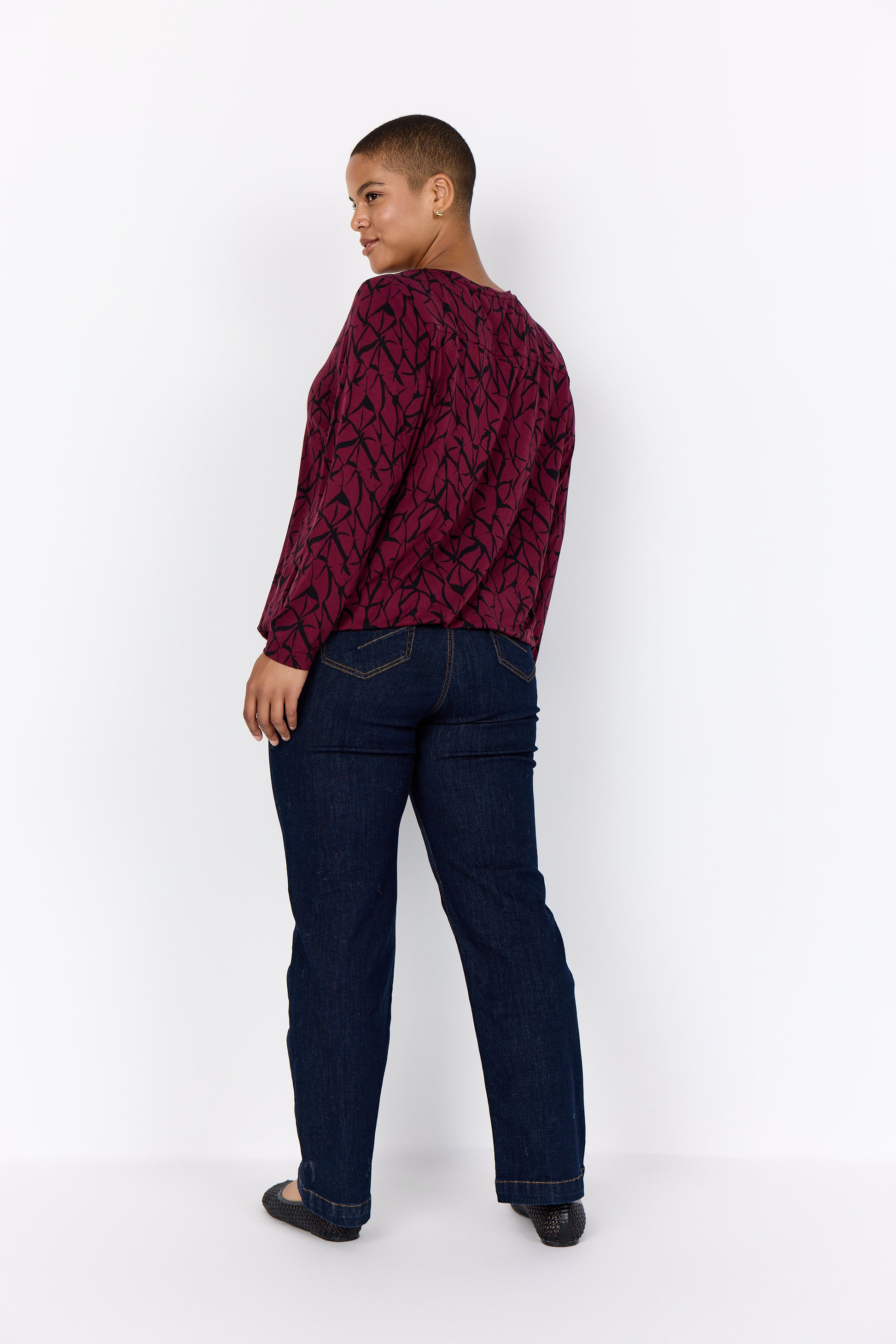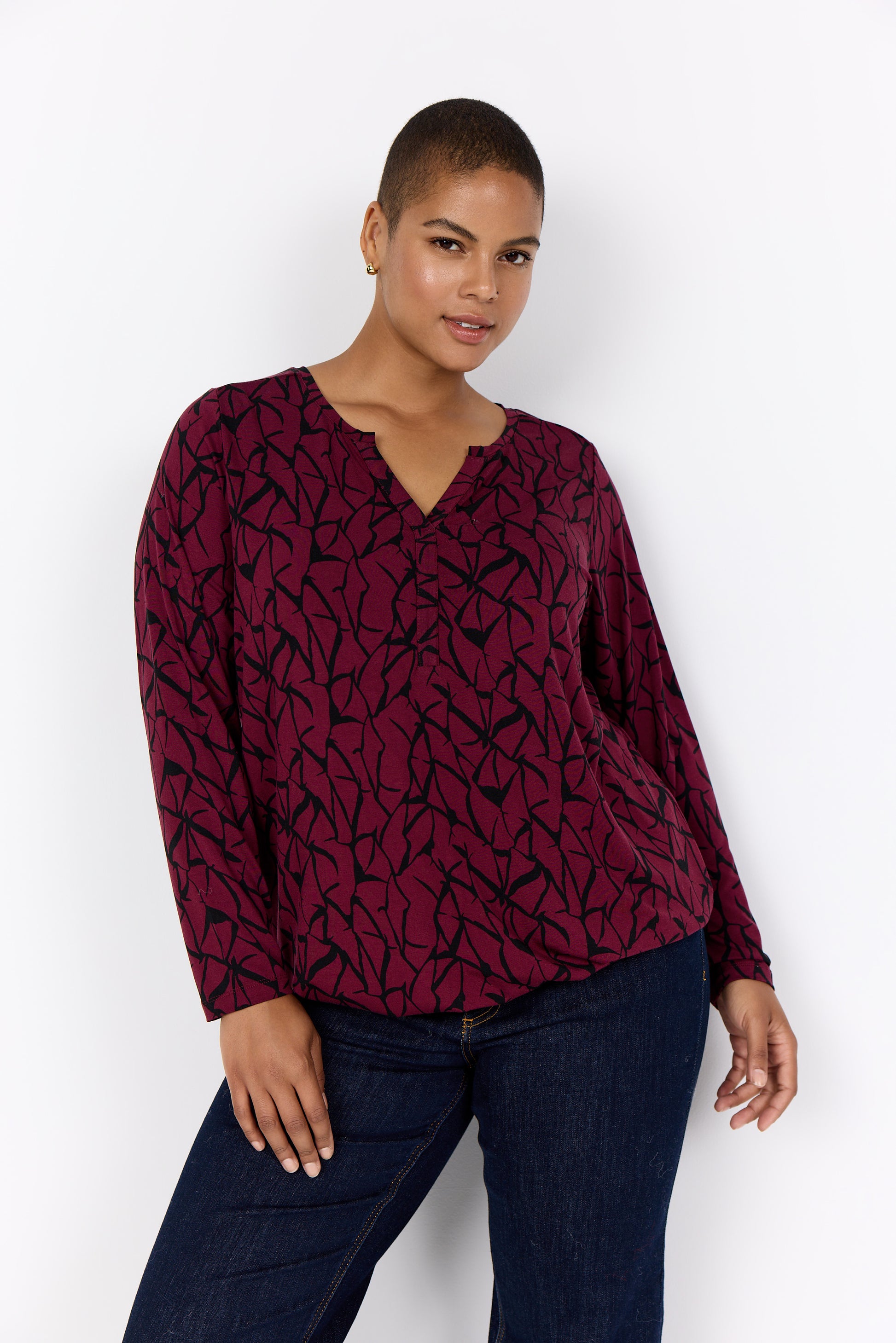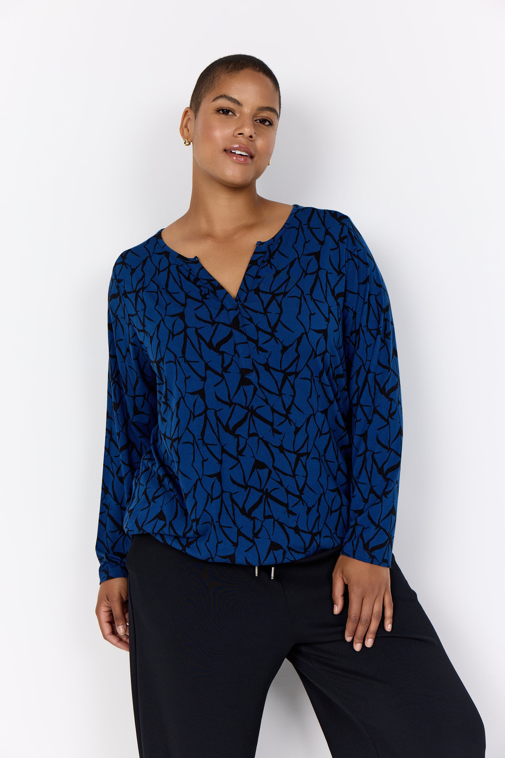 Den har V-ringad hals, långa ärmar och ett abstrakt tryck och resår avslut.