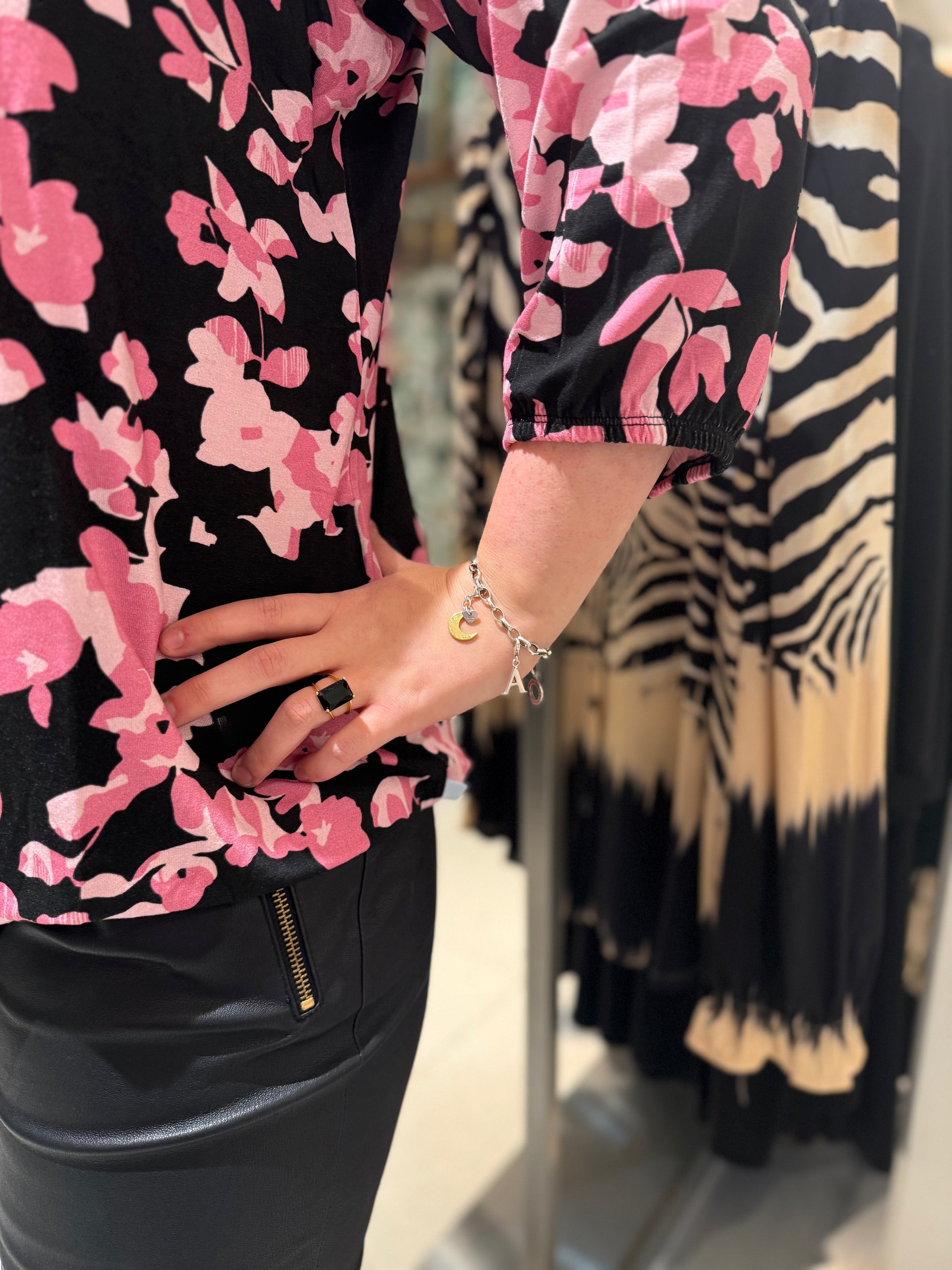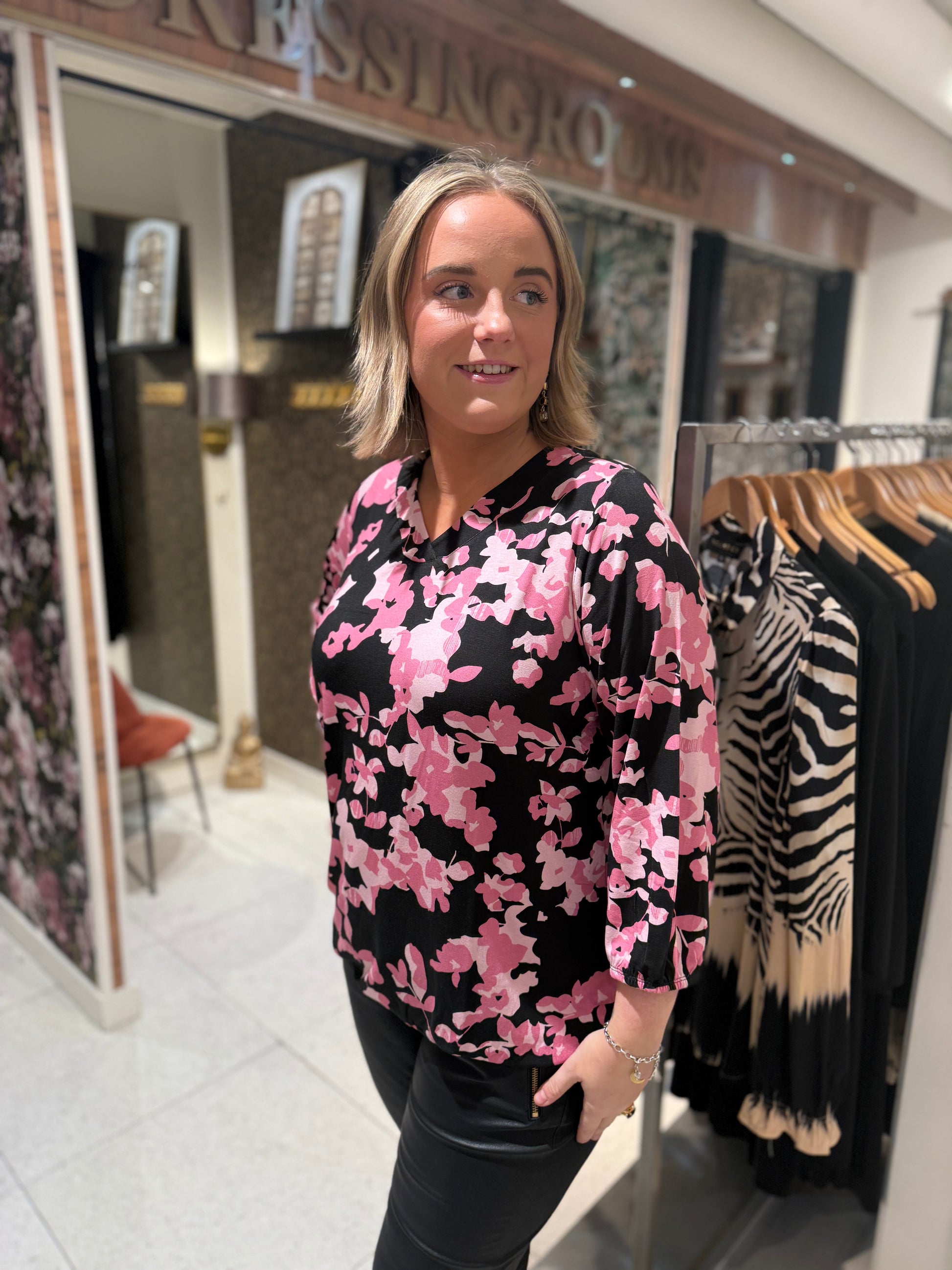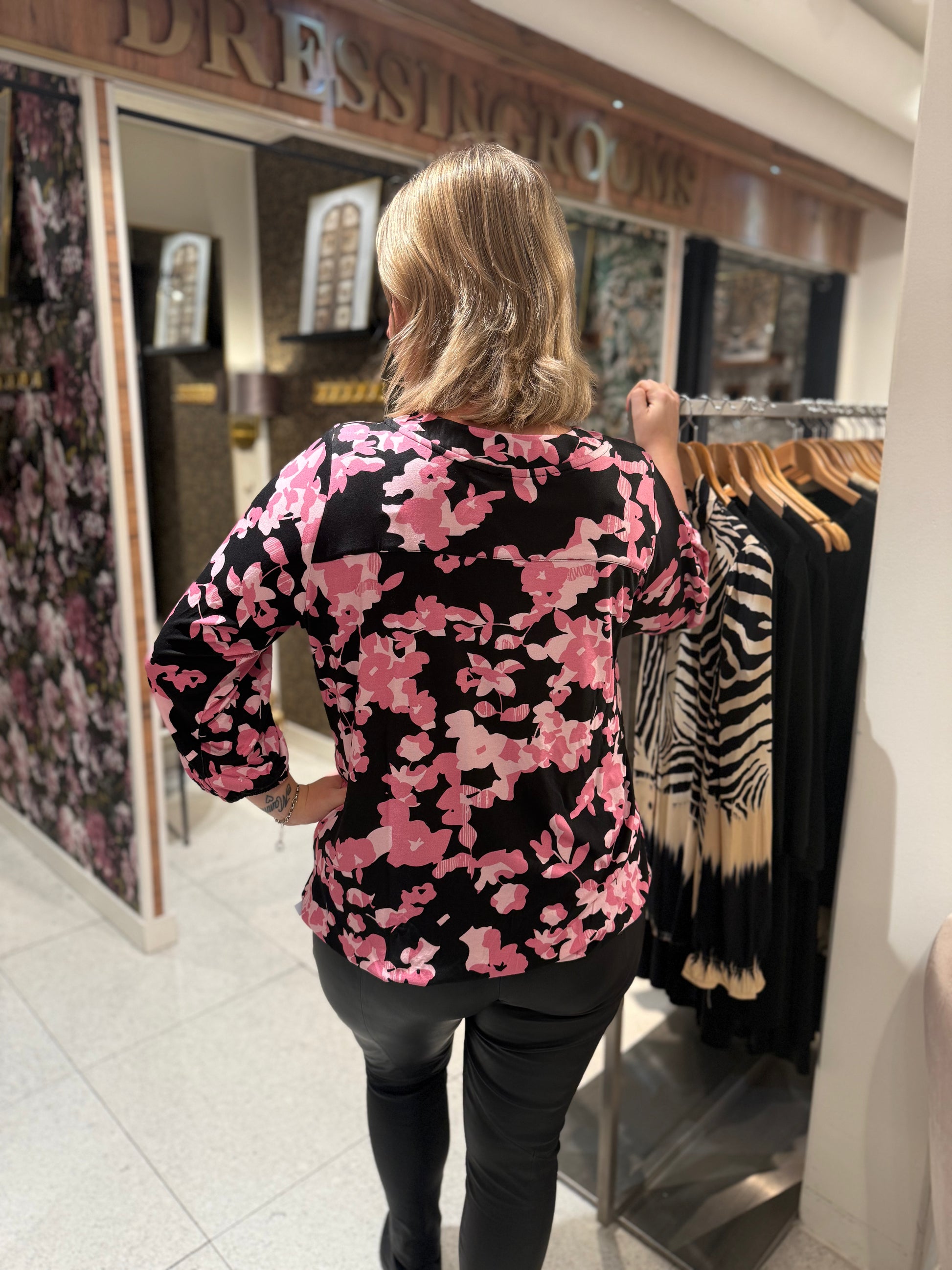 Den klassiska toppen med resåravslut har kommit tillbaka i ett nytt härligt print, det är v-ringad hals med 3/4 dels ärmar. Resåravslut på ärmen och slutet av tröjan.