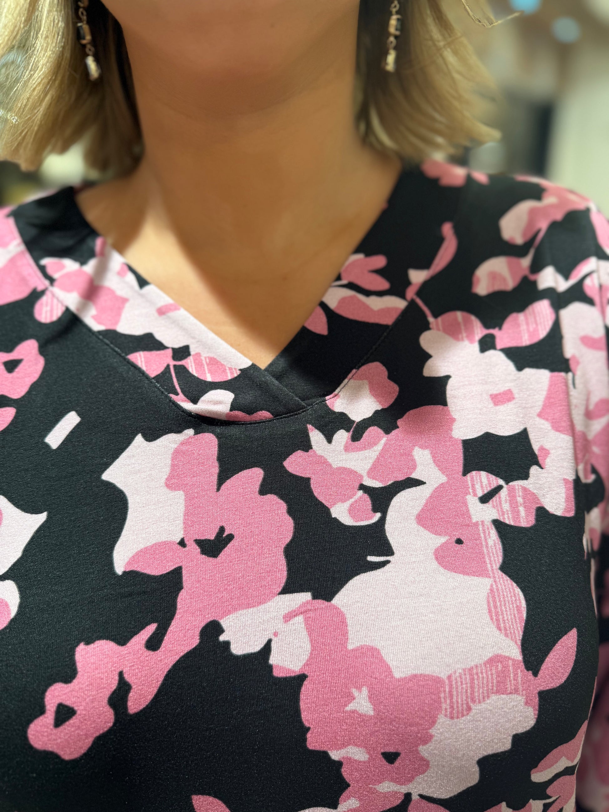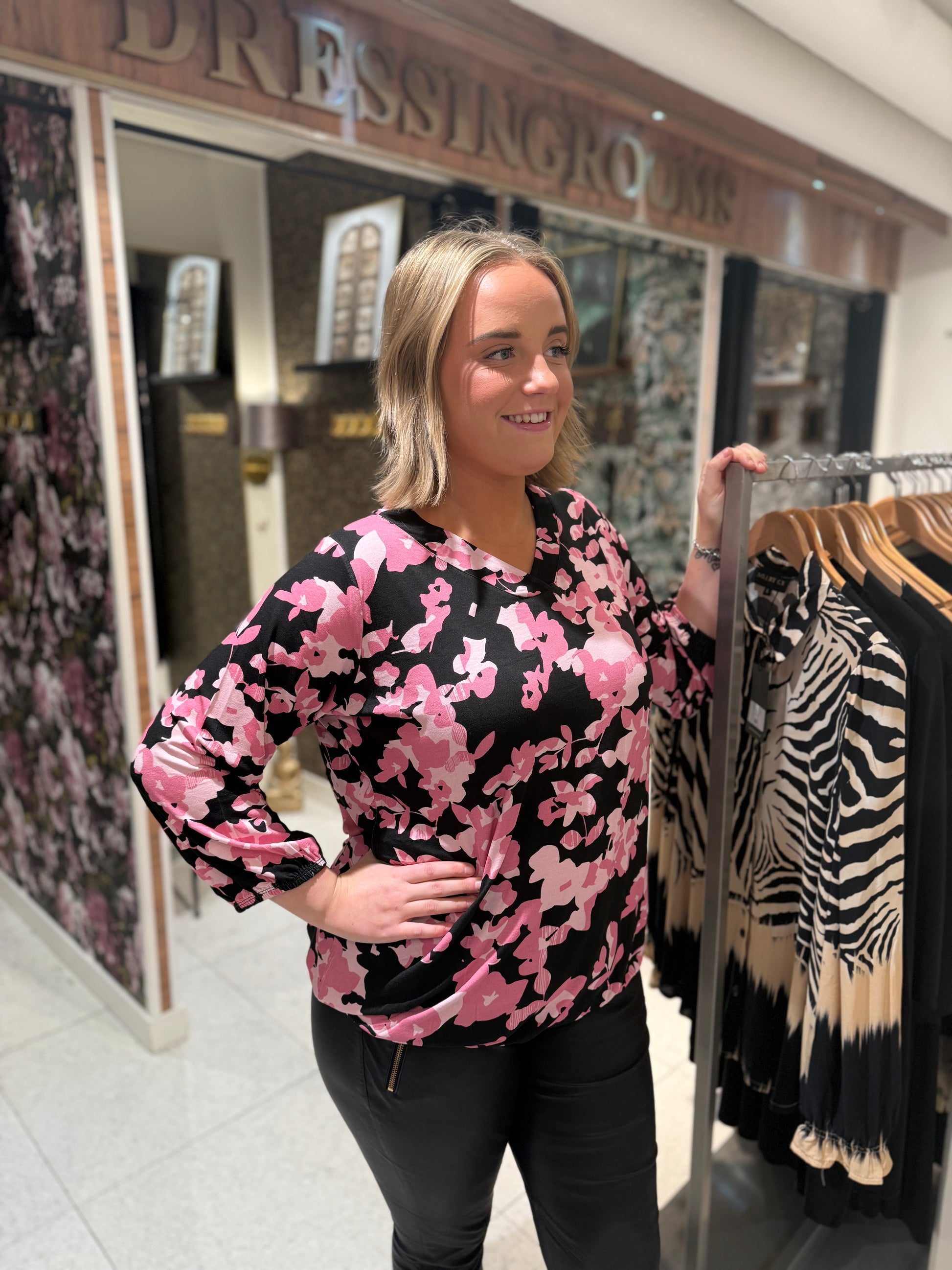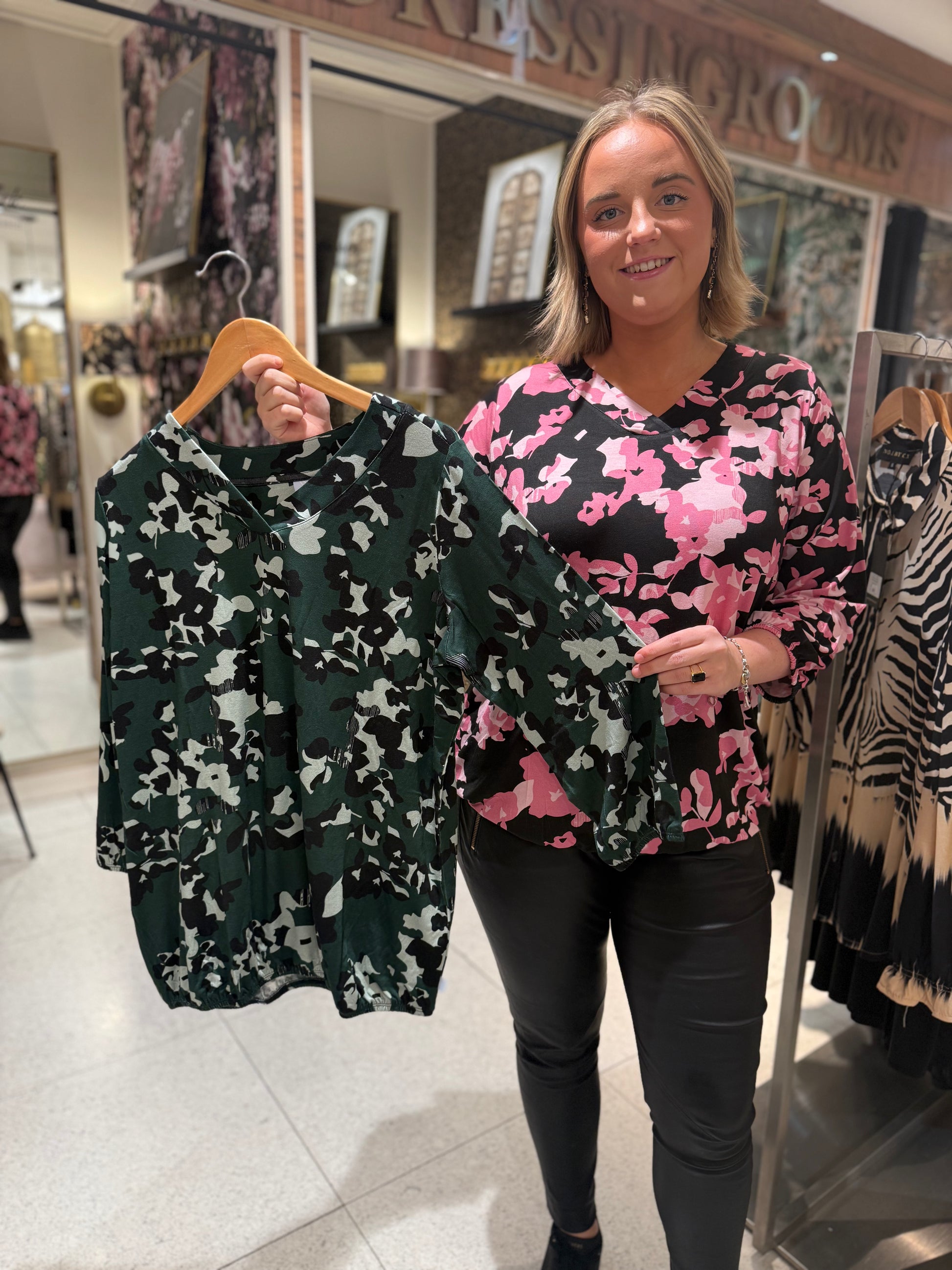 Den klassiska toppen med resåravslut har kommit tillbaka i ett nytt härligt print, det är v-ringad hals med 3/4 dels ärmar. Resåravslut på ärmen och slutet av tröjan.