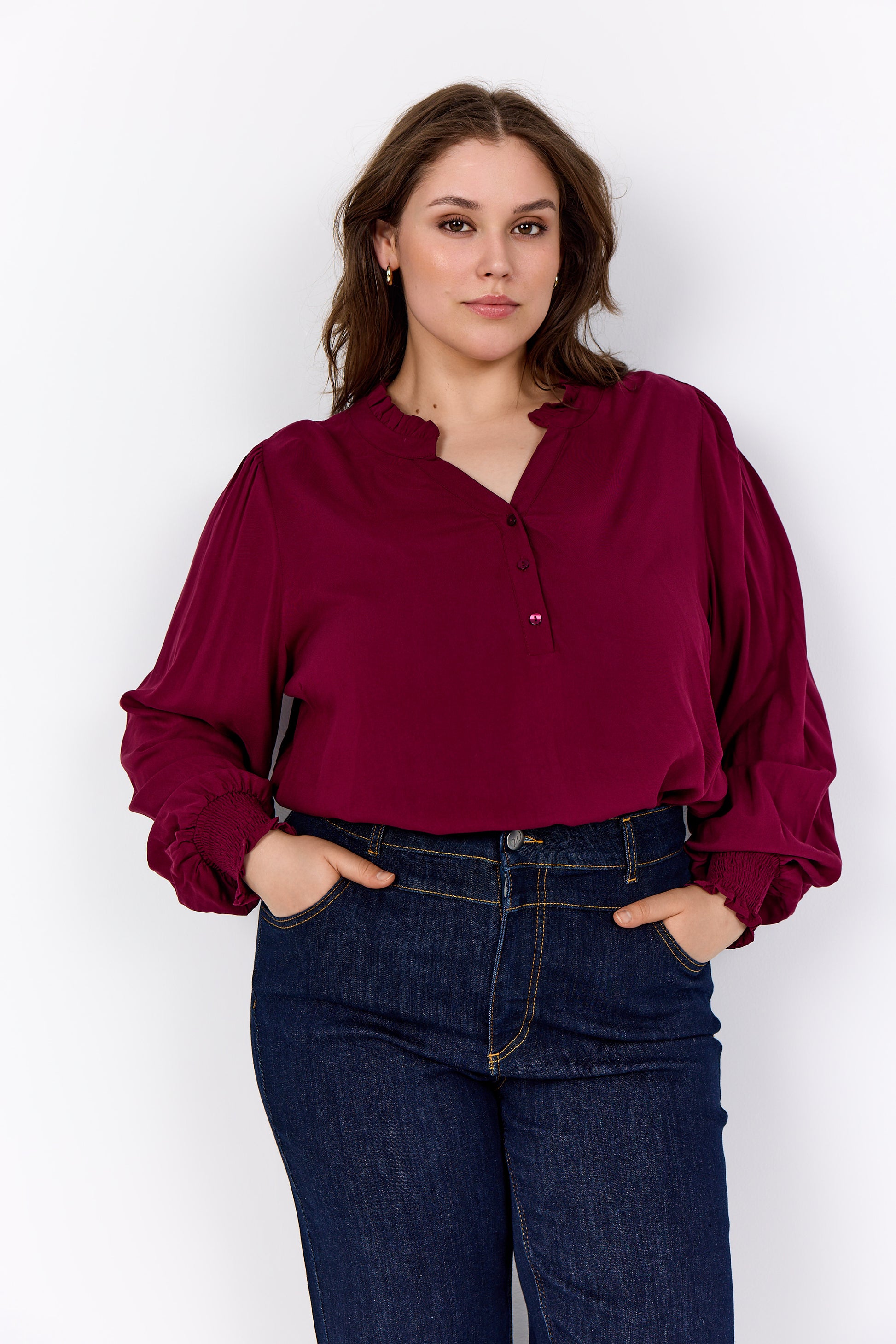 Den har en rund v-ringad hals med fina veckdetaljer, knappslå framtill och långa ärmar med rynkade muddar. Kombinera den med ett par kostymbyxor eller med jeans för en avslappnad look