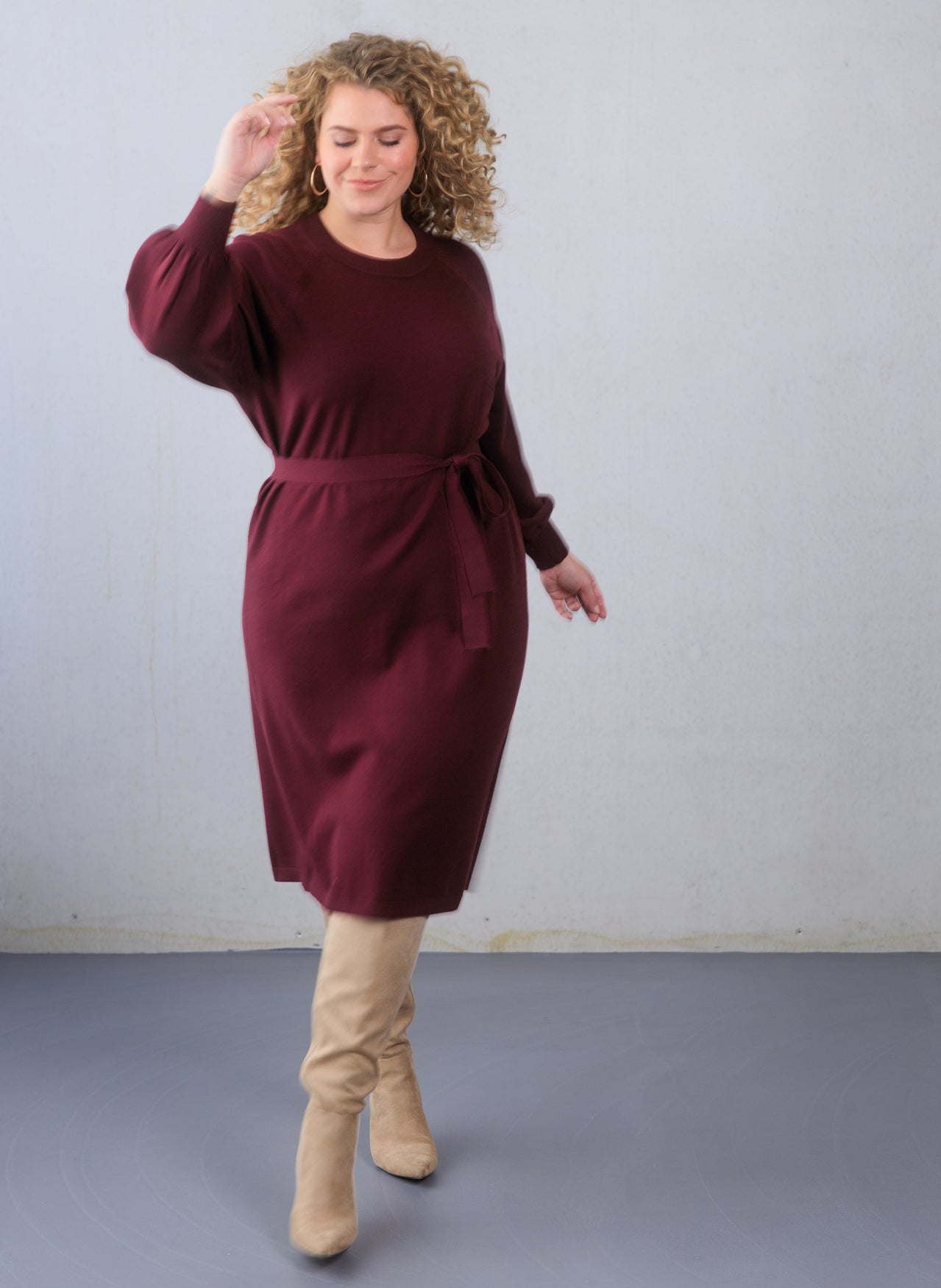 En skön stickad klänning med rundad hals och långa ärmar, det ingår ett bälte som du kan markera midjan med, styla den denna klänning med ett par höga stövlar och strumpbyxor.