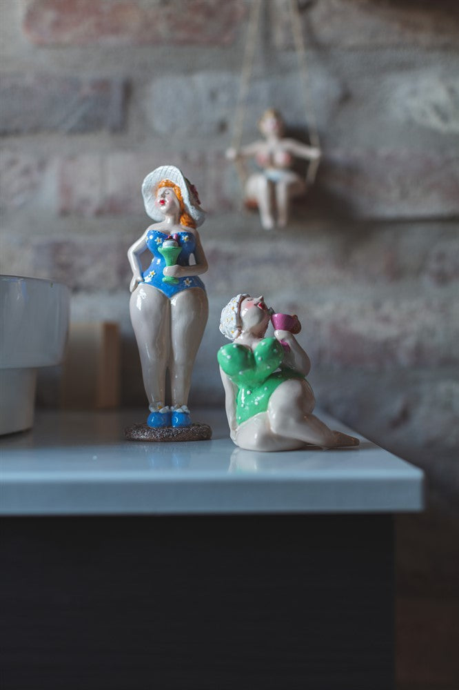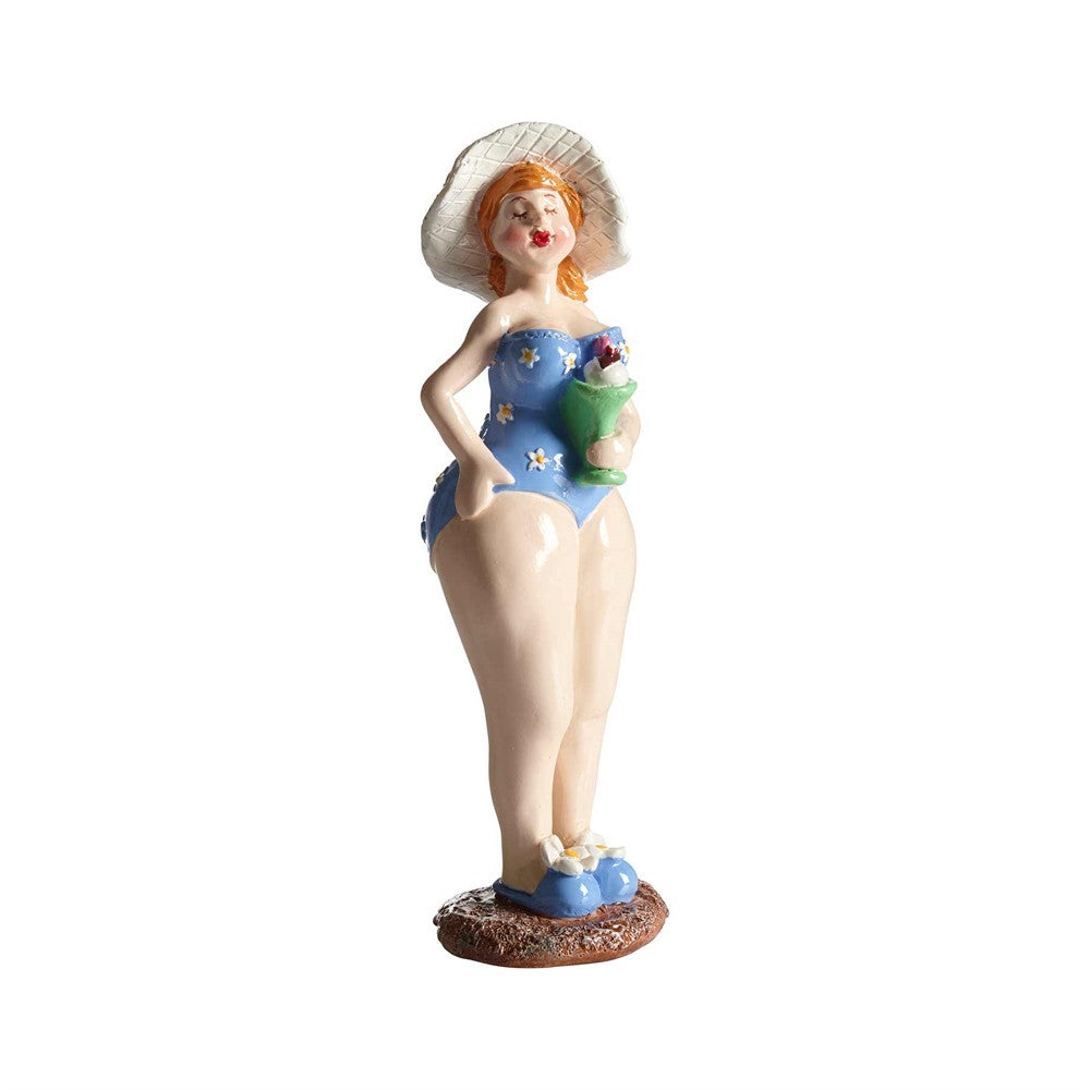 Härlig ståtligt kurvig kvinna i en blå blommig badräck med en solhatt.