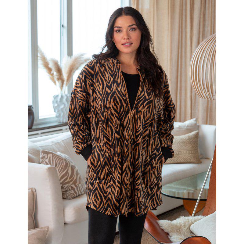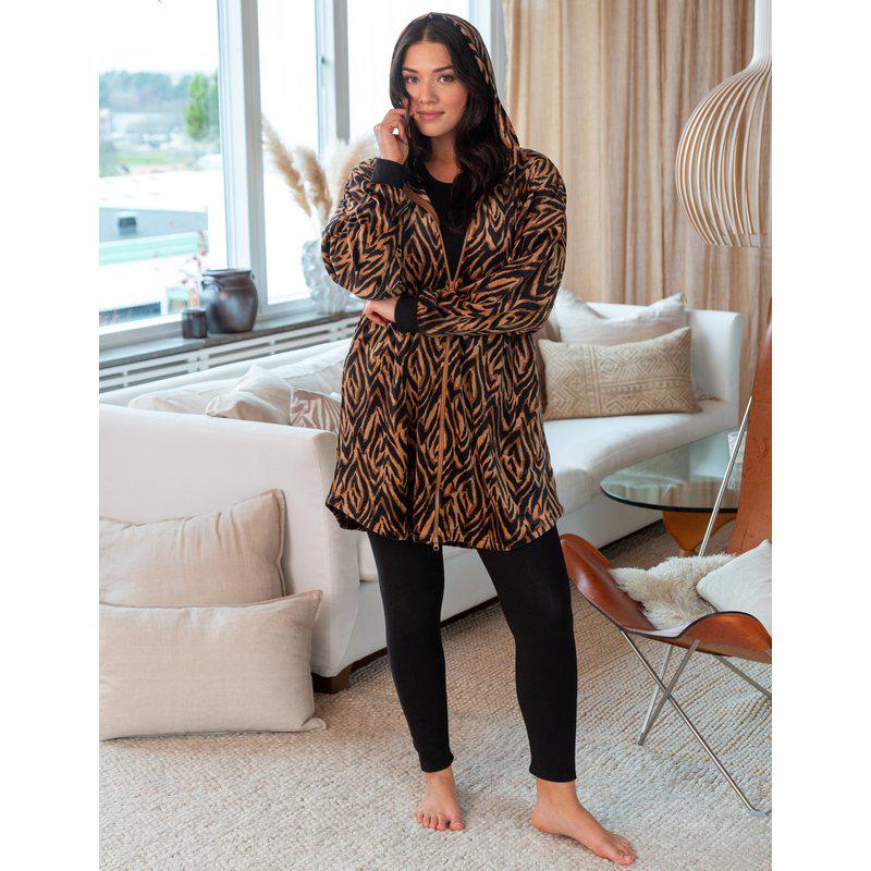 Mysig kofta med zebra mönster och en luva samt fickor på sidorna.